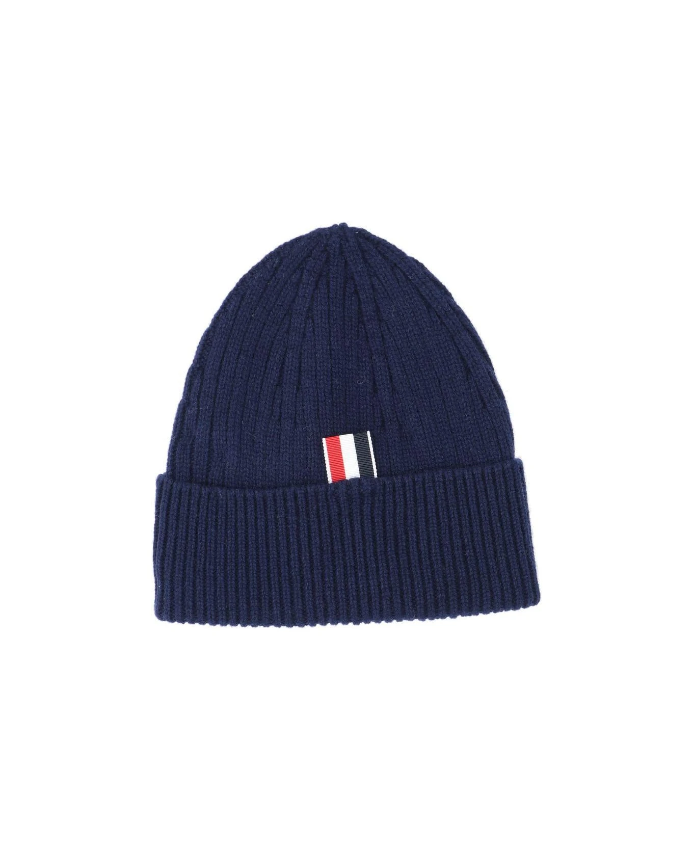 Thom Browne ‘4-Bars’ Beanie, cashmere, blue, four iconic white stripes on fold, tricolour grosgrain label on back.