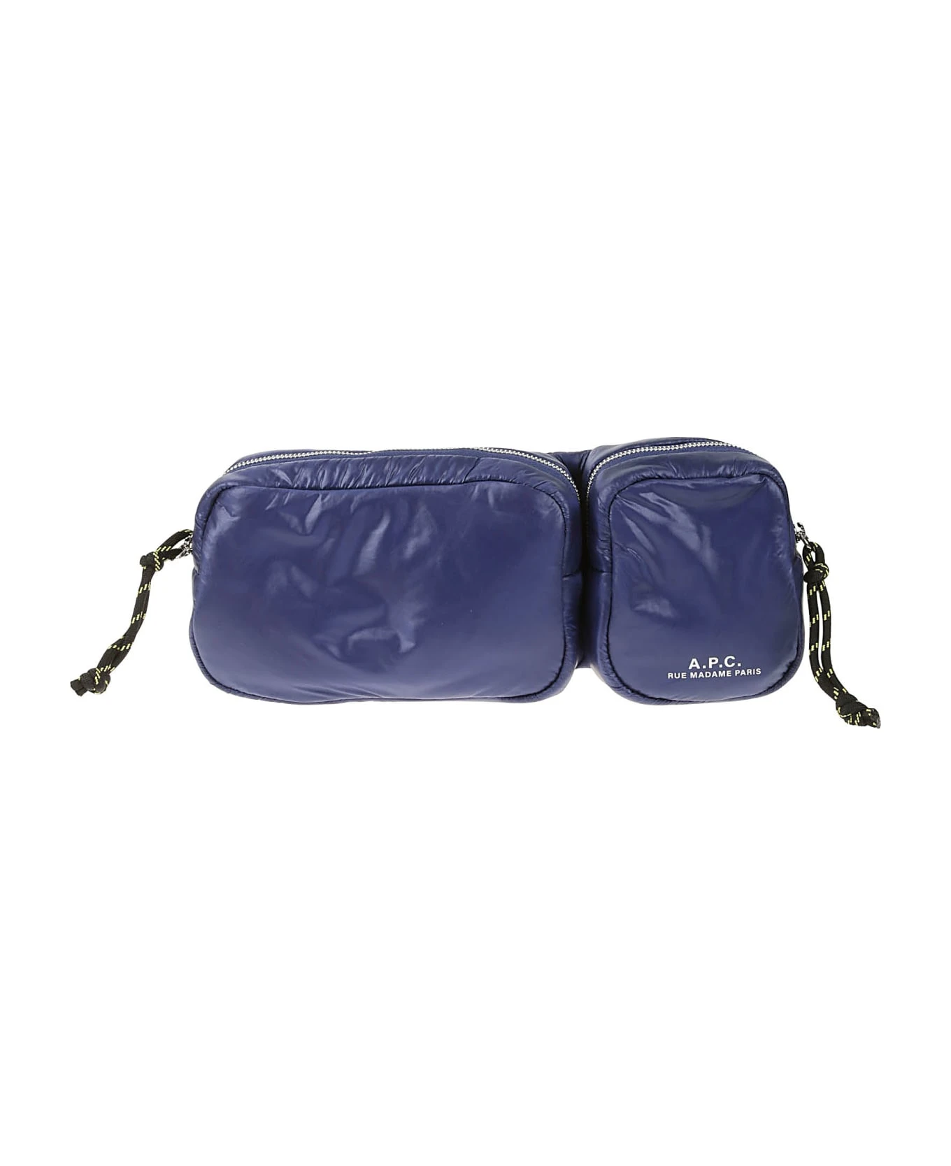 A. P. C. nylon fanny pack with zip closure, logo printed on the front, adjustable shoulder strap.