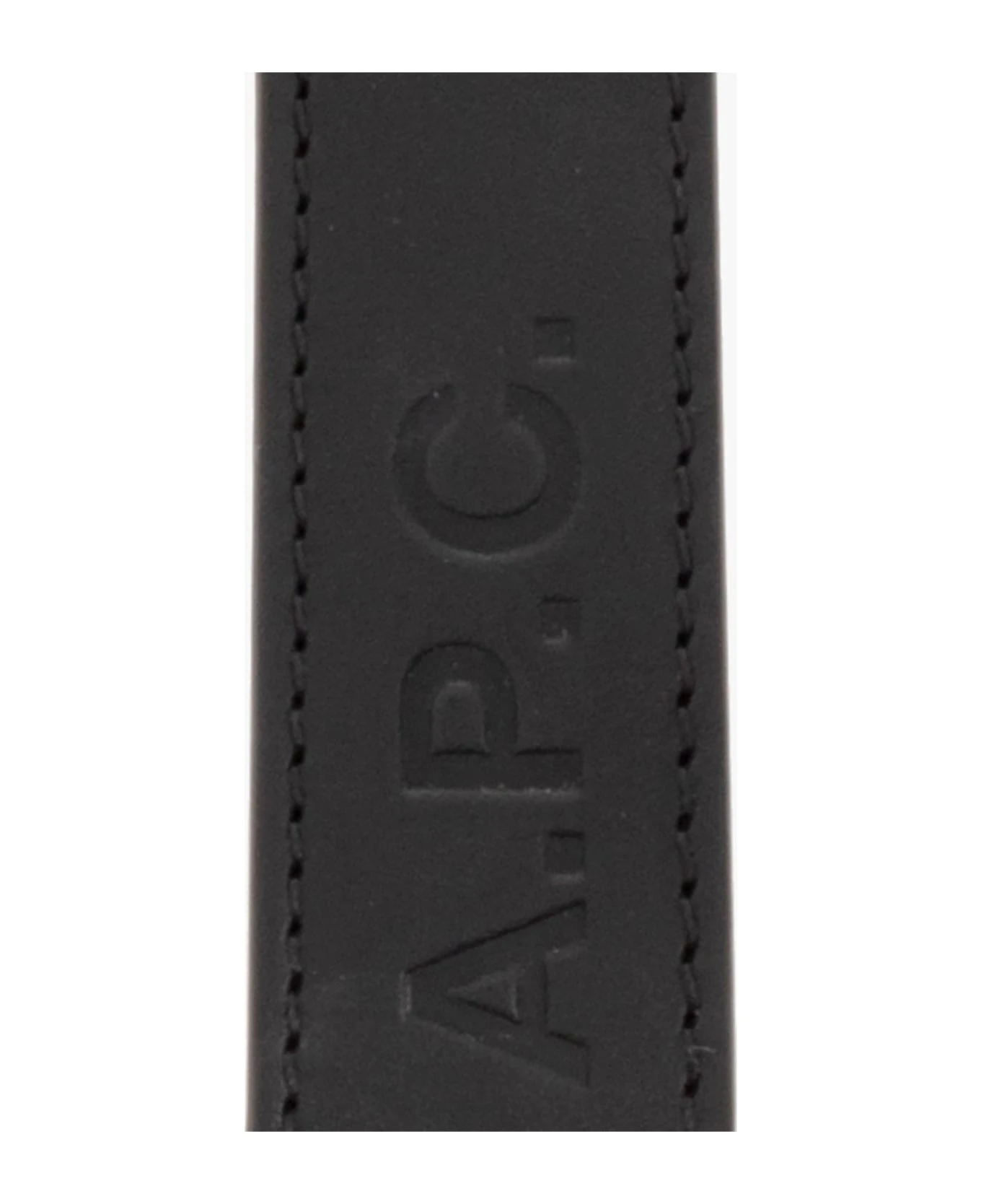 Black keyring from A. P. C. Arriving with a leather band with an embossed logo, this item features a silver-tone snap hook clasp.