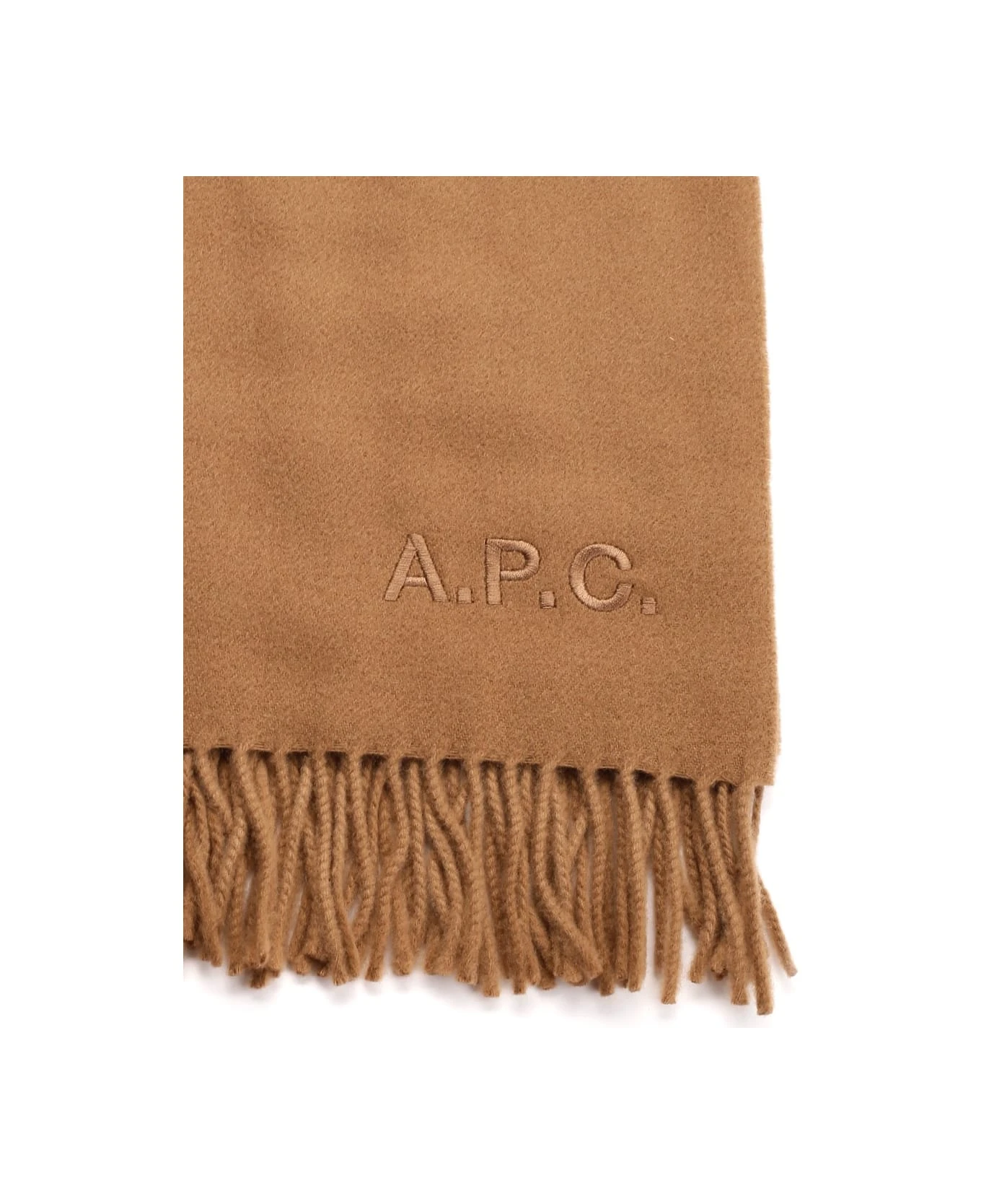 Camel “Alix Brodée” scarf from A. P. C. in wool, fringes at the ends, embroidered logo.