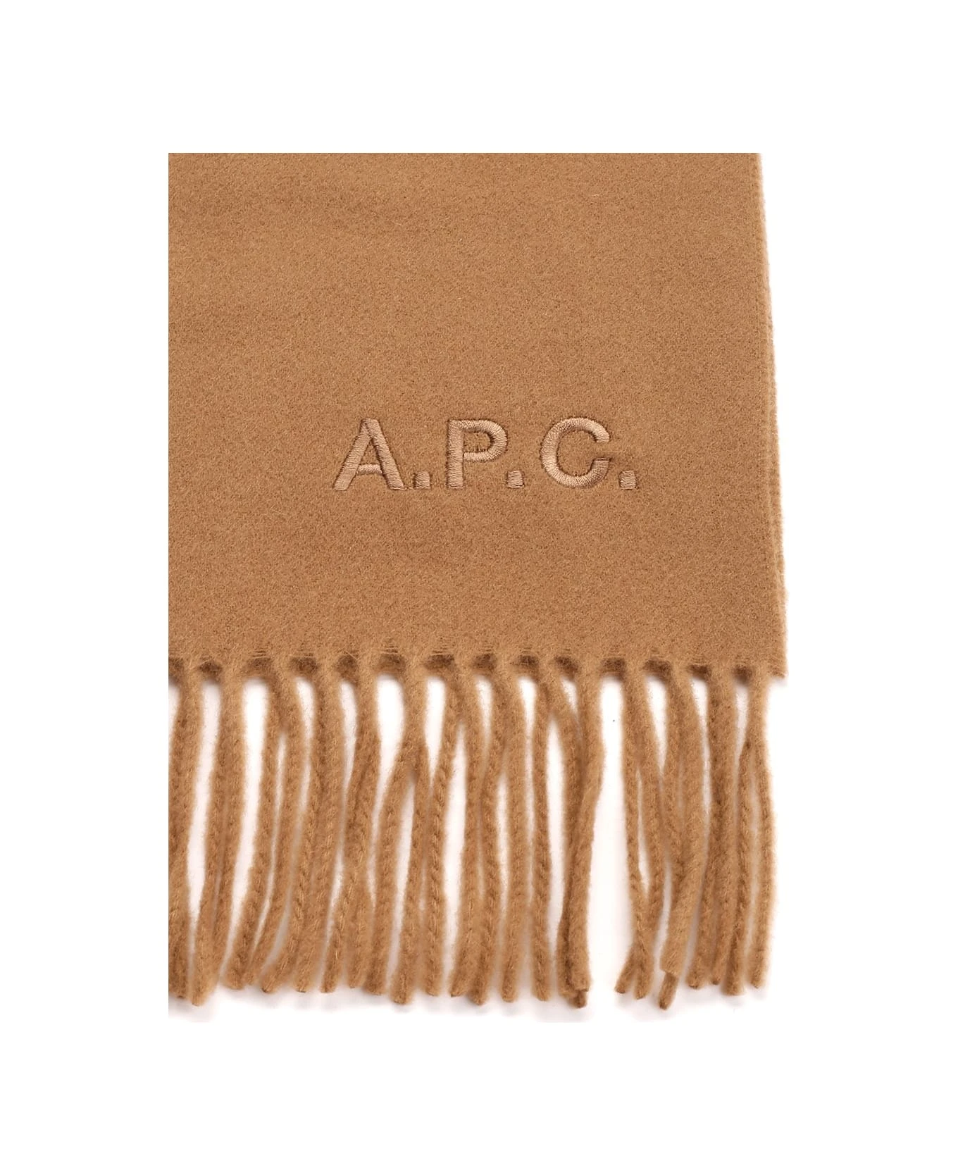 Camel “Ambroise Brodée” scarf from A. P. C. in wool, fringes at the ends, embroidered logo.