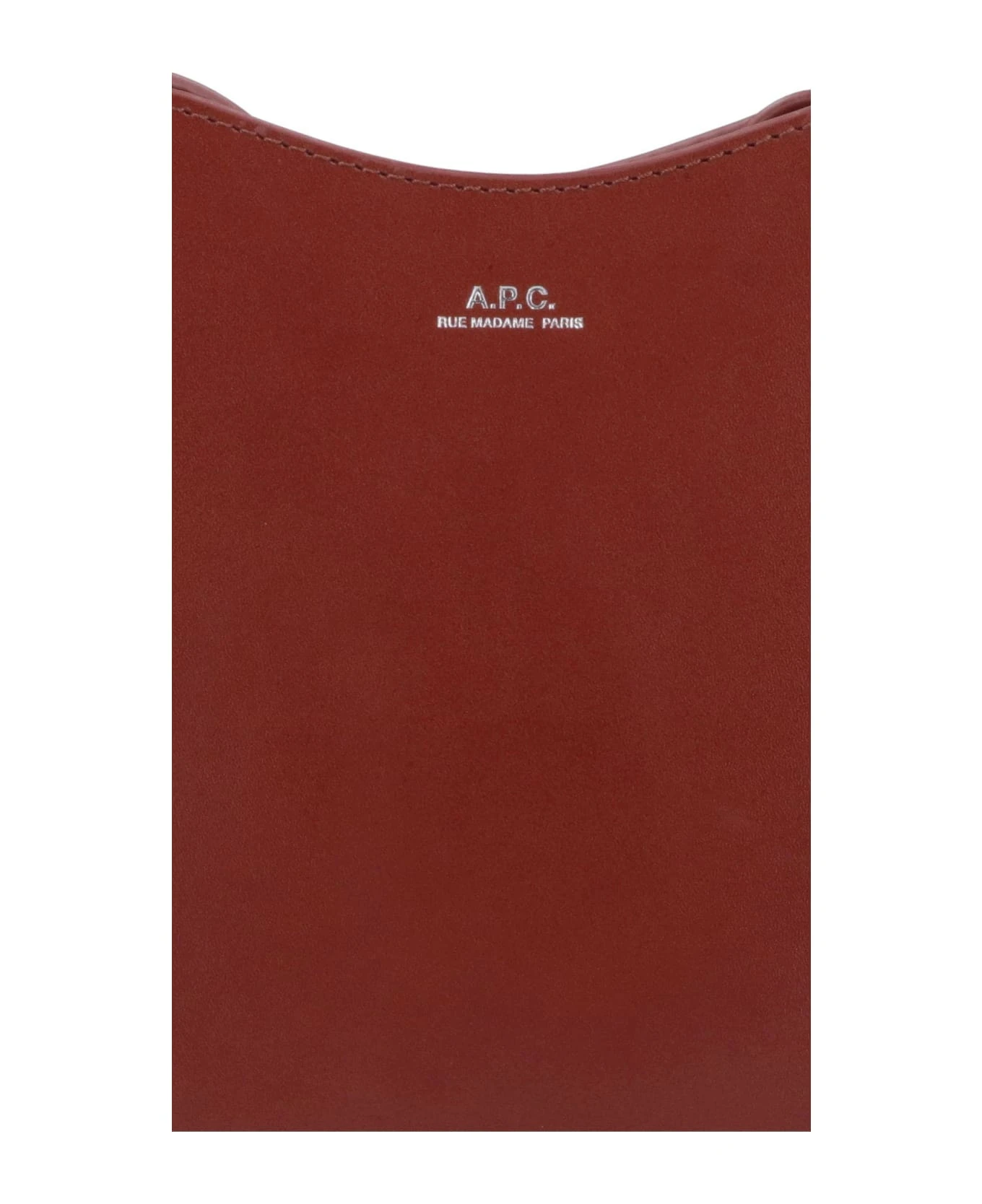 A. P. C. ‘Jamie’ Shoulder Bag, leather, brown colour, adjustable shoulder strap, engraved logo on the front, one internal compartment, four internal card slots.