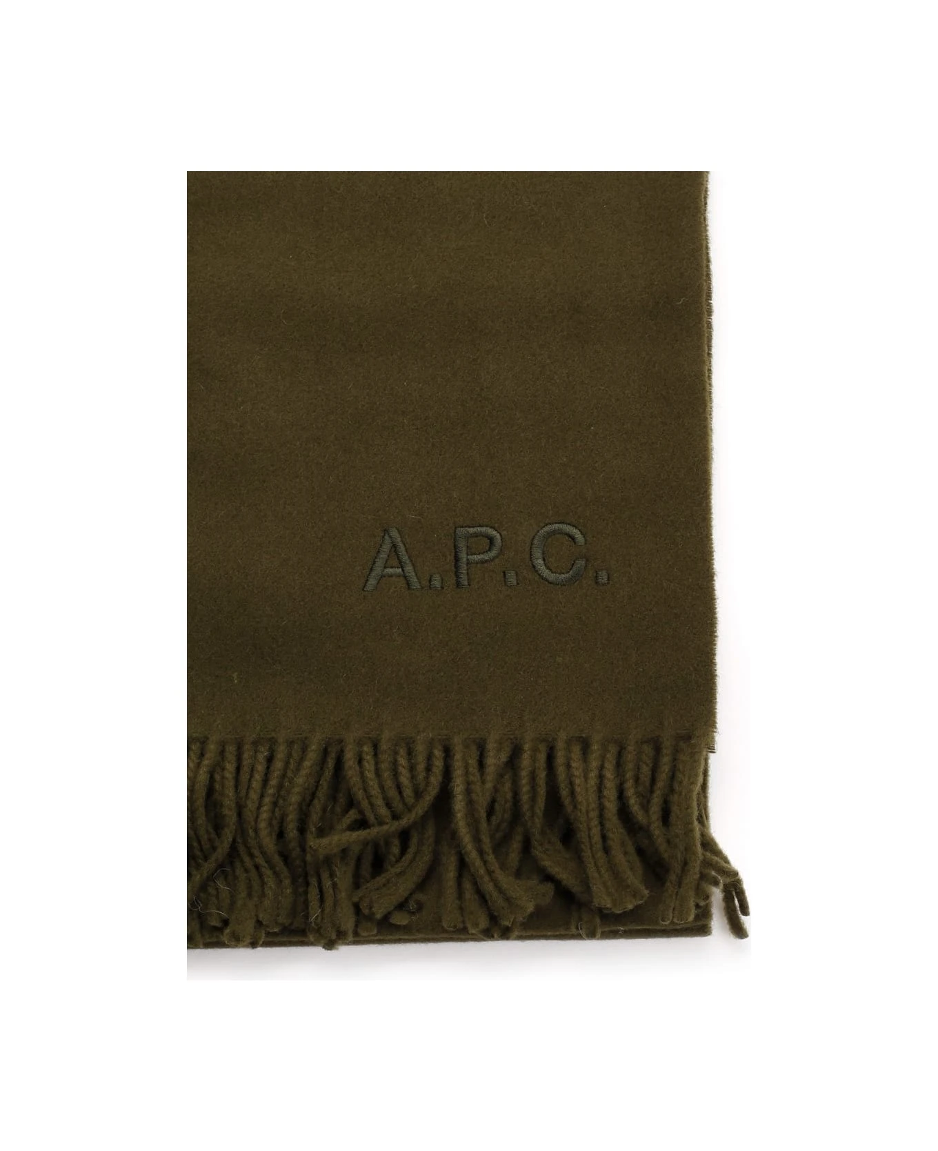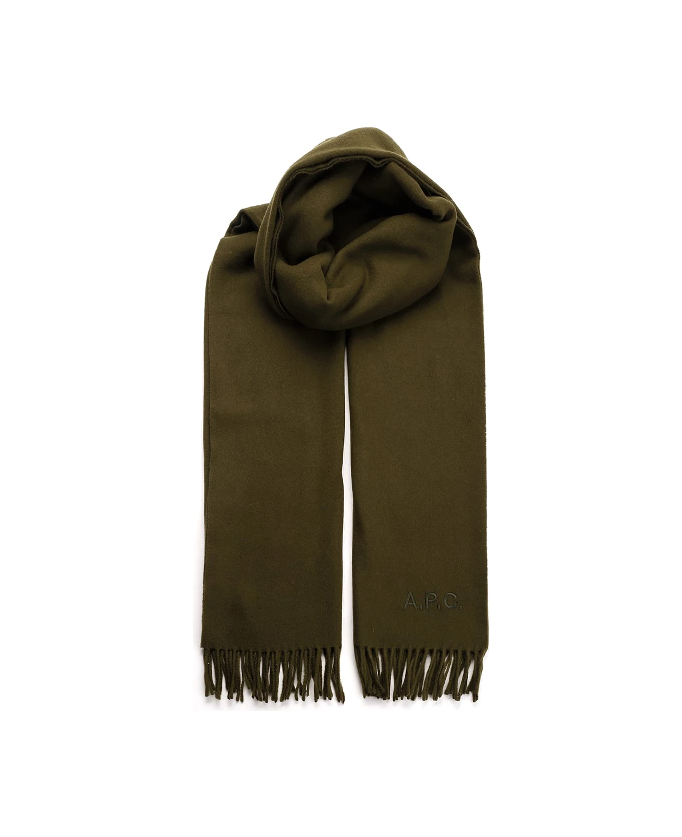 Khaki “Alix Brodée” scarf from A. P. C. in wool, fringes at the ends, embroidered logo.