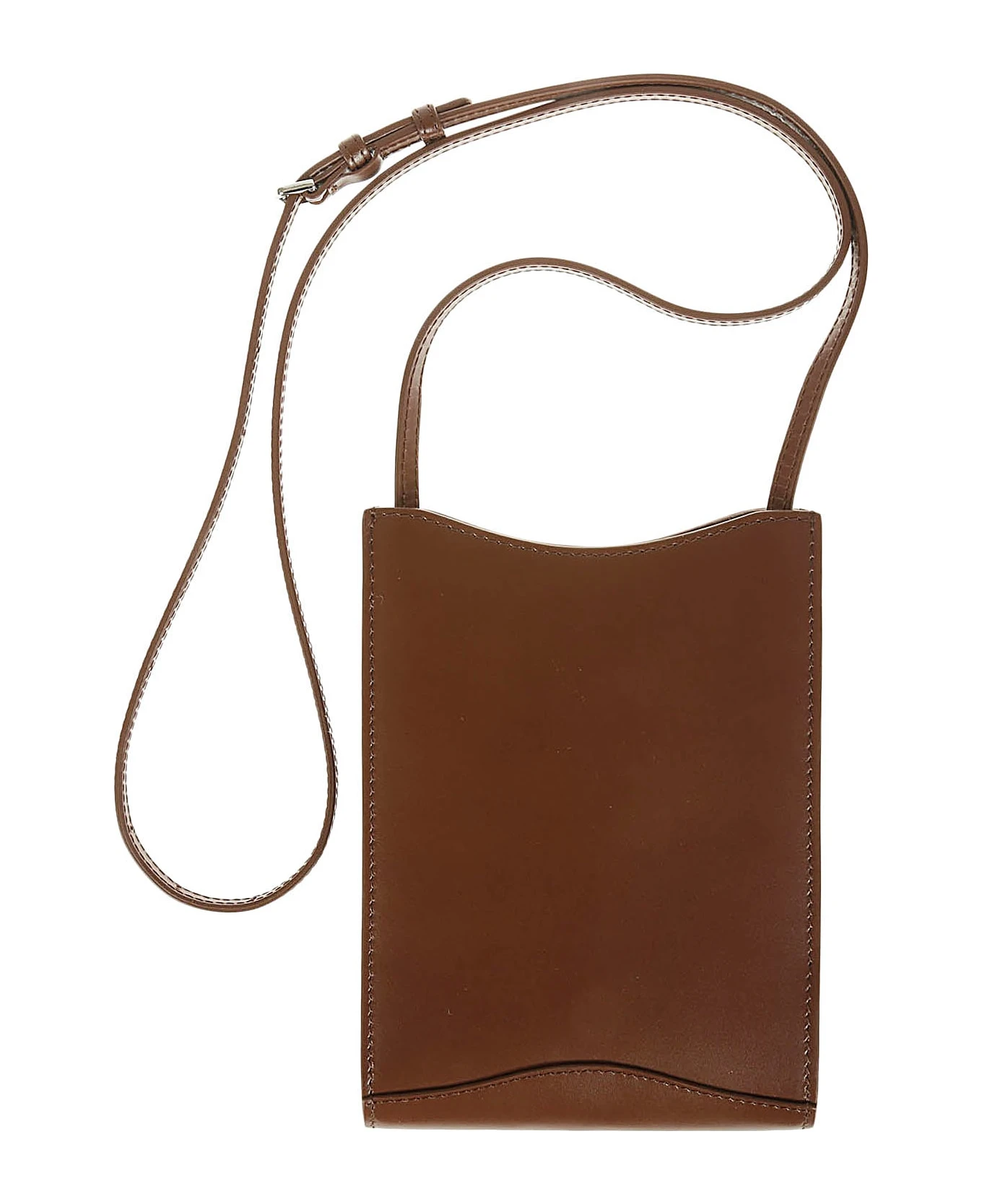 A. P. C. Brown leather shoulder strap, logo detail, four card slots inside, adjustable leather strap.