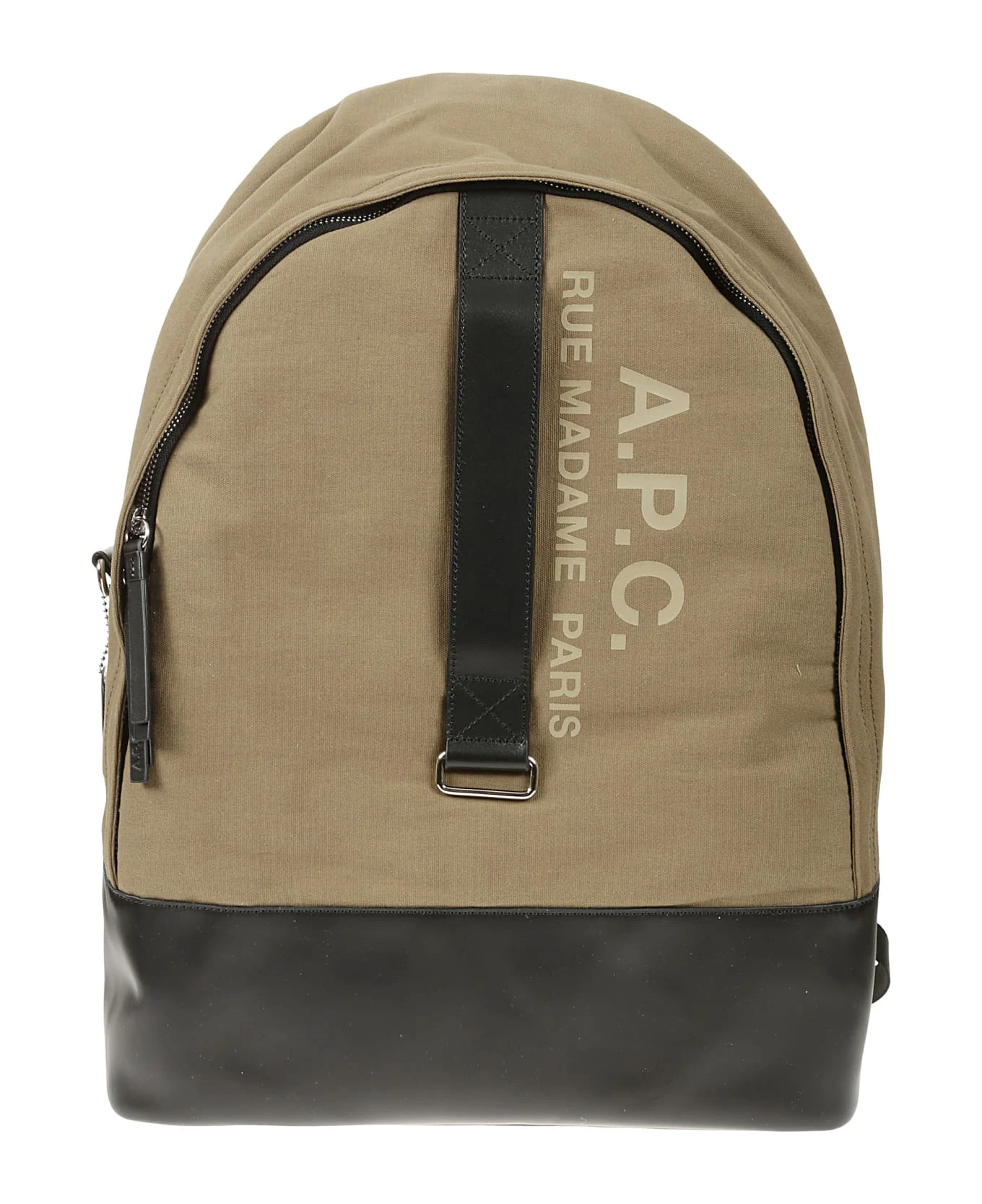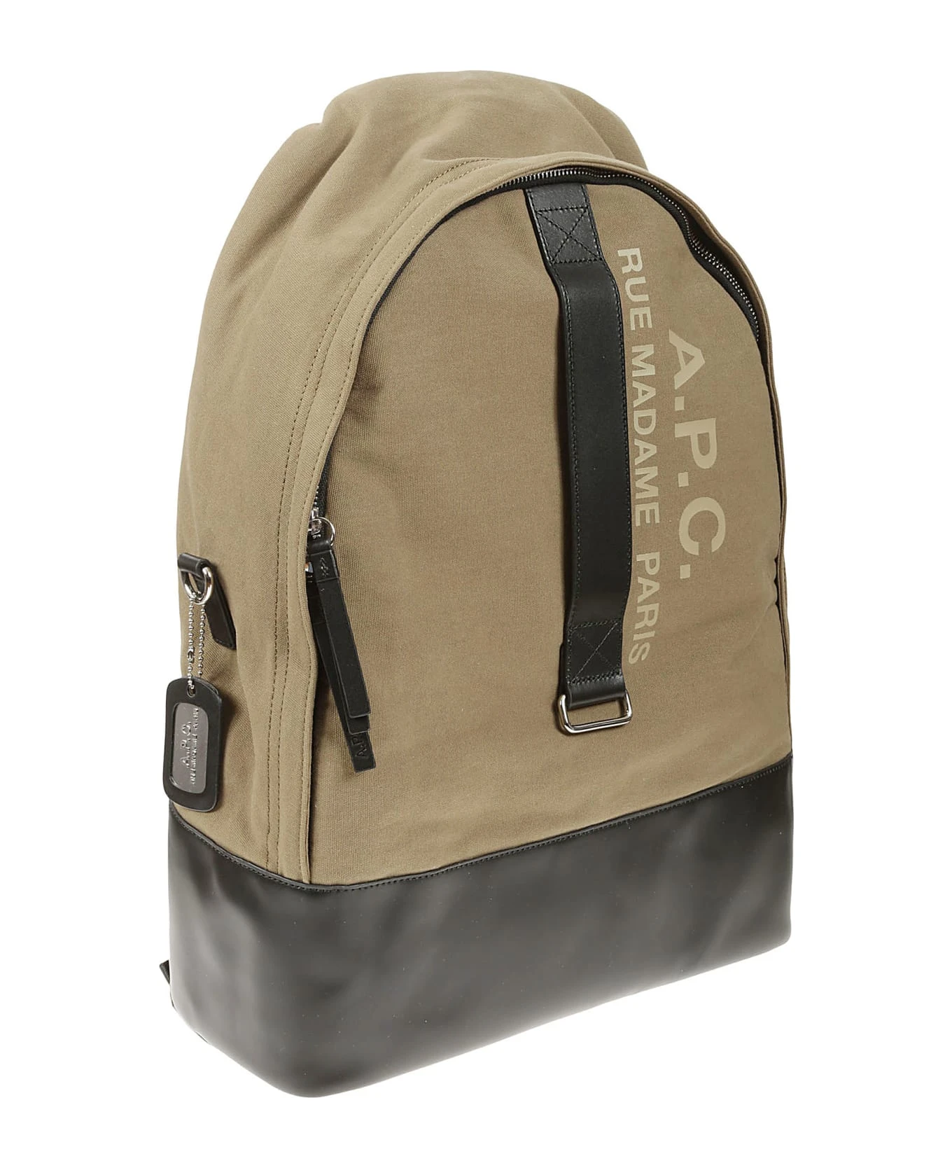 A. P. C. Cotton backpack, zip closure, internal pockets, padded shoulder straps, leather base, logo detail.