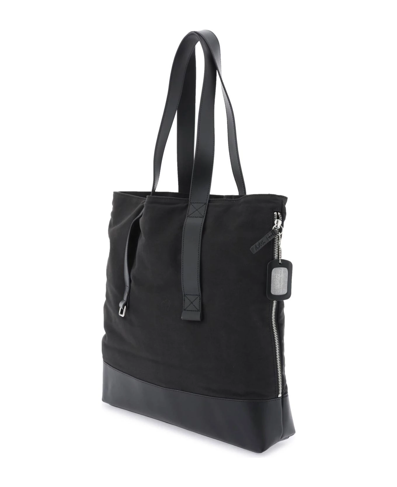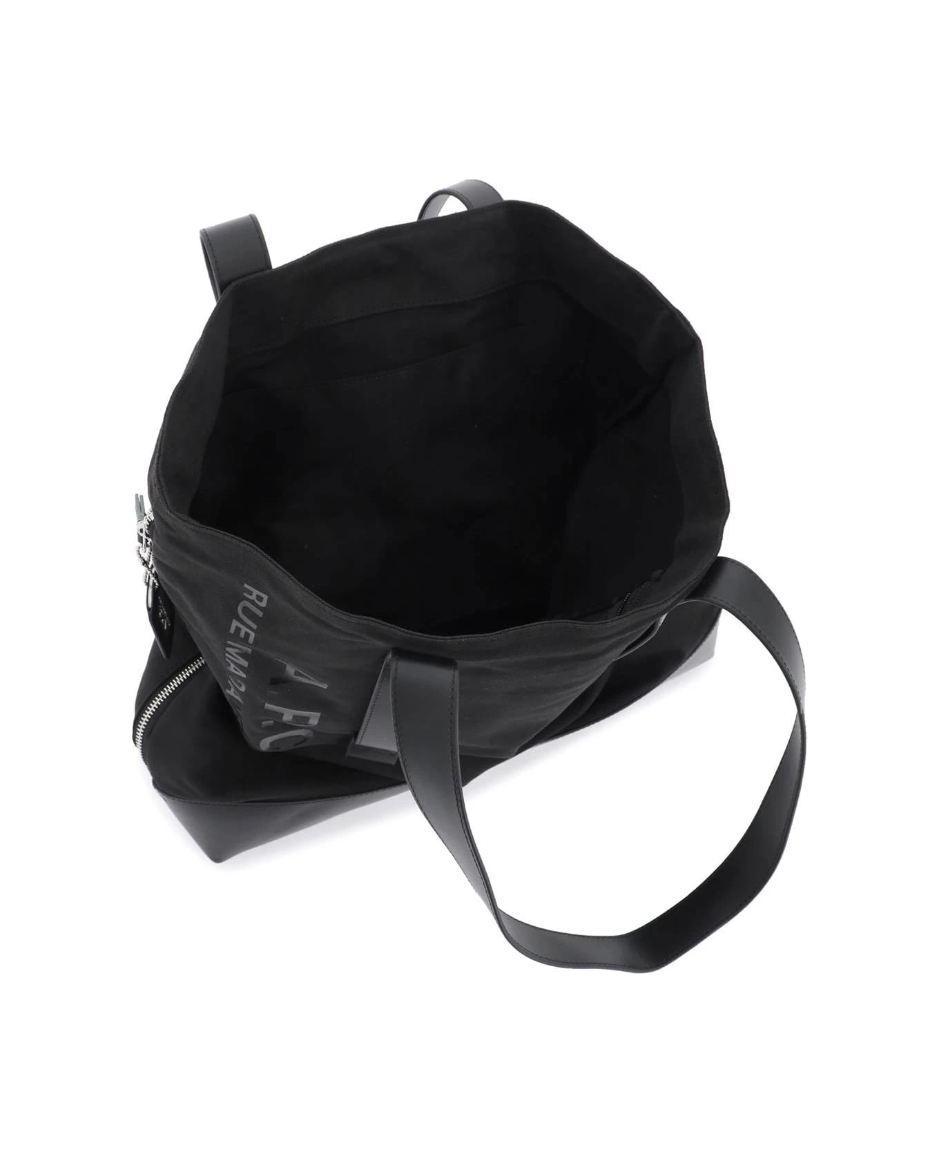A. P. C. tote bag crafted in cotton canvas and characterized by front lettering logo print. Lined-interior with one open pocket and a zippered mesh one, side zippered pocket. It features leather double top handle and hem.
