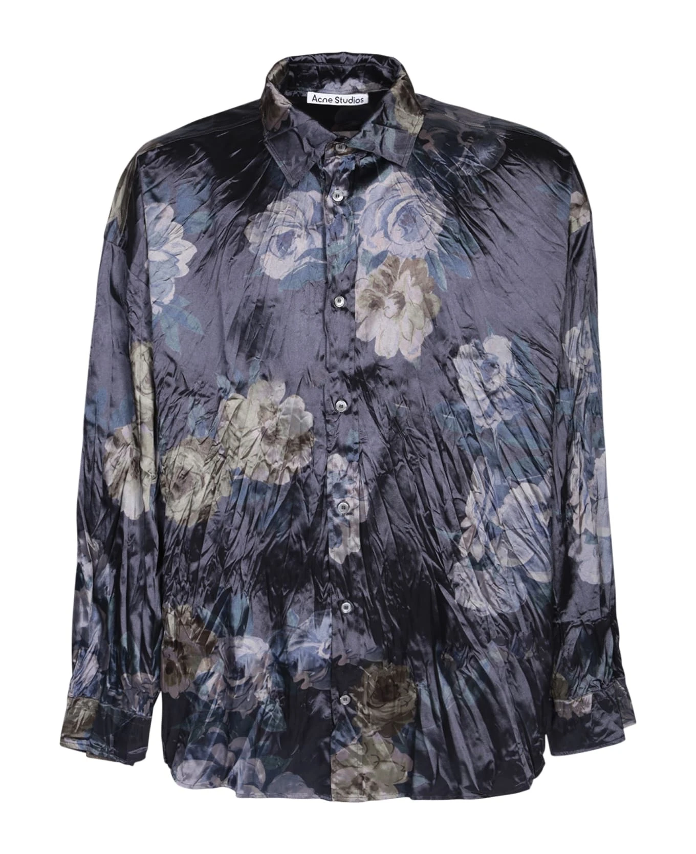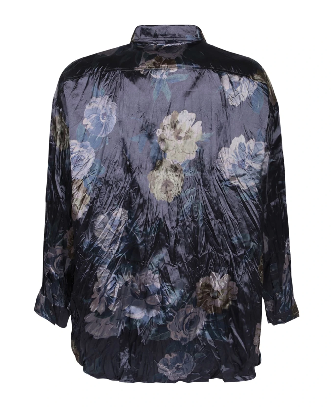 Straight-point collar. Long sleeves. All-over floral print. Front button fastening. Curved hem. Color: blue