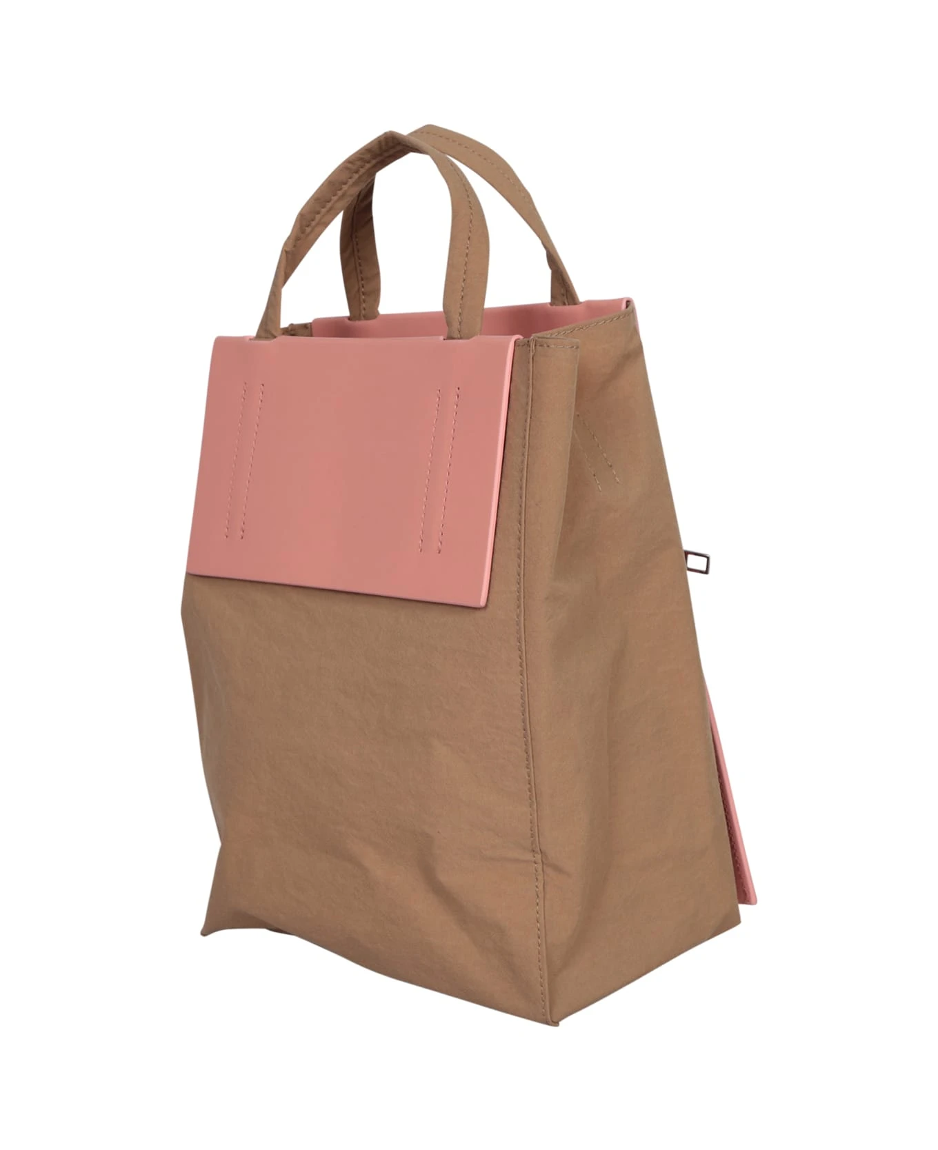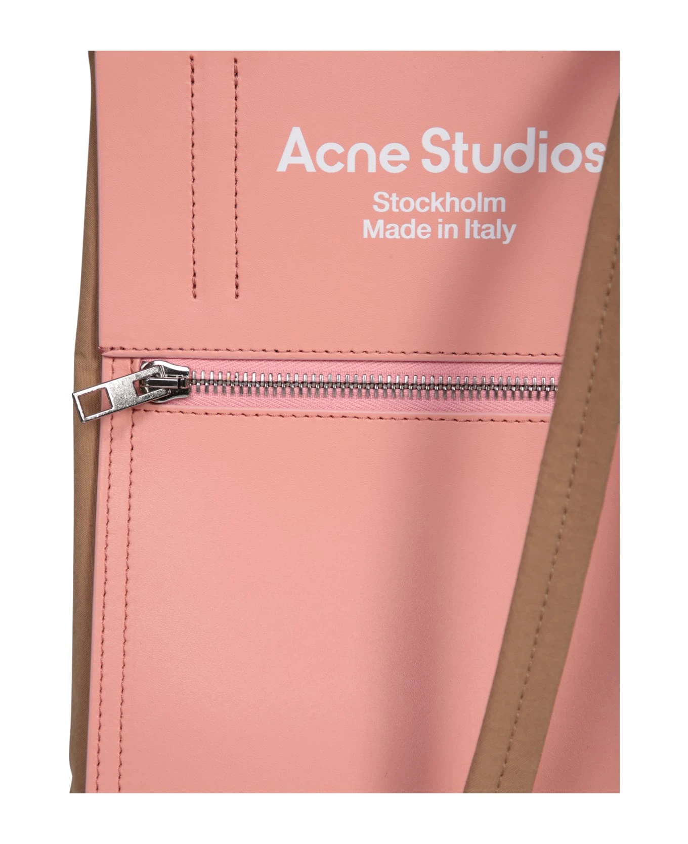 Two rounded top handles. Logo print to the front. Open top. Leather strap. Front zip-fastening compartment. Color: Pink/ Beige