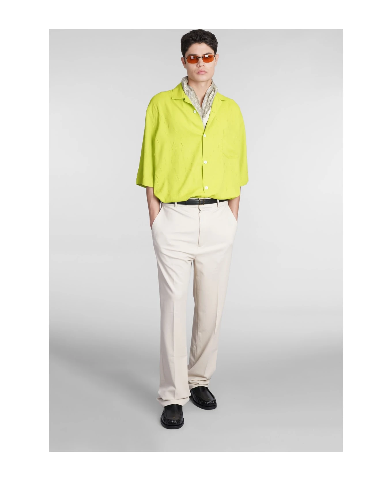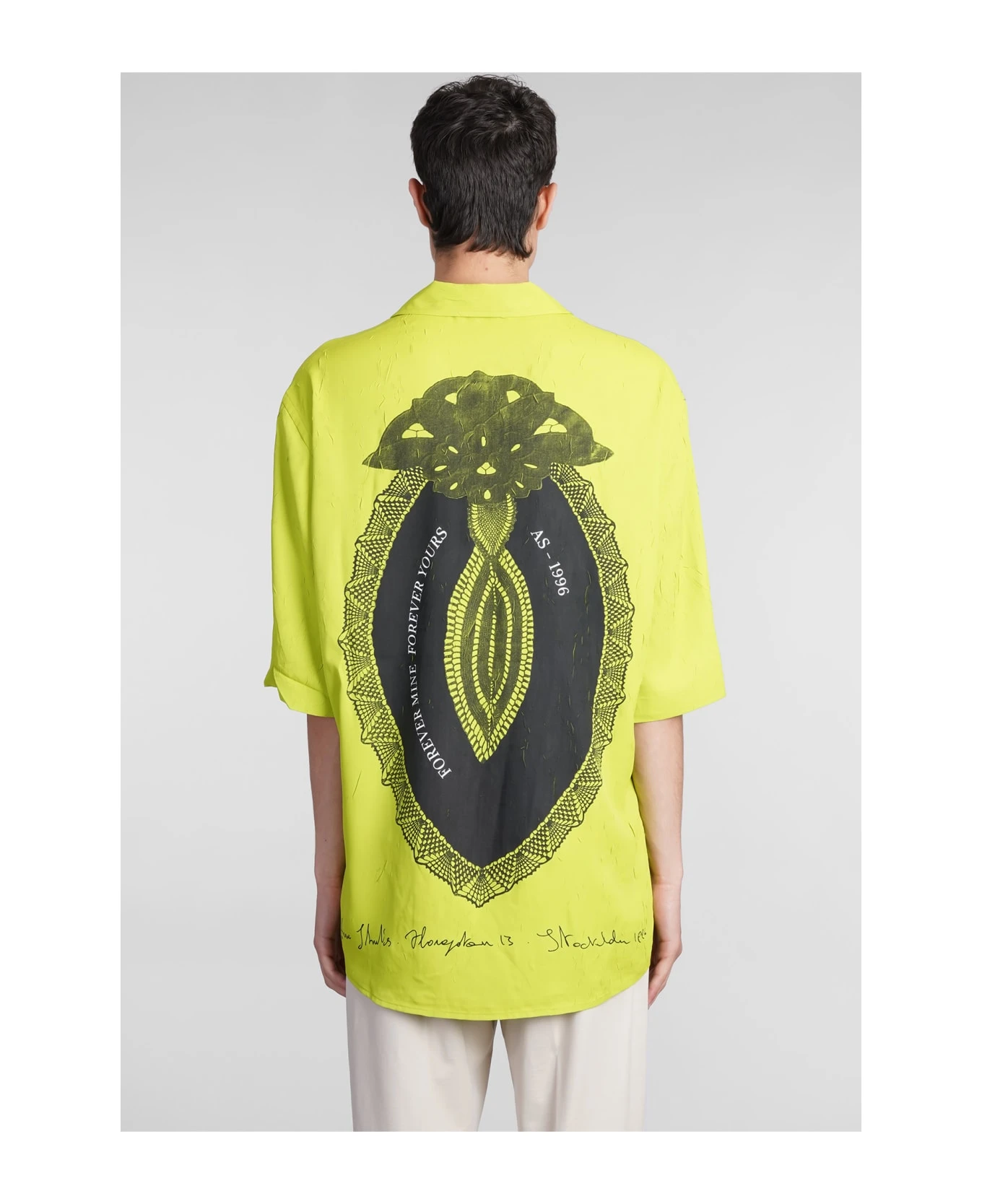 Shirt in green polyester, bowling neck, long sleeves, oversized fit, back print, 100% polyester, Made in China, Model is 1. 83 and wears size 46