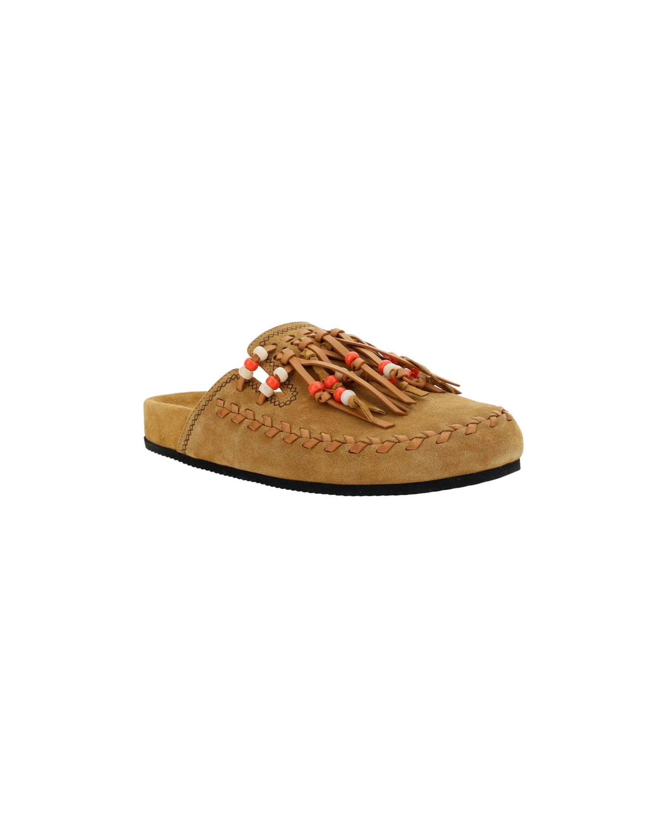 Calfskin montain mulet by alanui, slip-on model, suede design, contrasting beaded tassels applied to the basin, press studded insole.