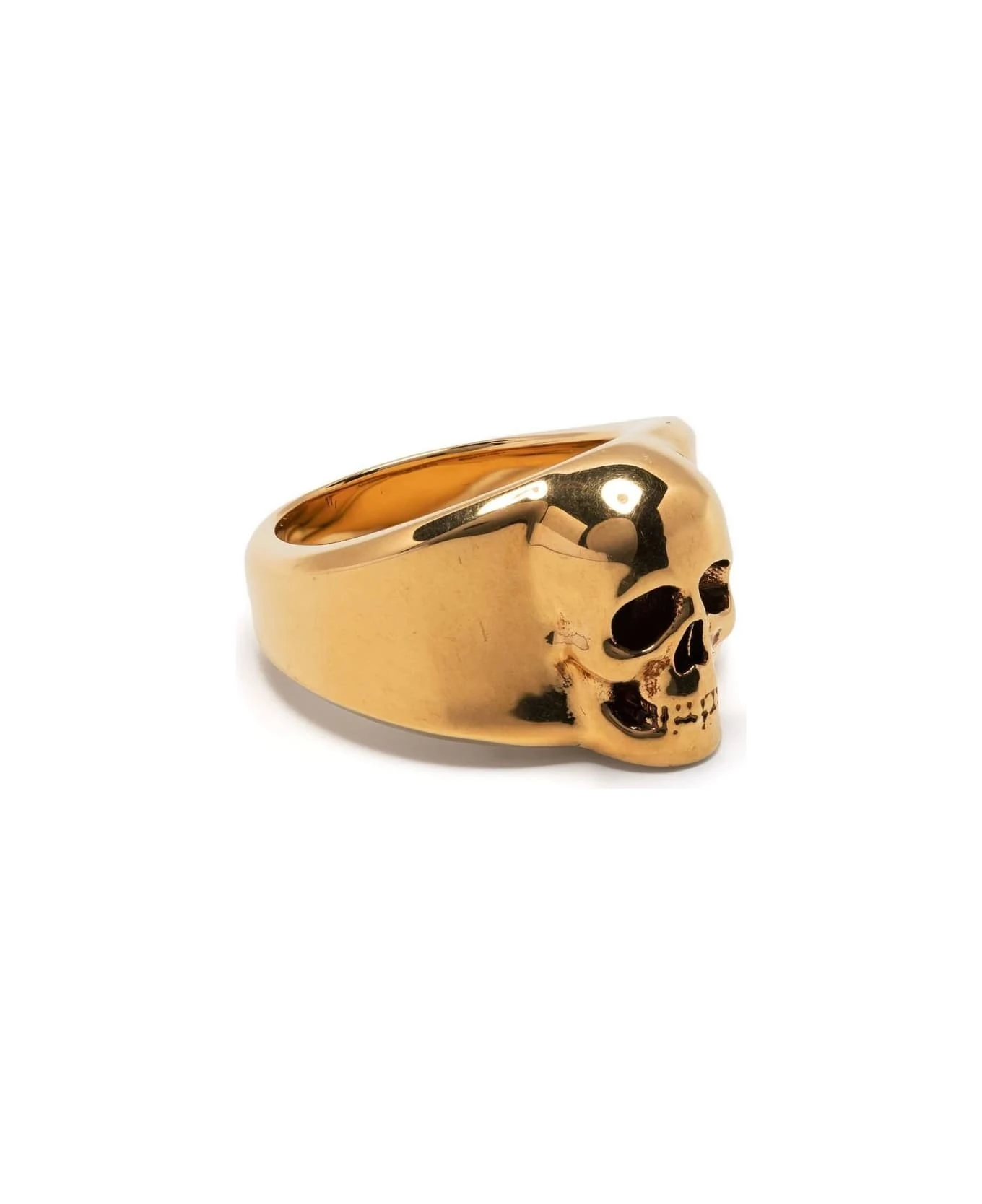 Skull signet ring for men by Alexander McQueen made of brass with antique gold finish. Dimensions: 1. 6 x 2. 4 cm.