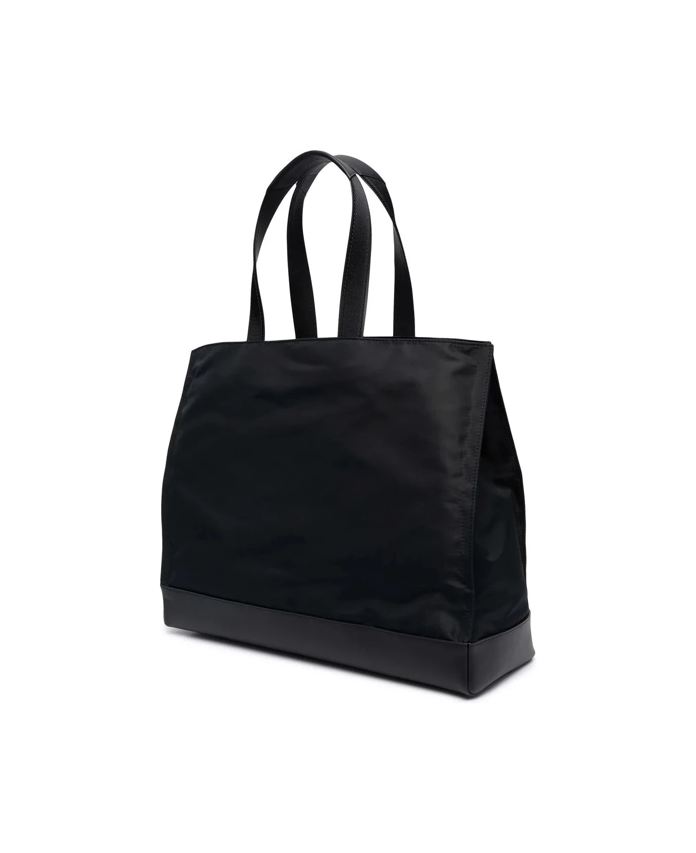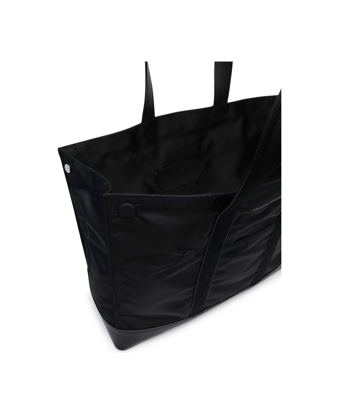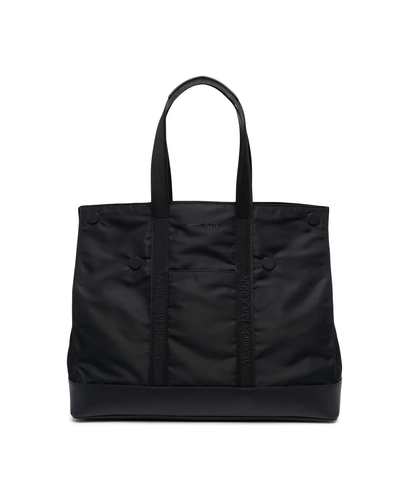 De Manta tote bag for men by Alexander McQueen made of black nylon and featuring a black leather bottom, an interior flat pocket, a front slit pocket, magnetic buttons that allow the corners to be folded over, two top handles made of logo-printed canvas, and a printed Alexander McQueen logo on the front.