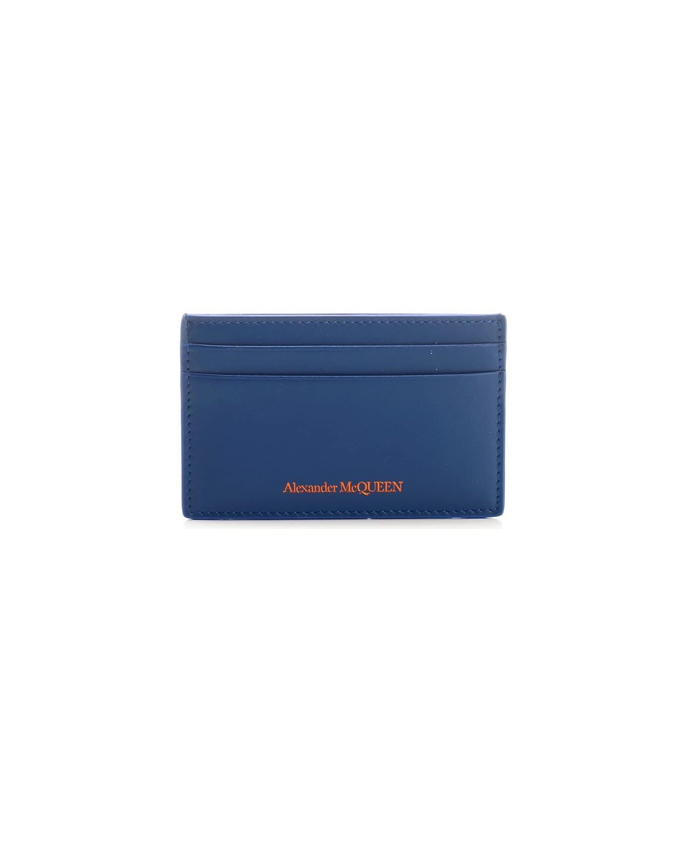 Light blue leather card holder by Alexander McQueen with card slots and orange embroidered logo.