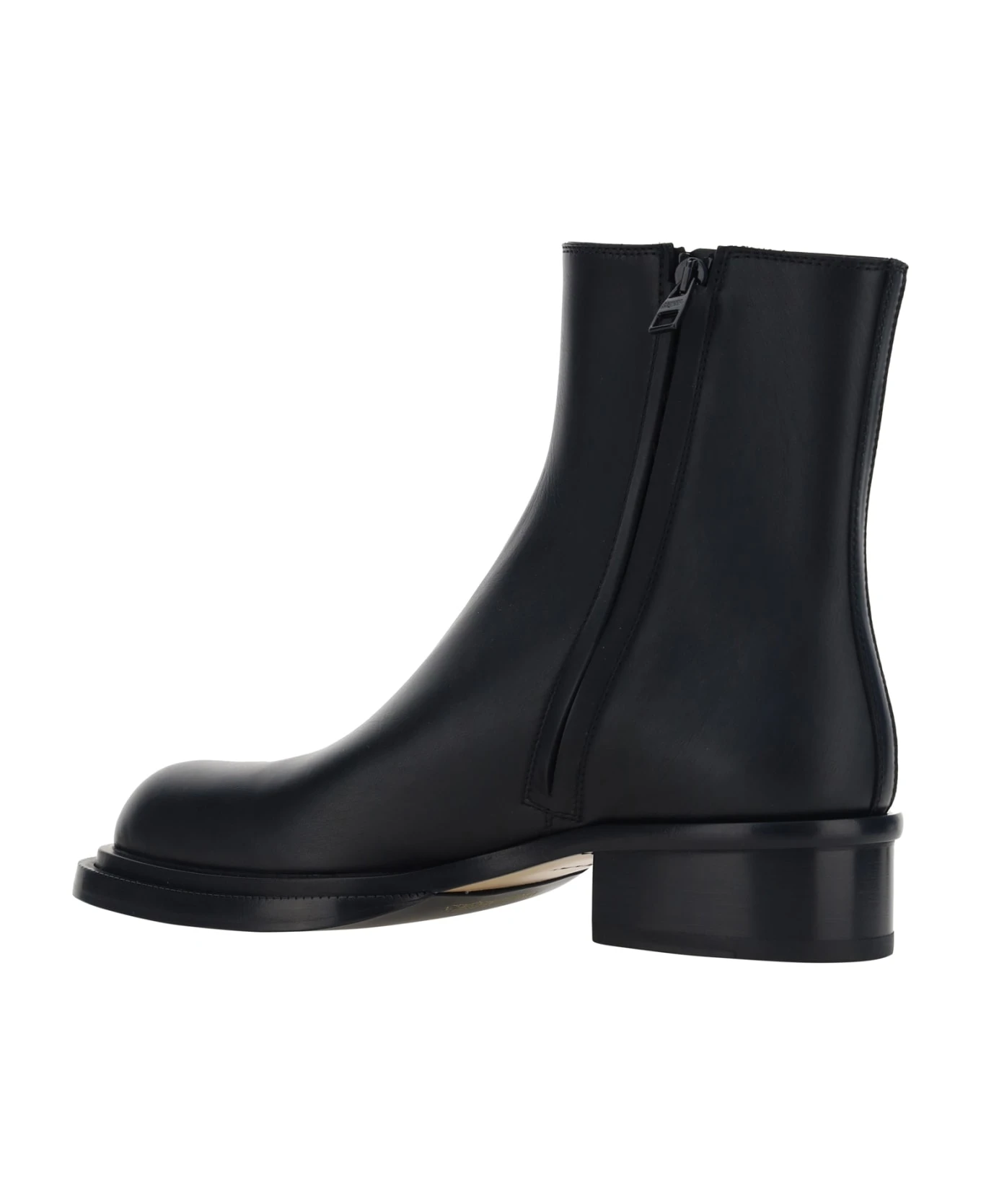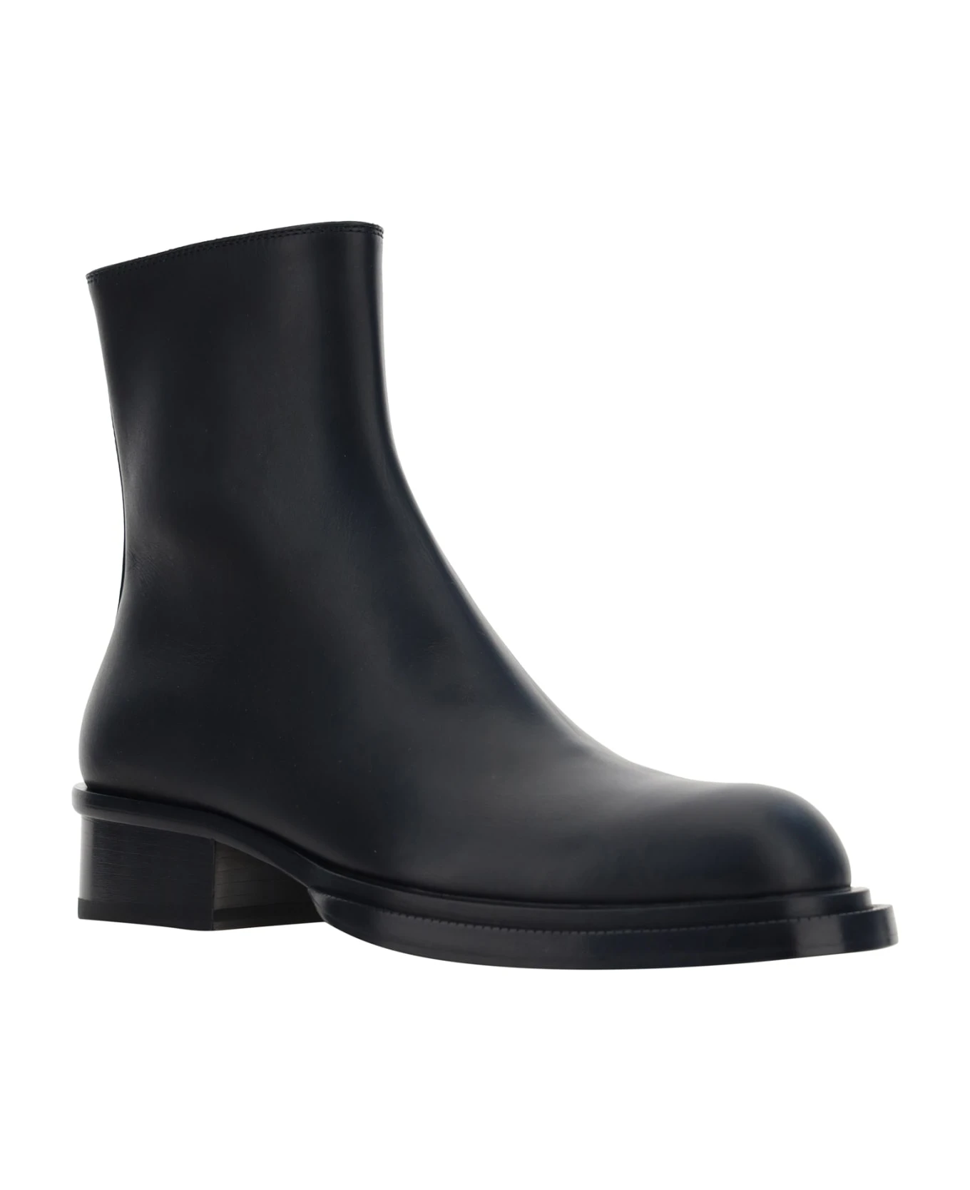 Calfskin cuban stack ankle boots by alexander mcqueen, beveled round toe, ankle-length design, zipper closure at inner side panel, leather block heel, shiny leather design.