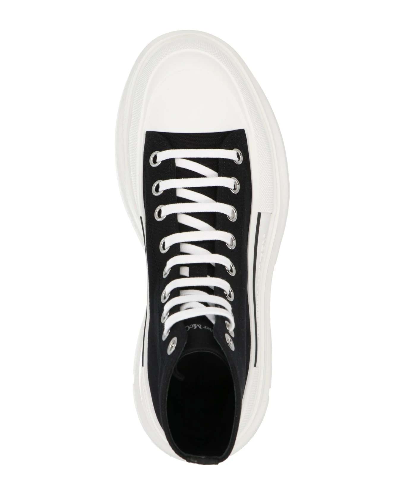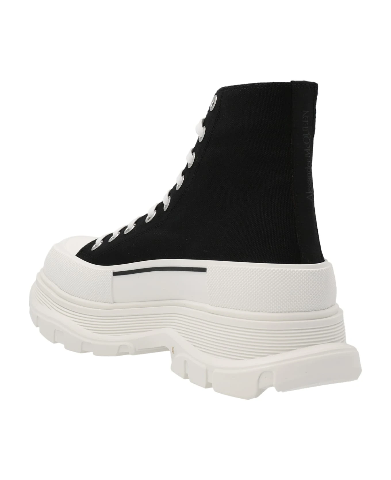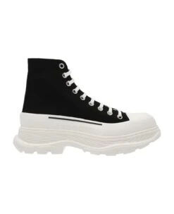 Canvas ankle boots with lacing, and an oversize rubber sole with an embossed logo.