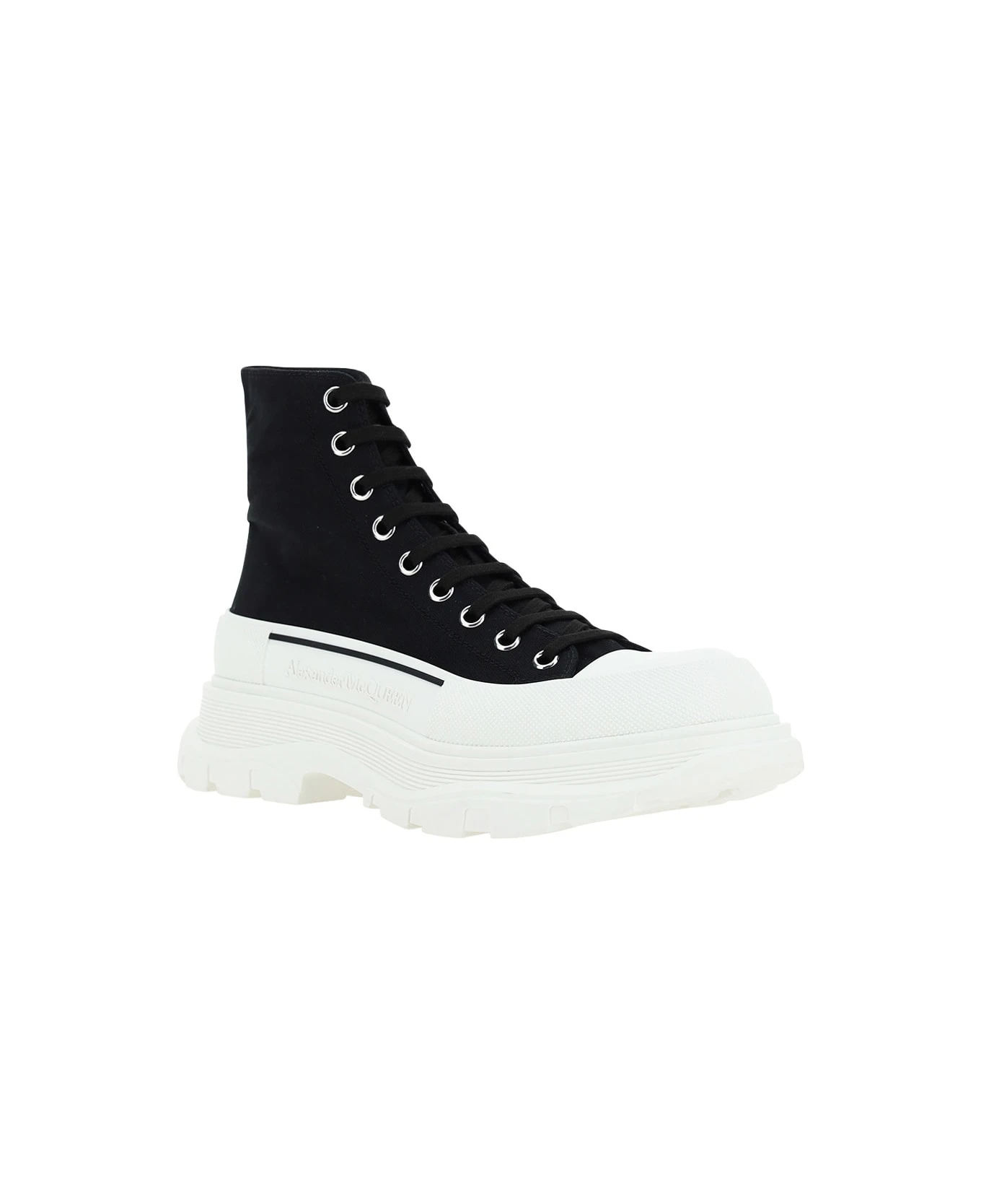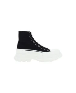 Cotton sack sneakers by alexander mcqueen featuring a structured round toe, an ankle-high style, a lace-up front closure, and a textured rubber platform sole.