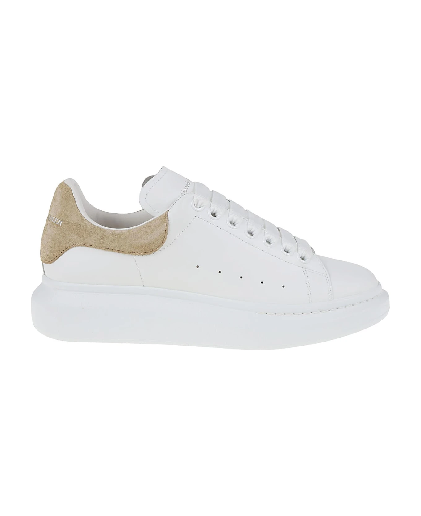 Oversized leather sneakers BY ALEXANDER MCQUEEN. Lace up with wide flat laces, oversized sole. Contrasting detail on the back with Alexander McQueen logo, also present on the tongue. It can be worn with both casual clothing and a dress. A real must for both winter and summer seasons, with color variations.