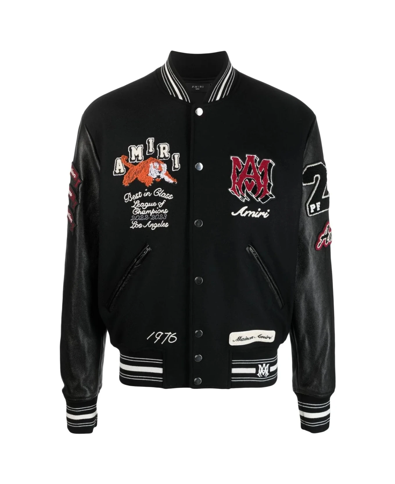 Black varsity bomber jacket for men from Amiri featuring a leather and wool blend with a Vintage teddy patches. Featuring a bomber collar, long sleeves, front pockets, a snap button closure, and ribbed stretch knit trims. Lined interior.
