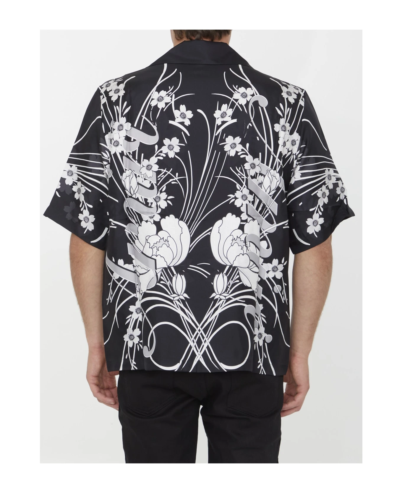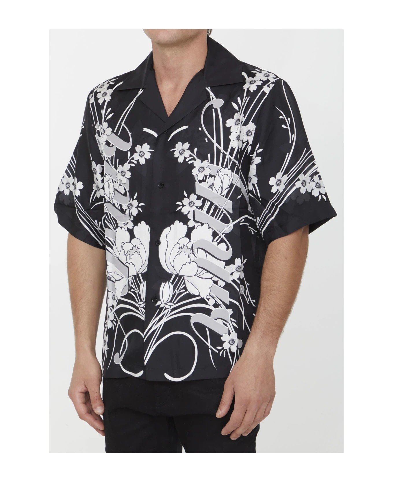 Short-sleeved bowling shirt in black and white silk with all-over floral motif. It features open collar and front button closure. Regular fit.