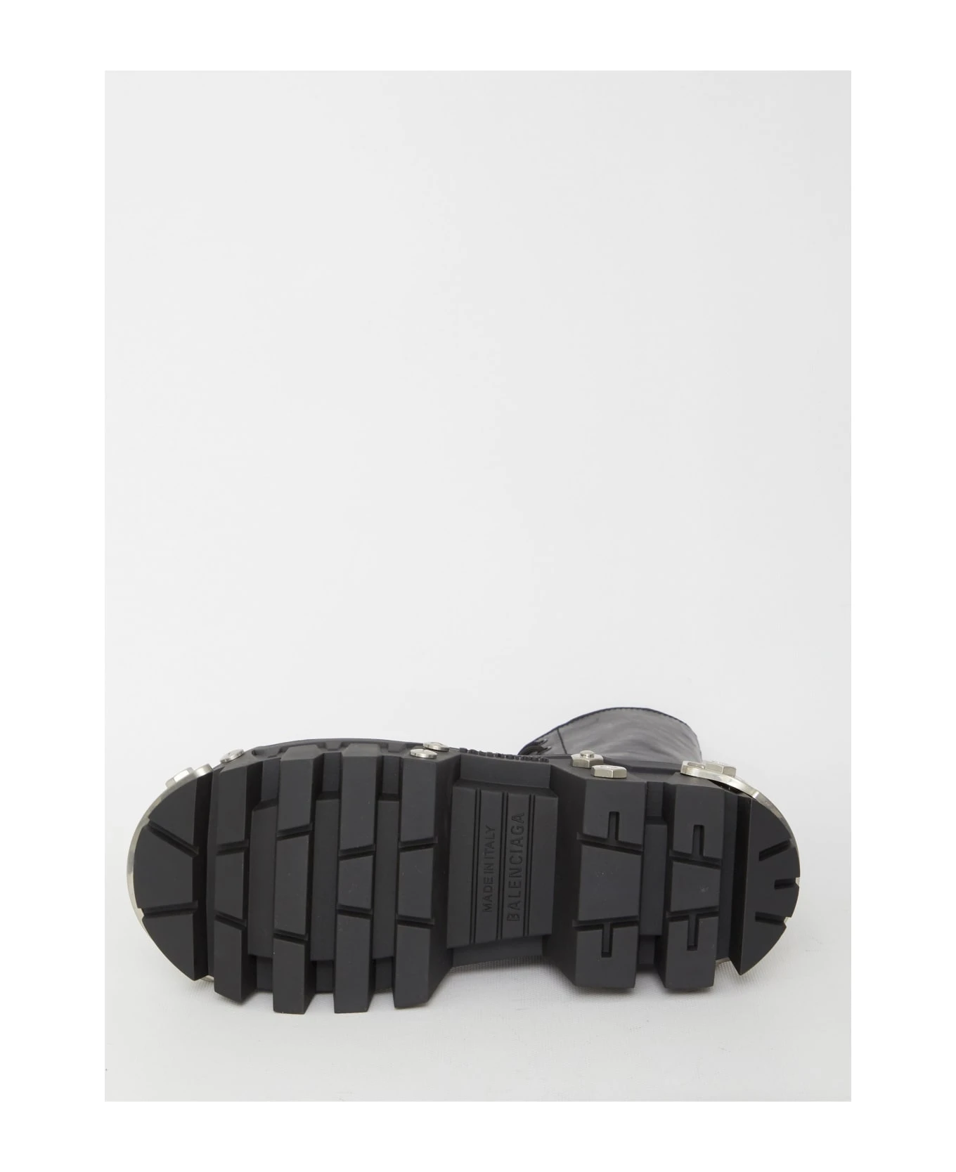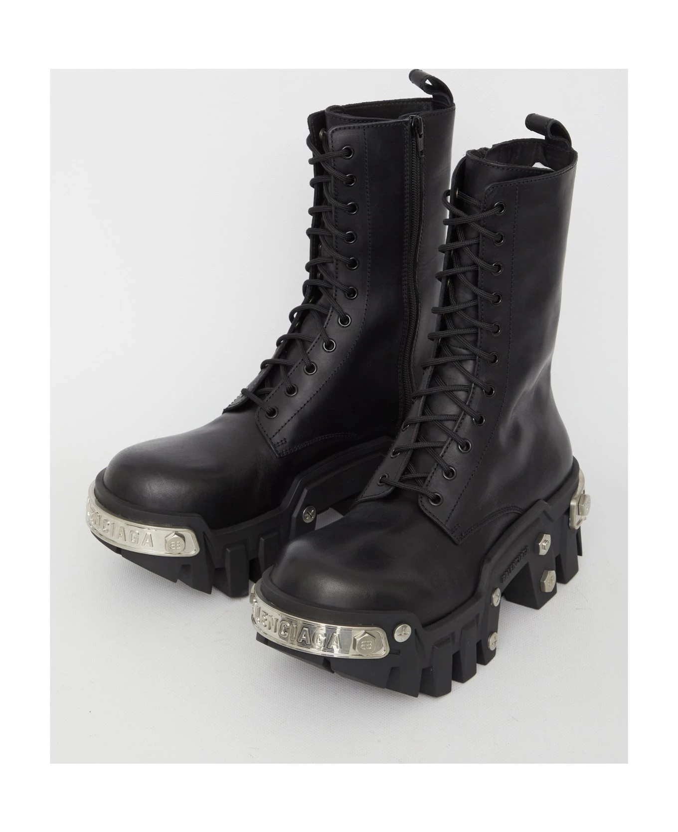 Bulldozer Lace-up boots in black calfskin with silver-tone metal details. They feature front lace-up, side zip closure, embossed Balenciaga logo at the front and at the back and lug rubber chunky sole. Any leather imperfections are not to be considered factory defects, but a peculiarity of the material.