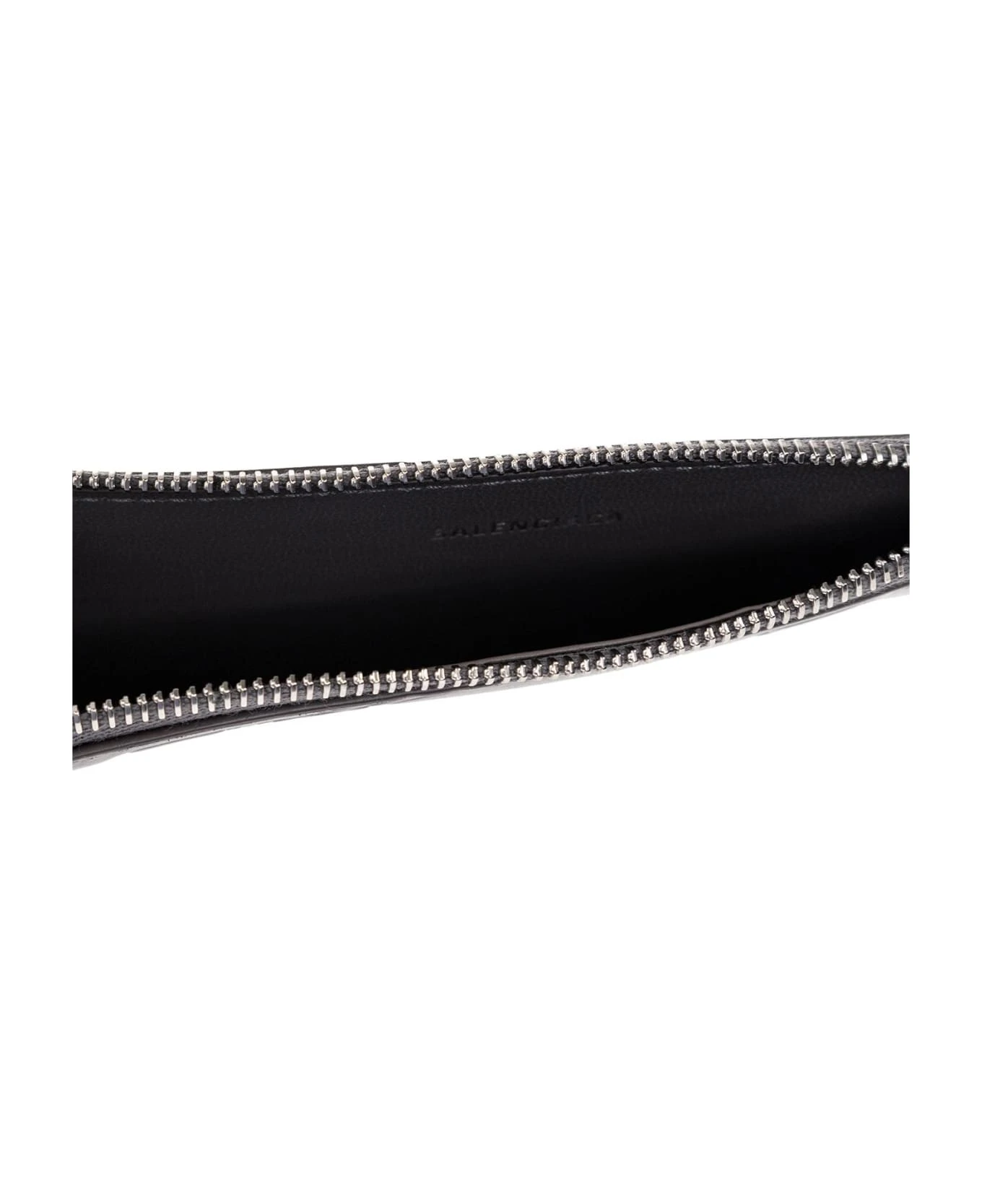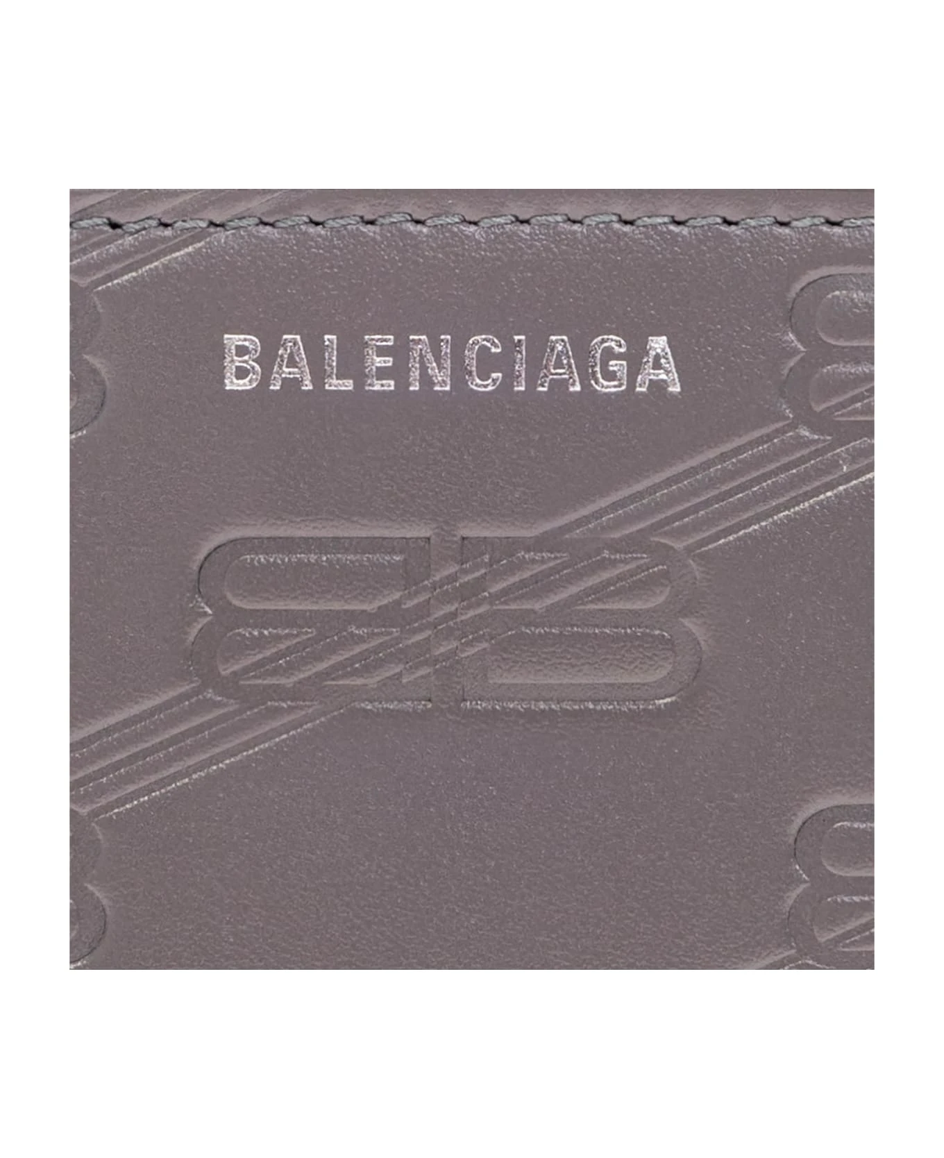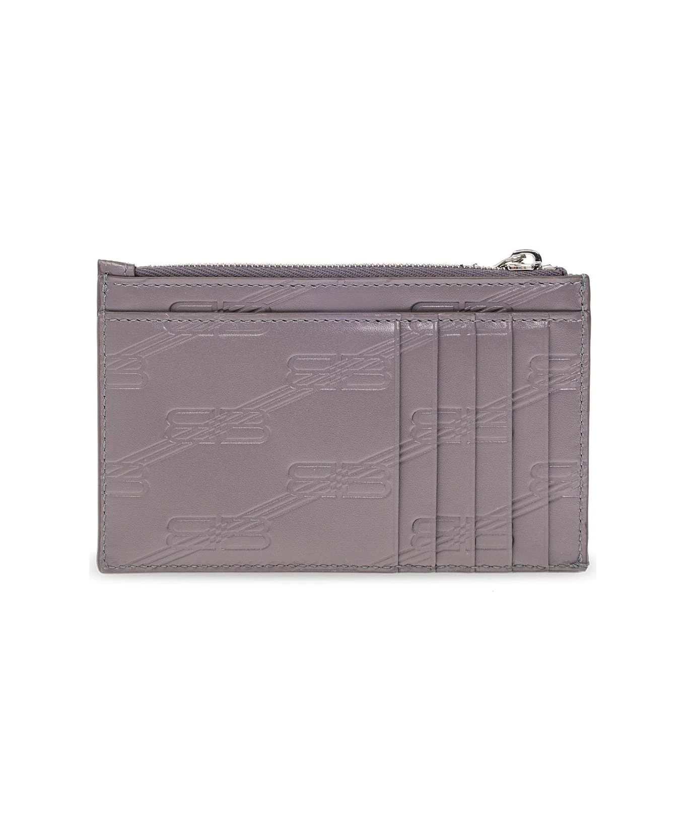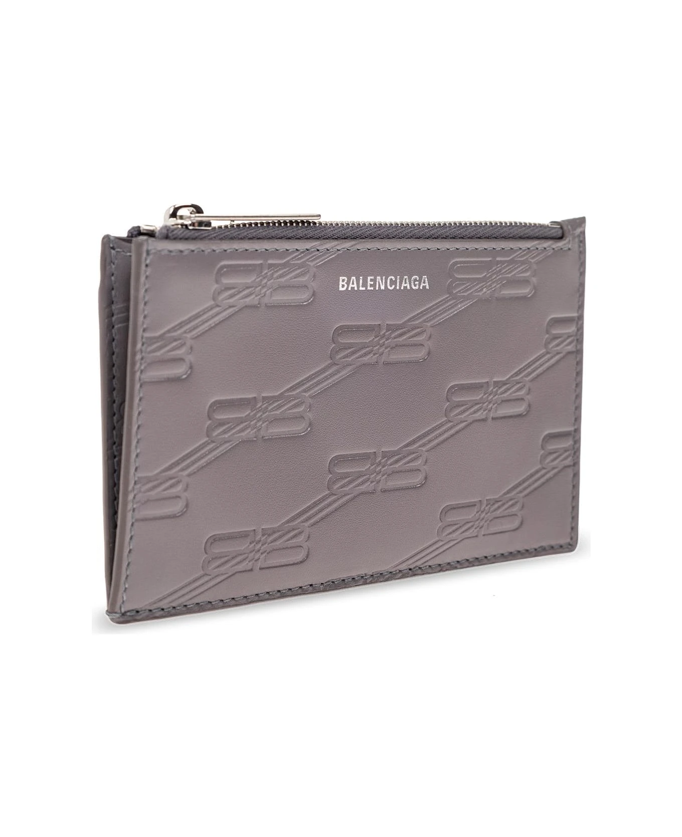Grey card case from Balenciaga. Made of leather, this item features an embossed monogram pattern, silver-tone logo detailing on the front, one zip coin pocket as well as one slip pocket and five card slots at the back.