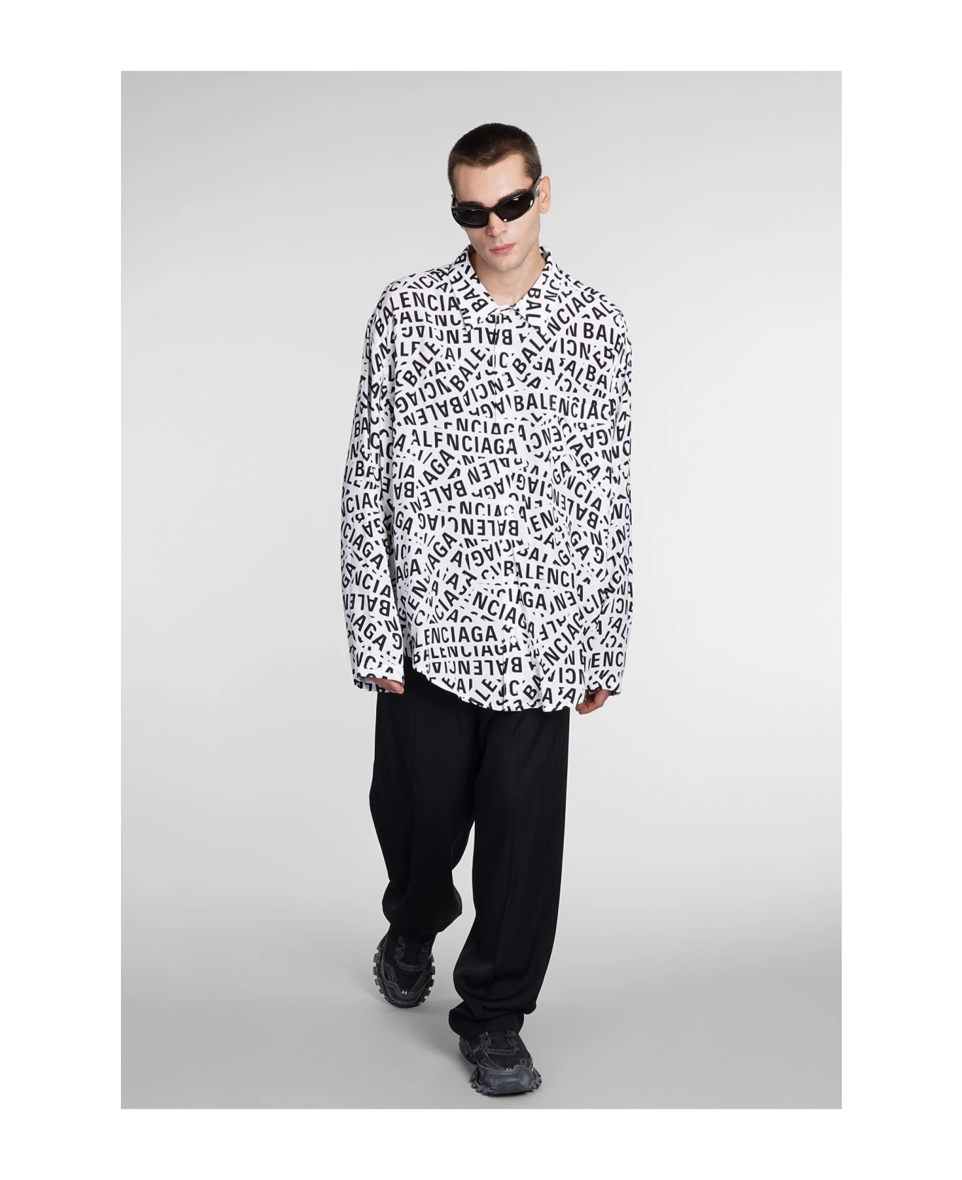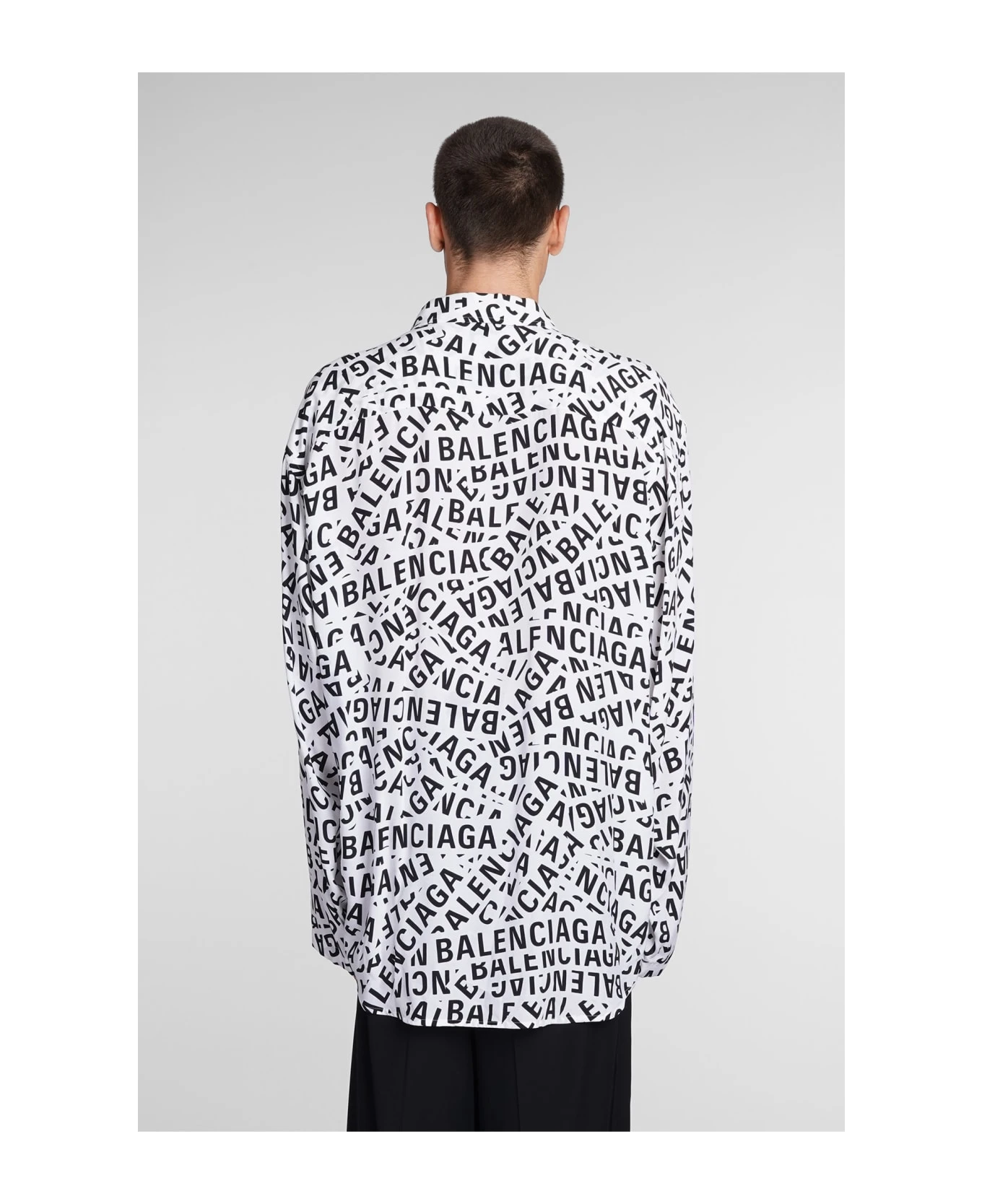 Shirt in white polyamide polyester, collar, long sleeves, frontal buttoning, logo printed, breast pocket, 55% cupro 45% viscose, Made in Madagascar, Model is 1. 83 and wears size 40