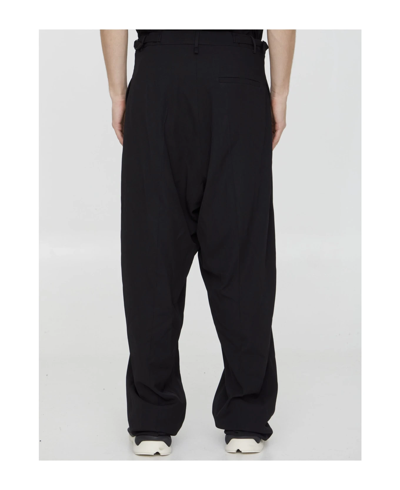 Skater Tailored pants in black regenerative wool with belt loops, two belt tabs on sides to adjust waistline, two slash pockets at front and one welt pocket at back. Large fit.