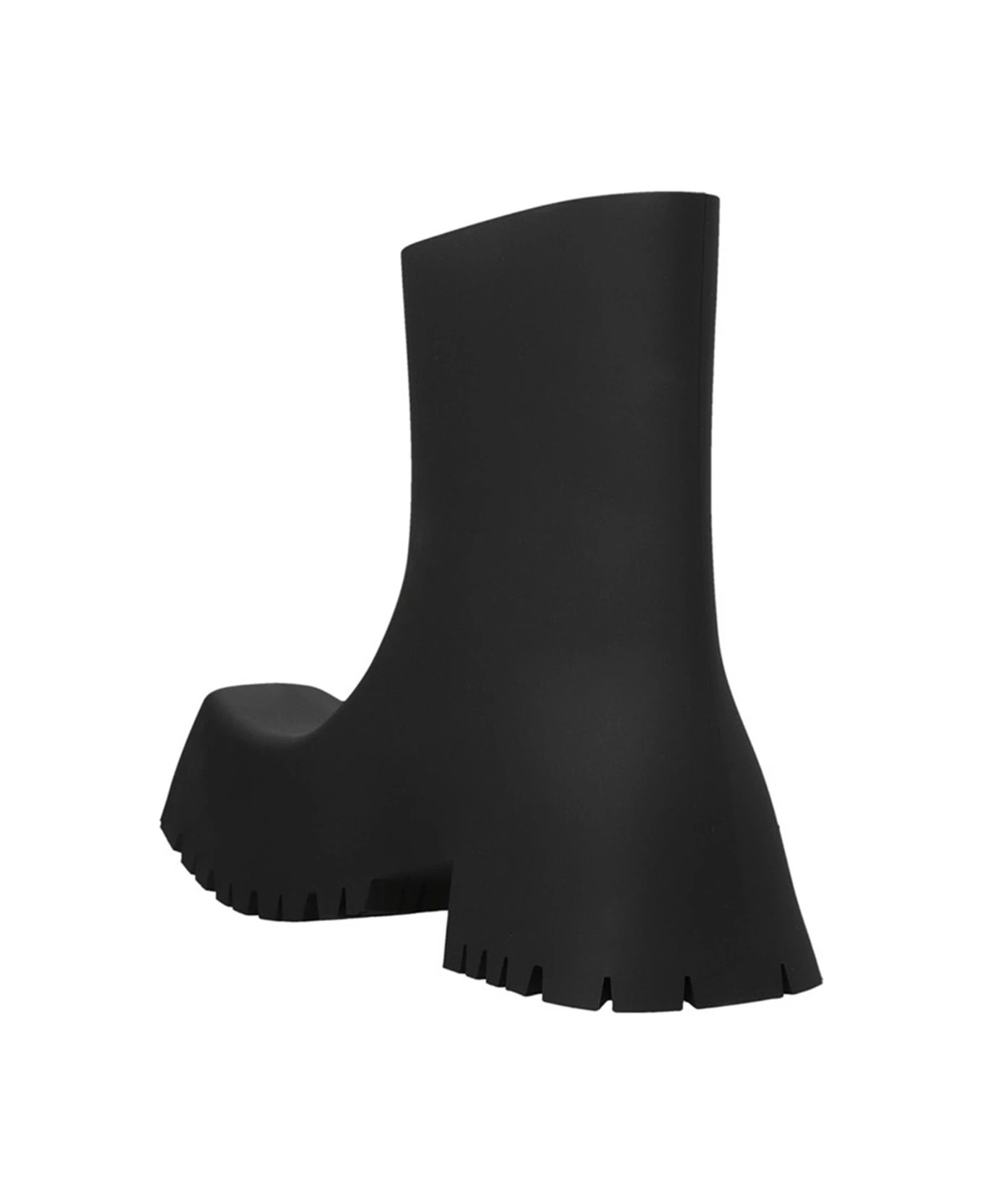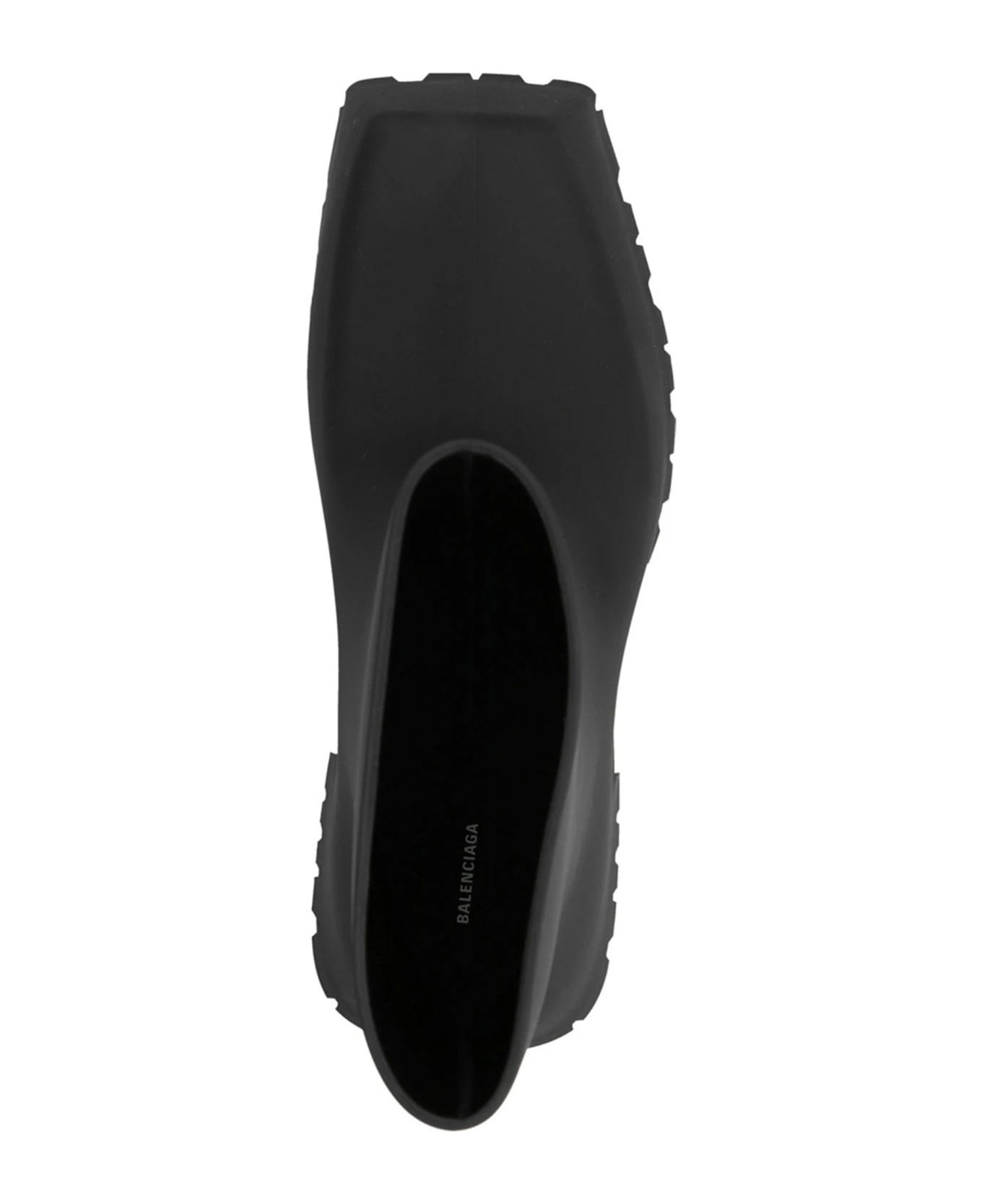 ‘Trooper Rubber’ black rubber ankle boots with square toe, thick notched sole.