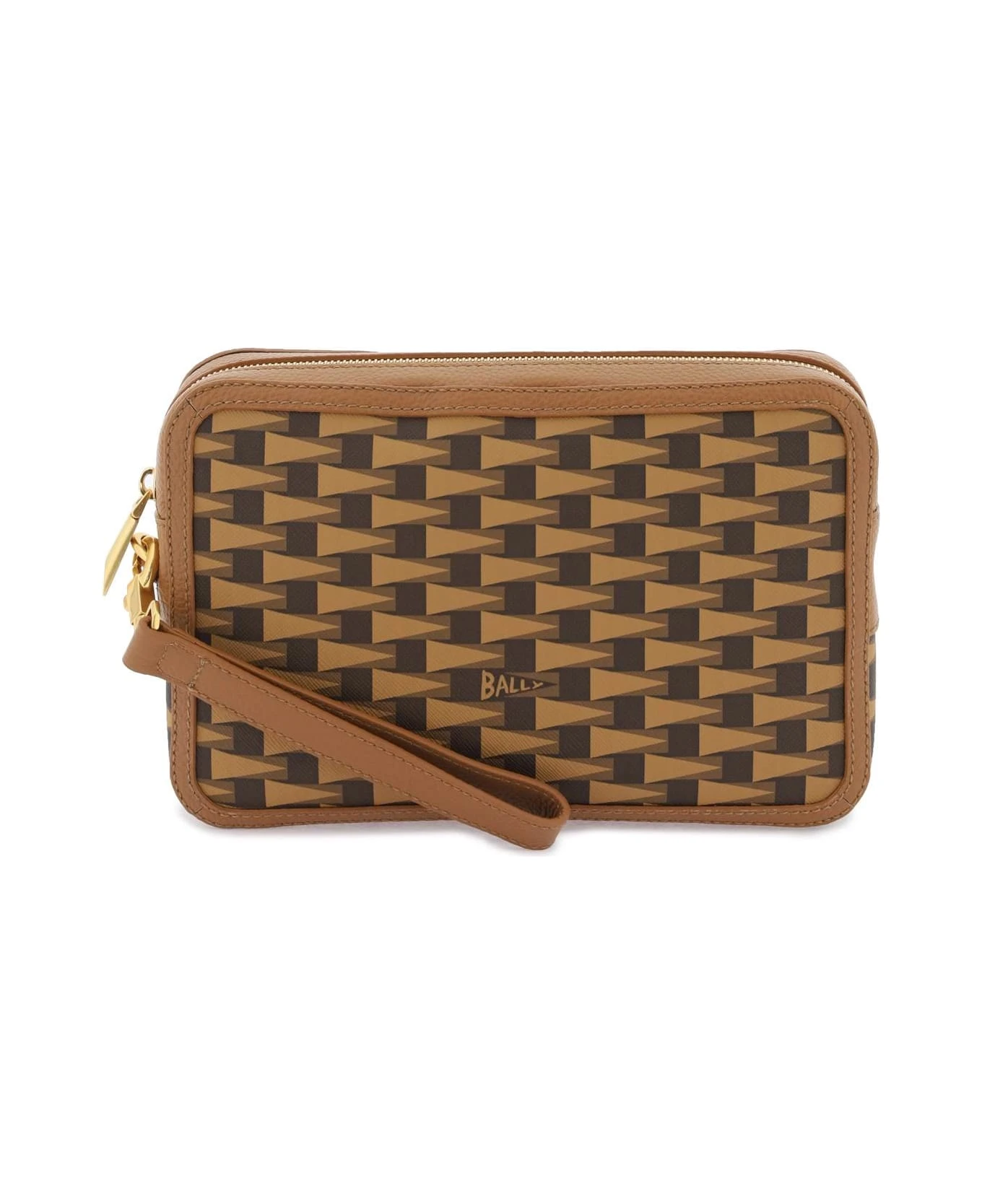 Bally clutch crafted in coated canvas with iconic Pennant motif and leather trims. Zippered closure, lined interior with an open pocket and a zippered one and detachable wrist handle. Gold-finished metalware.