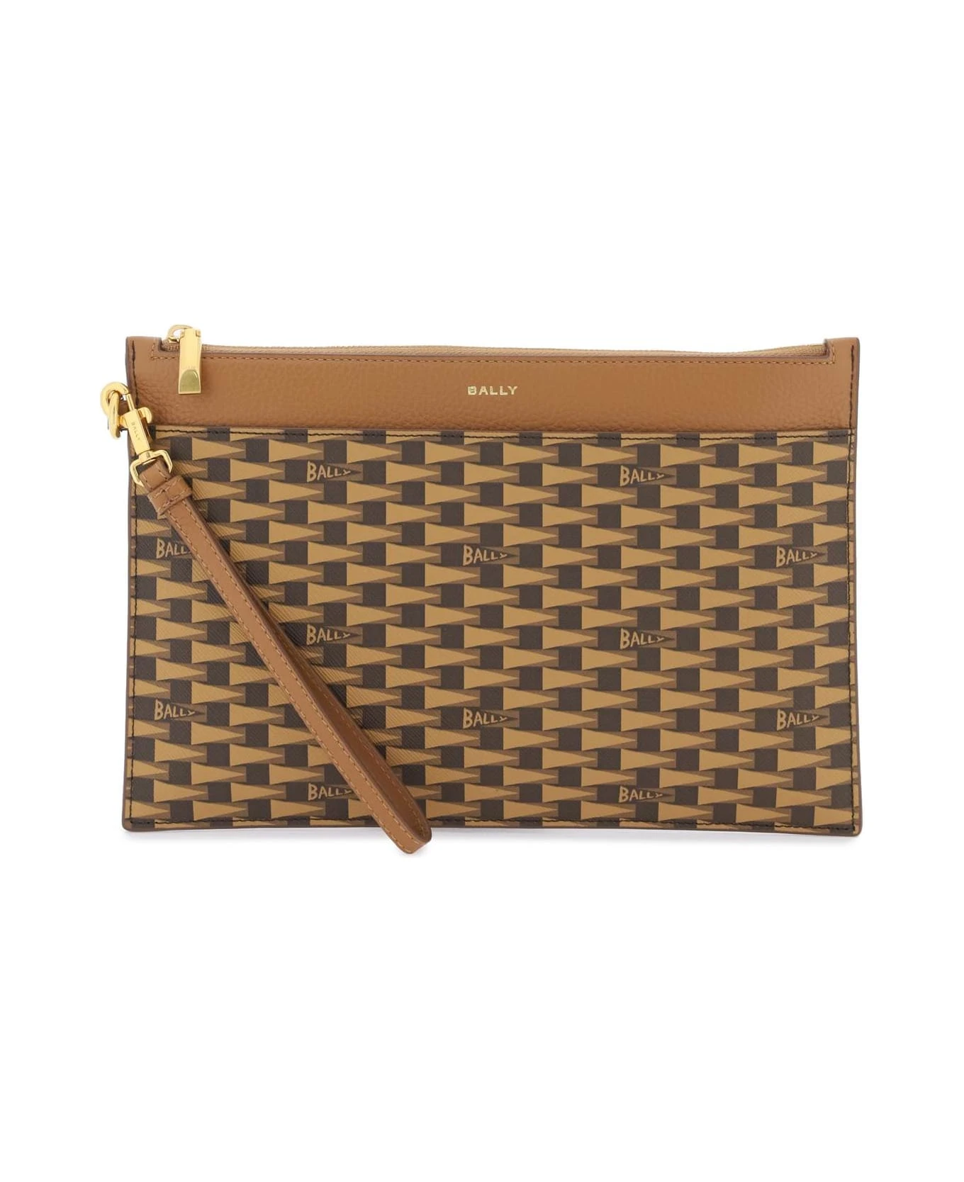Bally pouch in coated canvas with iconic Pennant pattern and grained leather trim. Zip closure, fabric-lined interior with two open pockets, six credit card slots and one zippered pocket, detachable leather wrist handle, additional flat pocket at front. Gold-finished metalware.