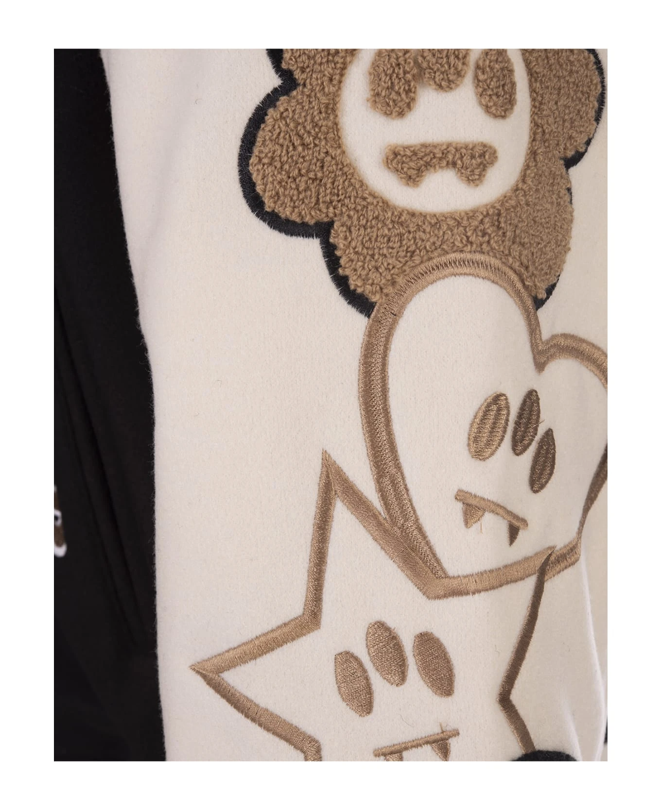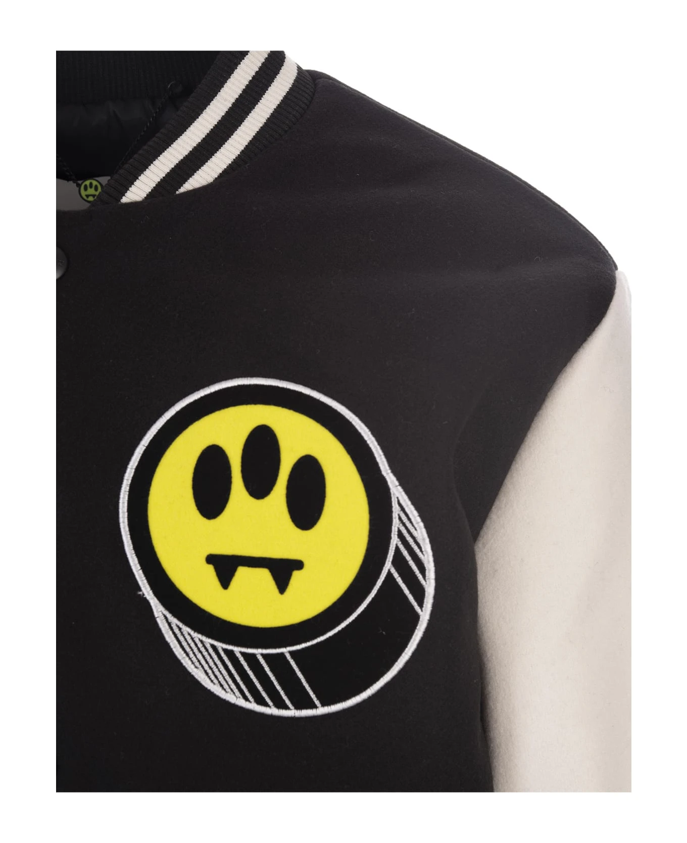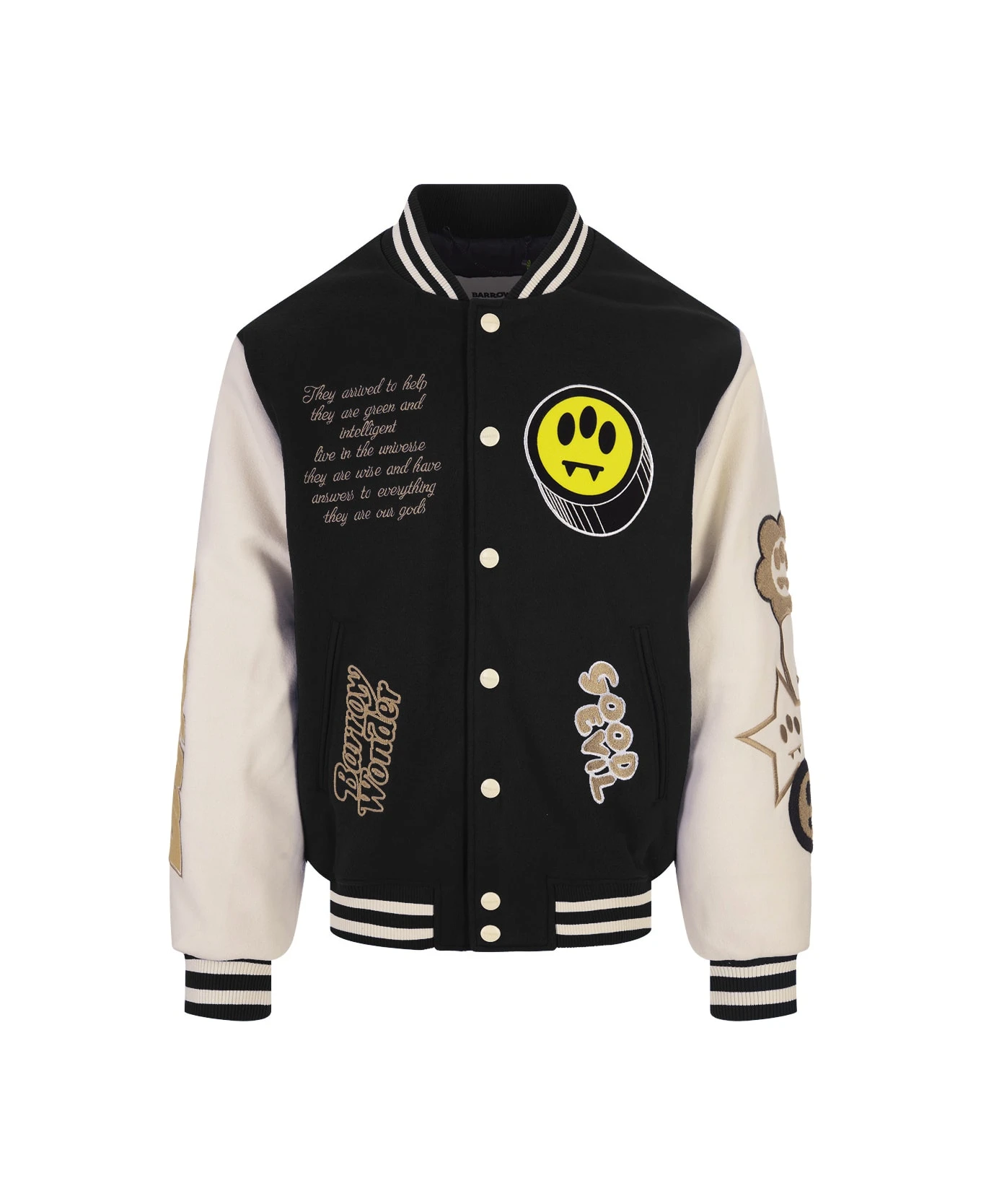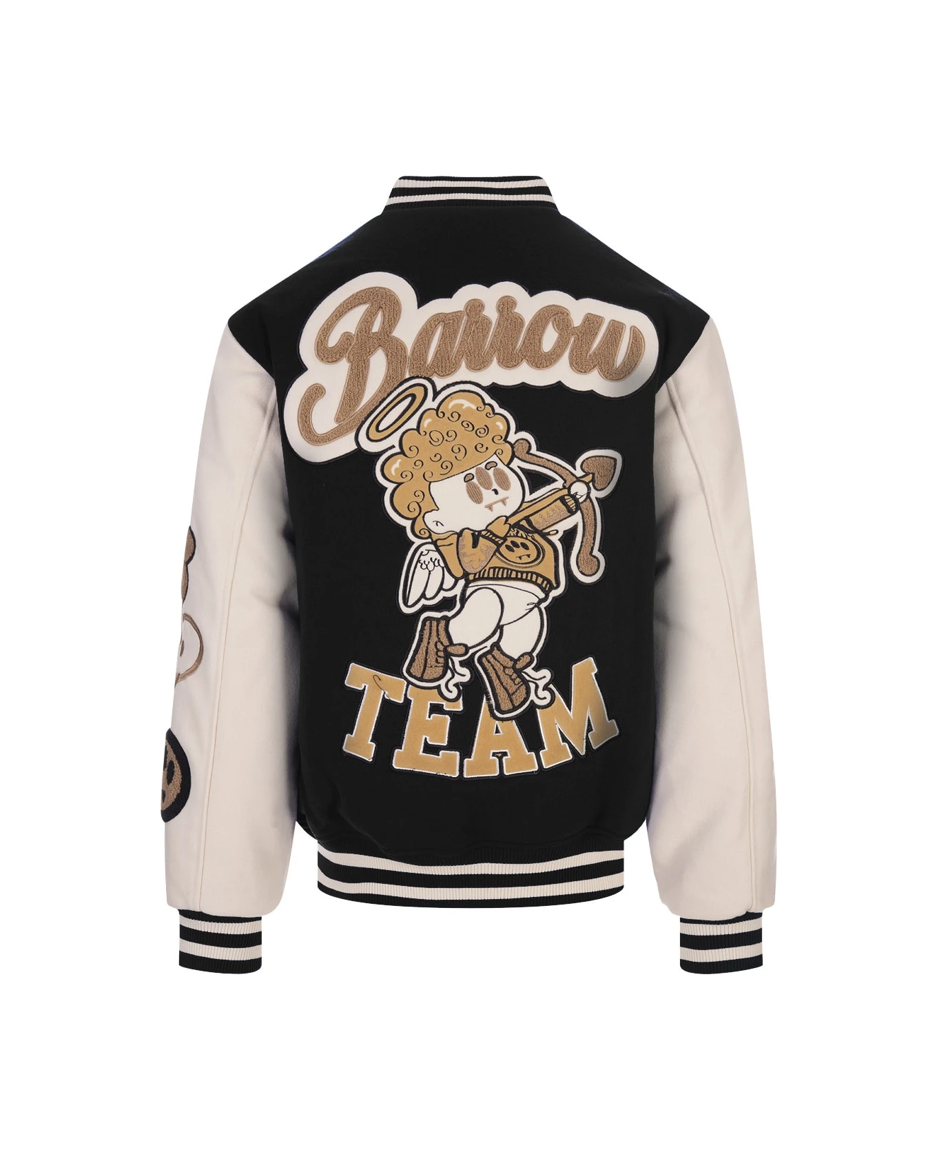 College bomber jacket by Barrow made of black cloth with contrasting sleeves, striped knit finishes, button closure and all-over embroidered patches.