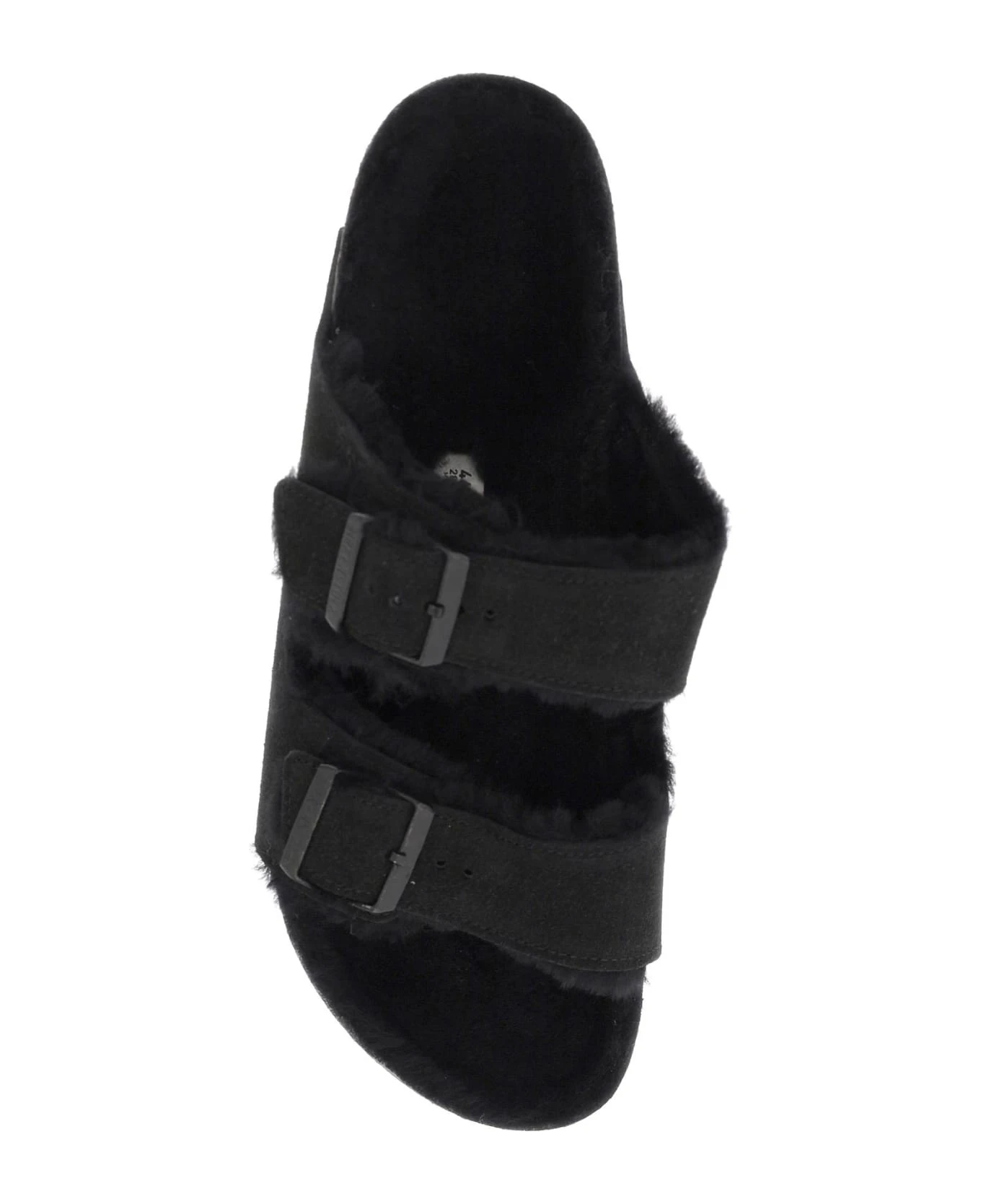 BIRKENSTOCK Arizona mules crafted in suede leather with shearling lining. Double adjustable strap with antiquated bronze-finished metal buckle with debossed logo. Shearling footbed, latex and cork moulded sole and EVA tread. Narrow fit.