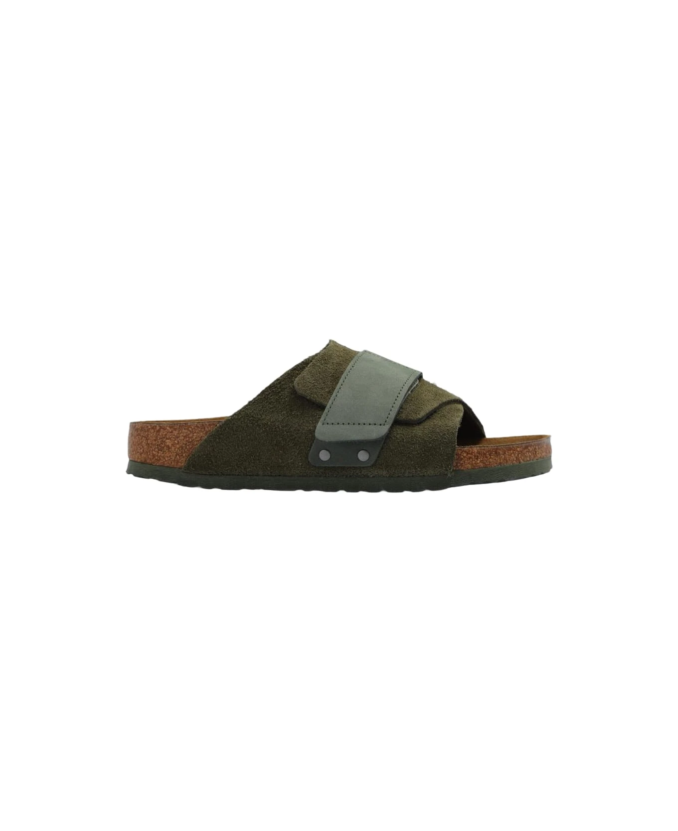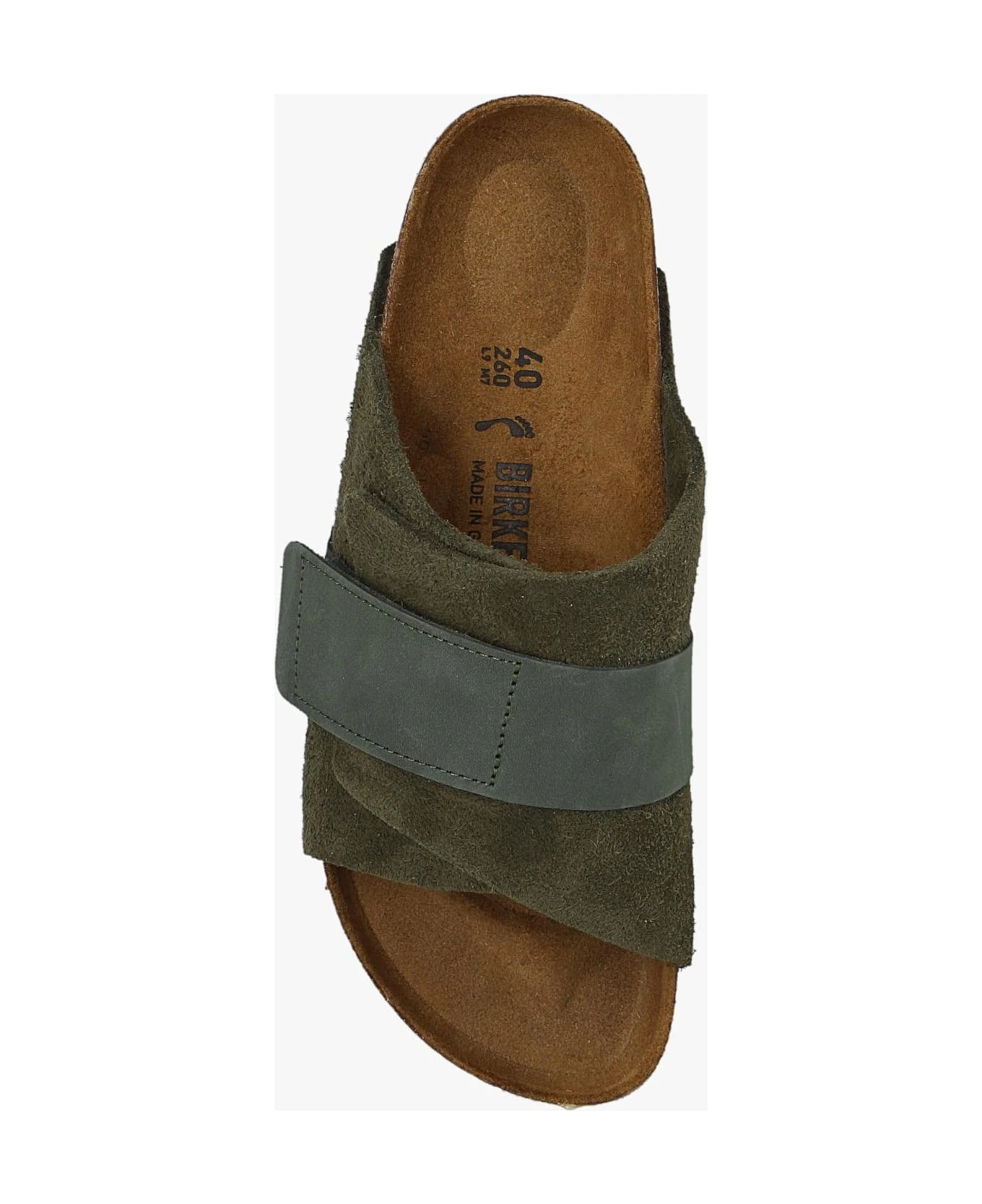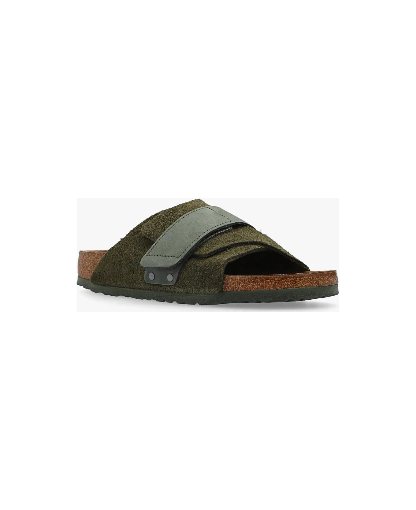 Green ‘Kyoto’ slides from Birkenstock. Crafted from suede and leather, this model sits on a green EVA foam sole and features adjustable velcro straps, an embossed logo on the side and an anatomically shaped cork-latex footbed. Narrow width.