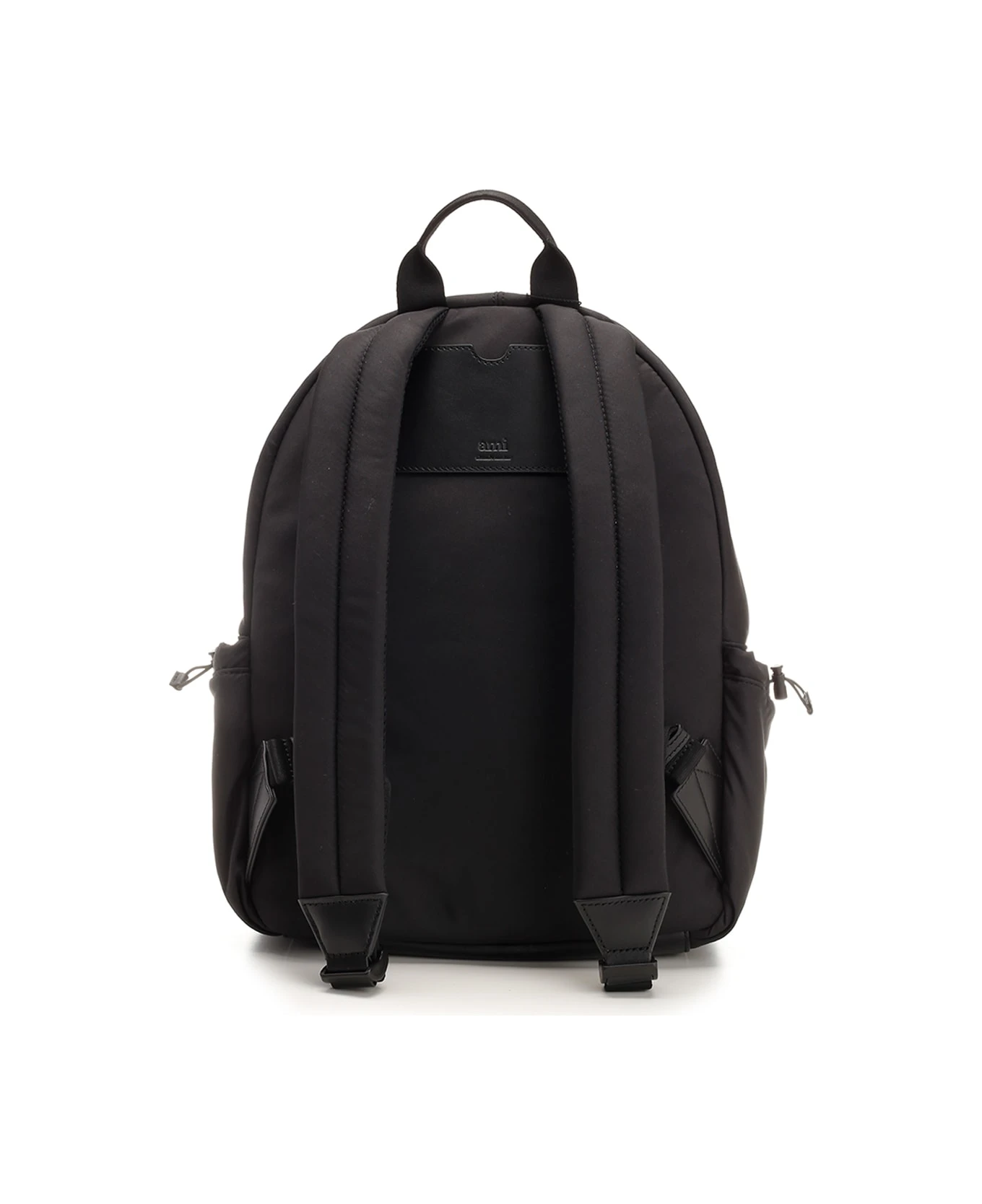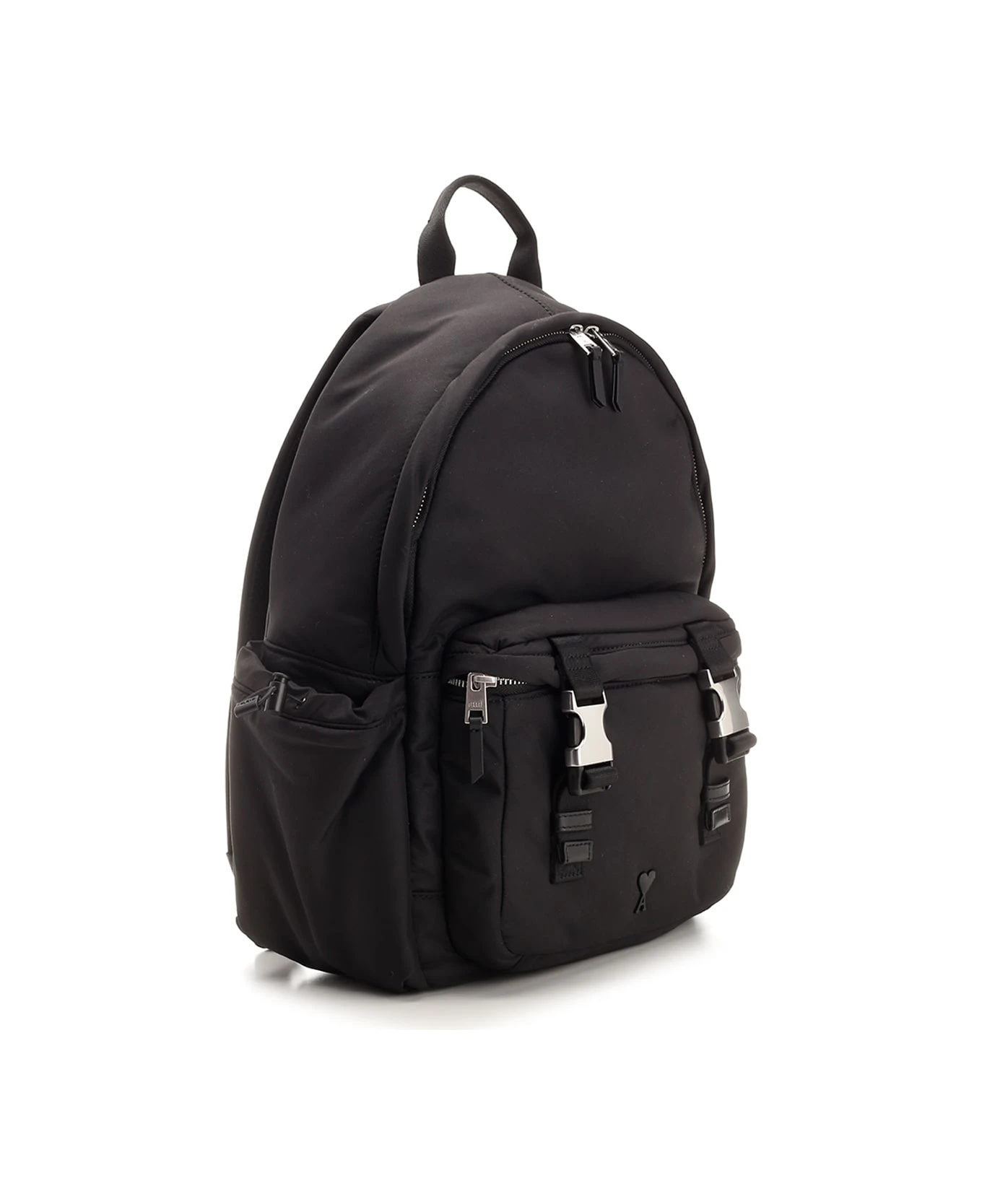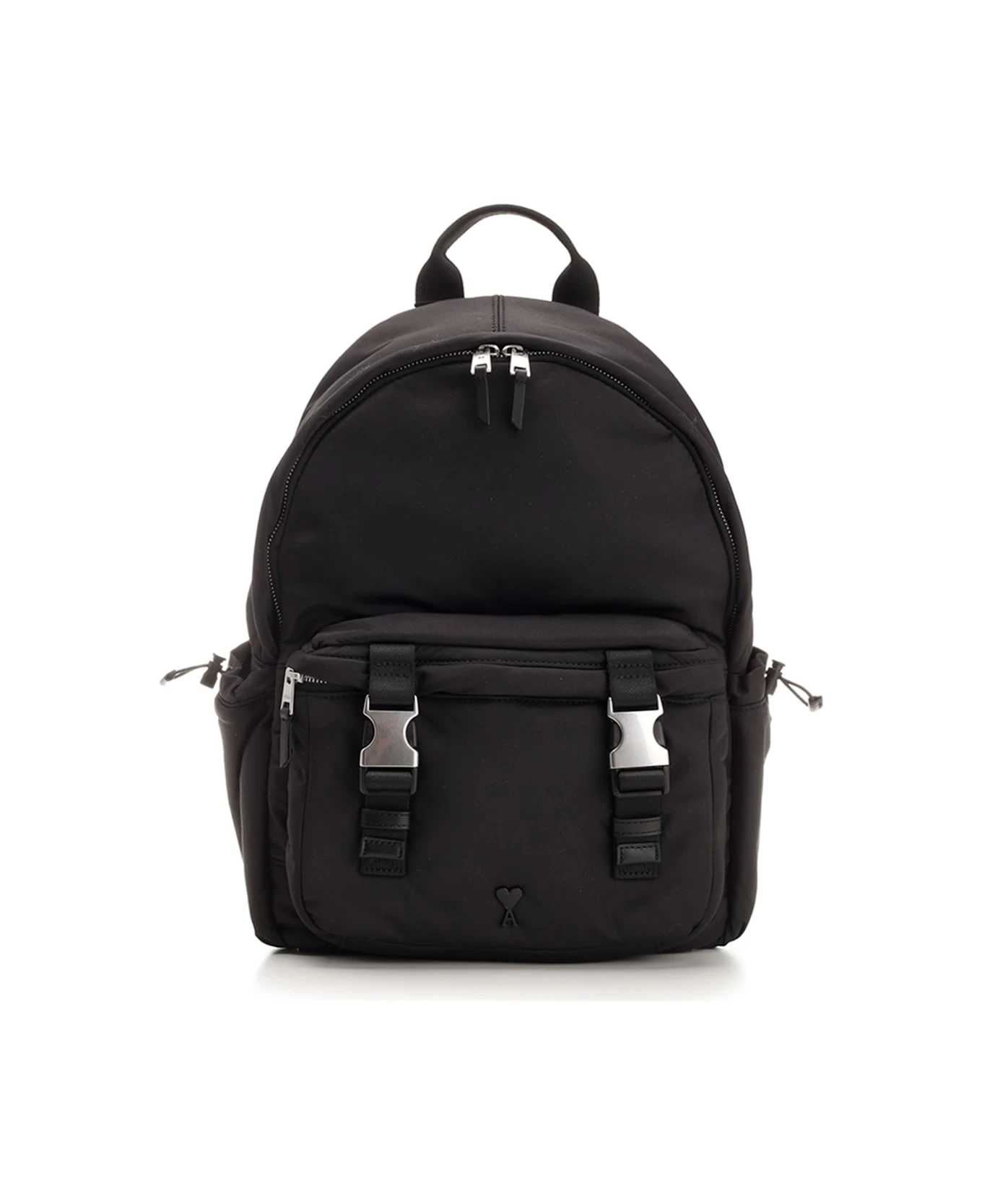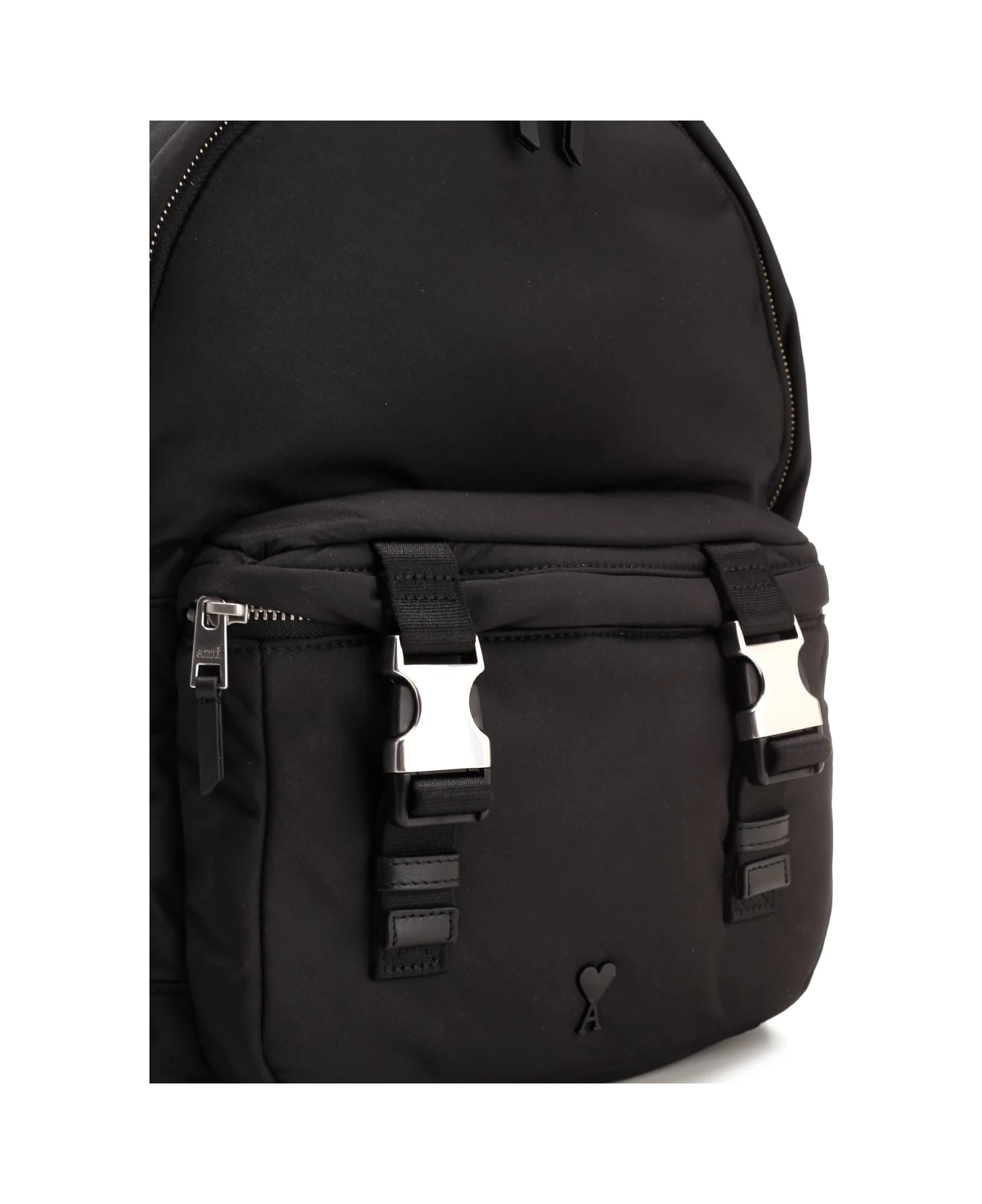 Black “Ami De Coeur” backpack from Ami in technical fabric, one front pocket with zip and hooks, two side pockets with drawstring closure, one main pocket with zip, adjustable shoulder straps, top handle, tonal logo embroidery applied on the front.