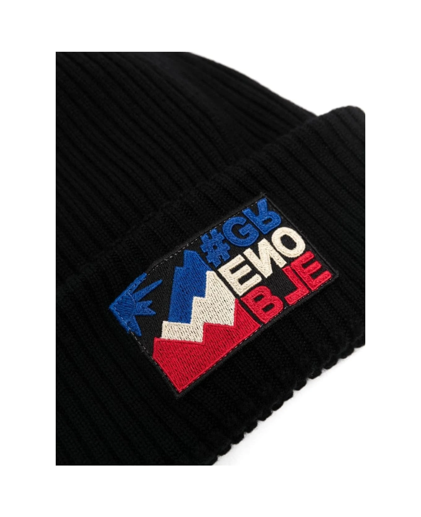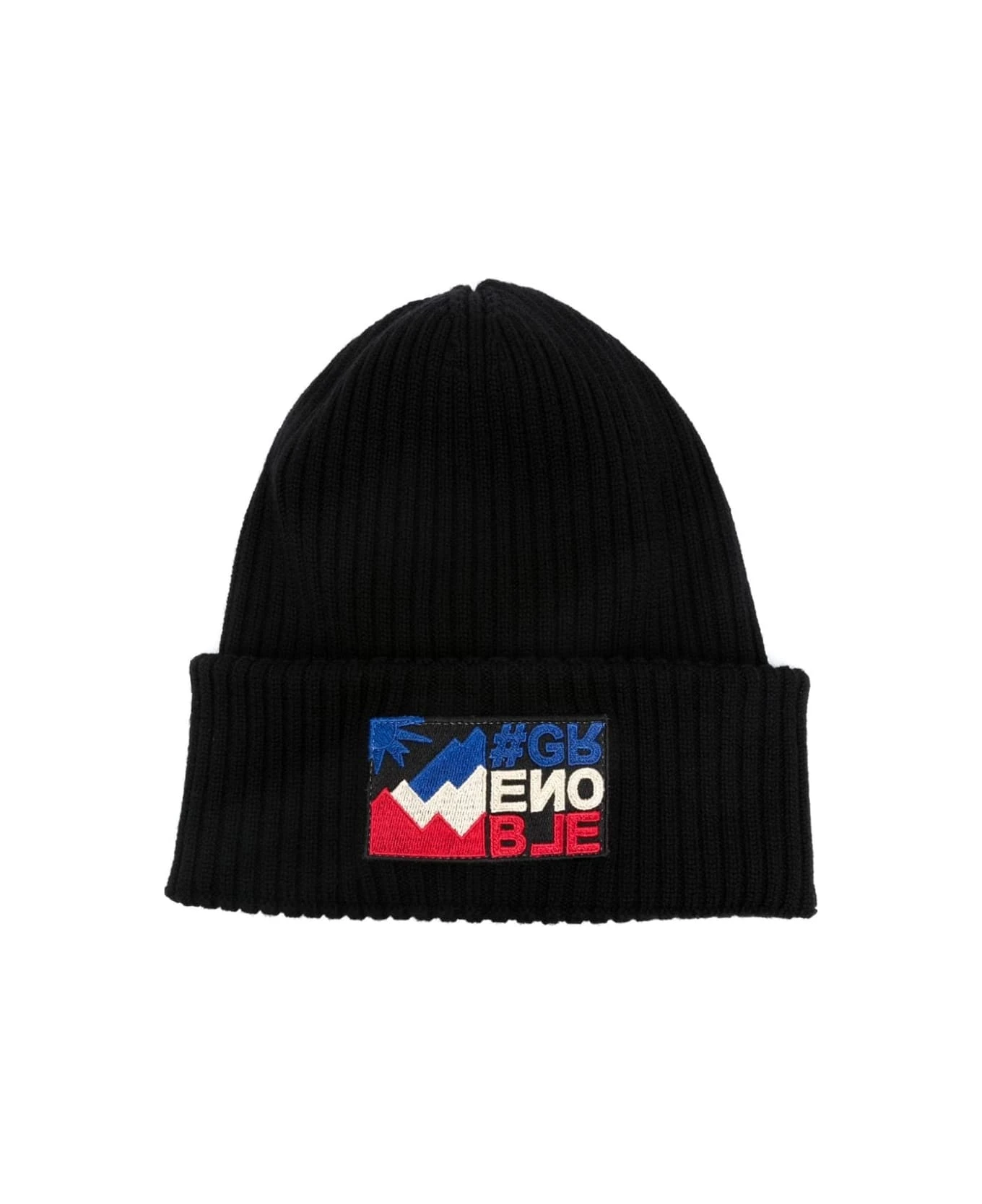 Moncler Grenoble turn-up beanie made of ribbed black virgin wool and finished with tricolour logo patch on the front.