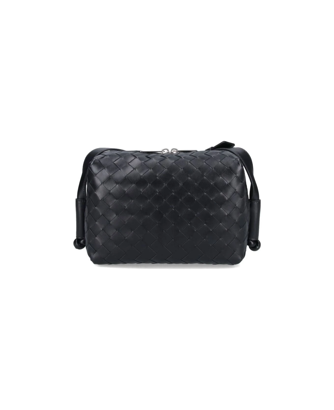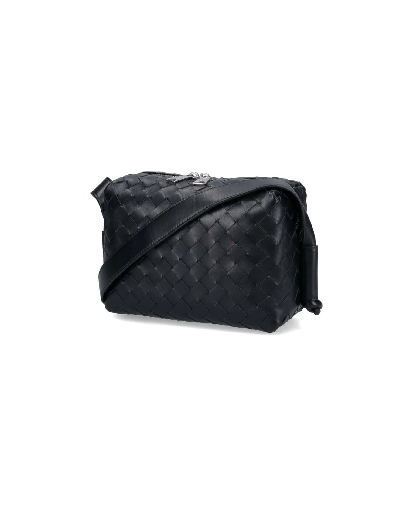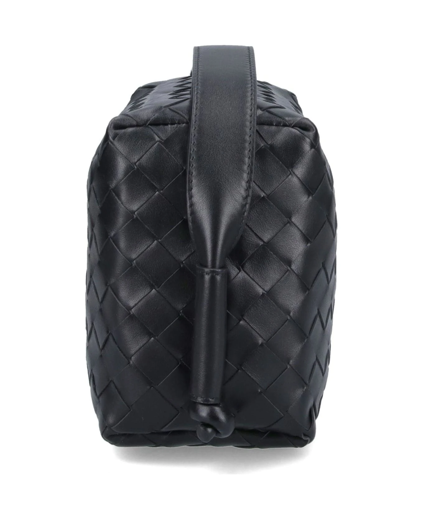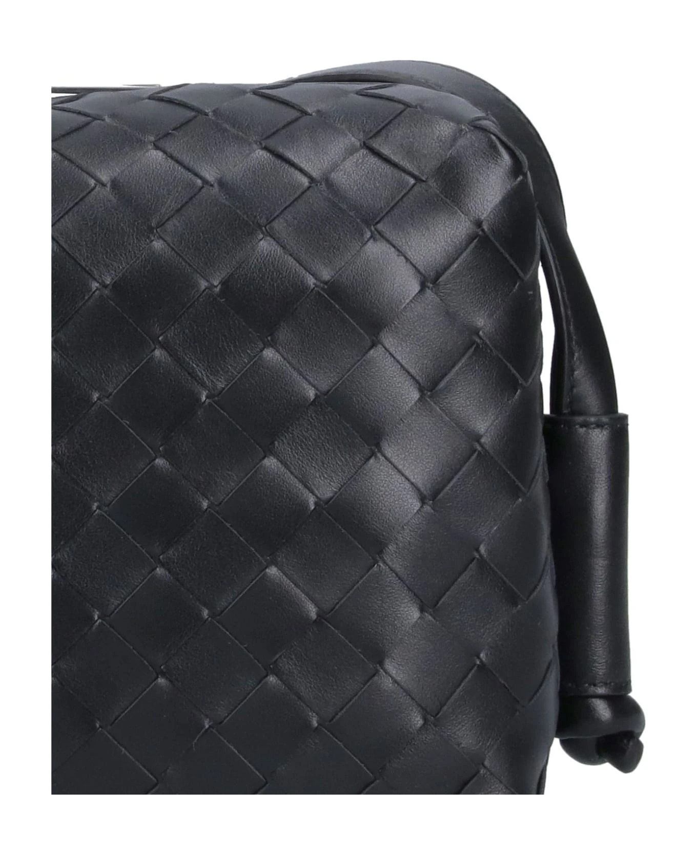 Bottega Veneta woven shoulder bag in black leather with adjustable shoulder strap, double zip closure, single inner compartment.