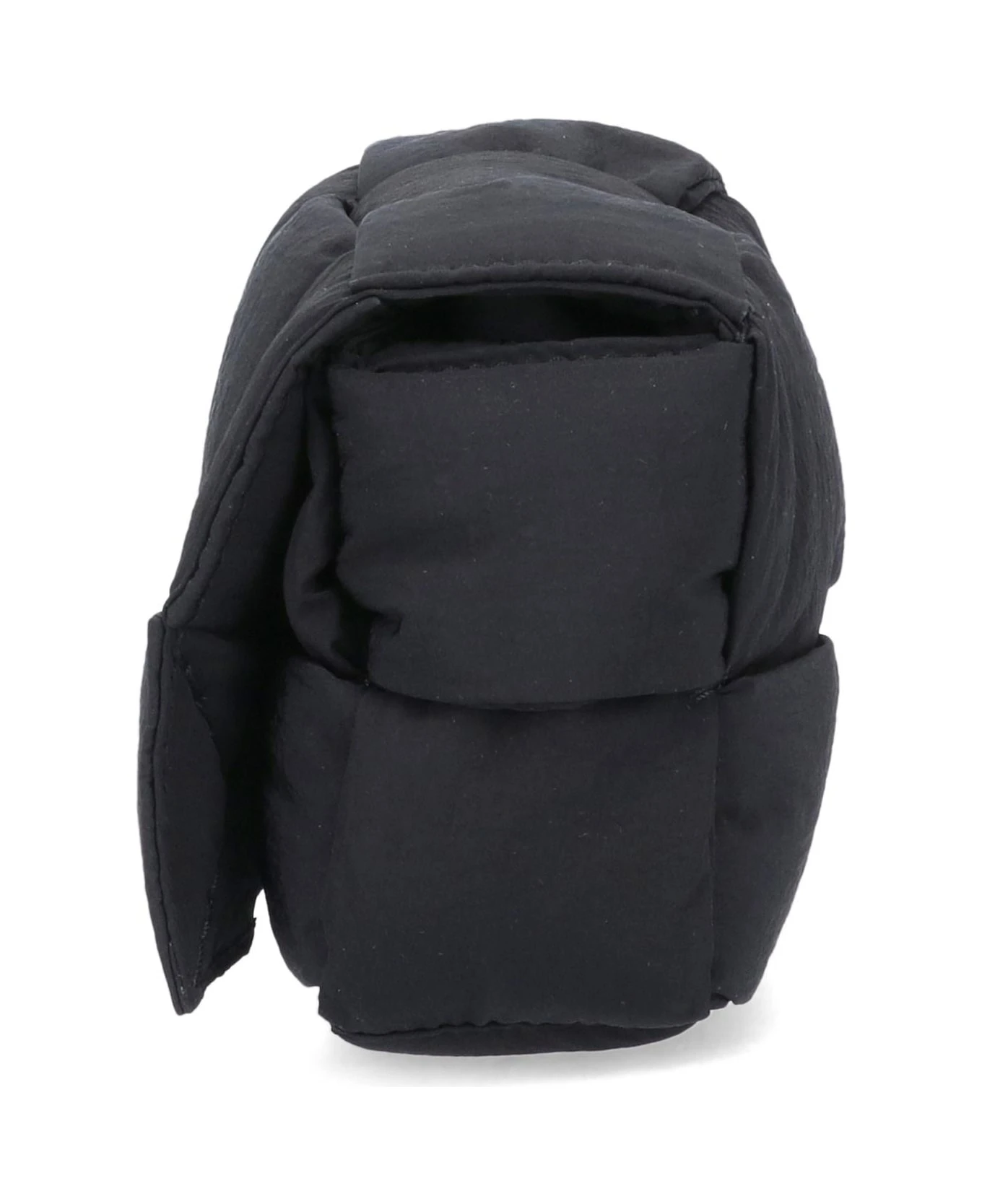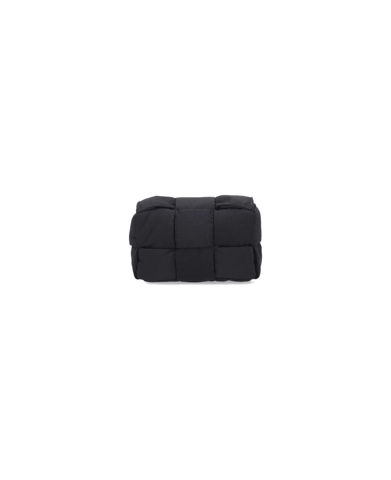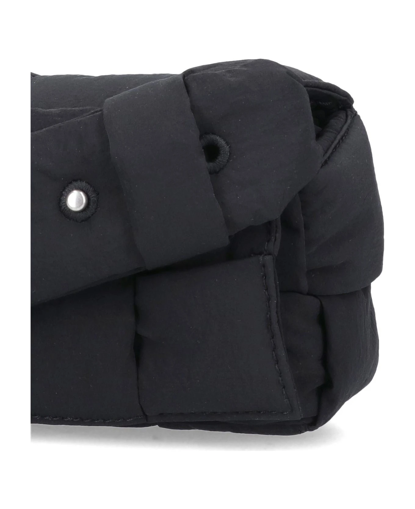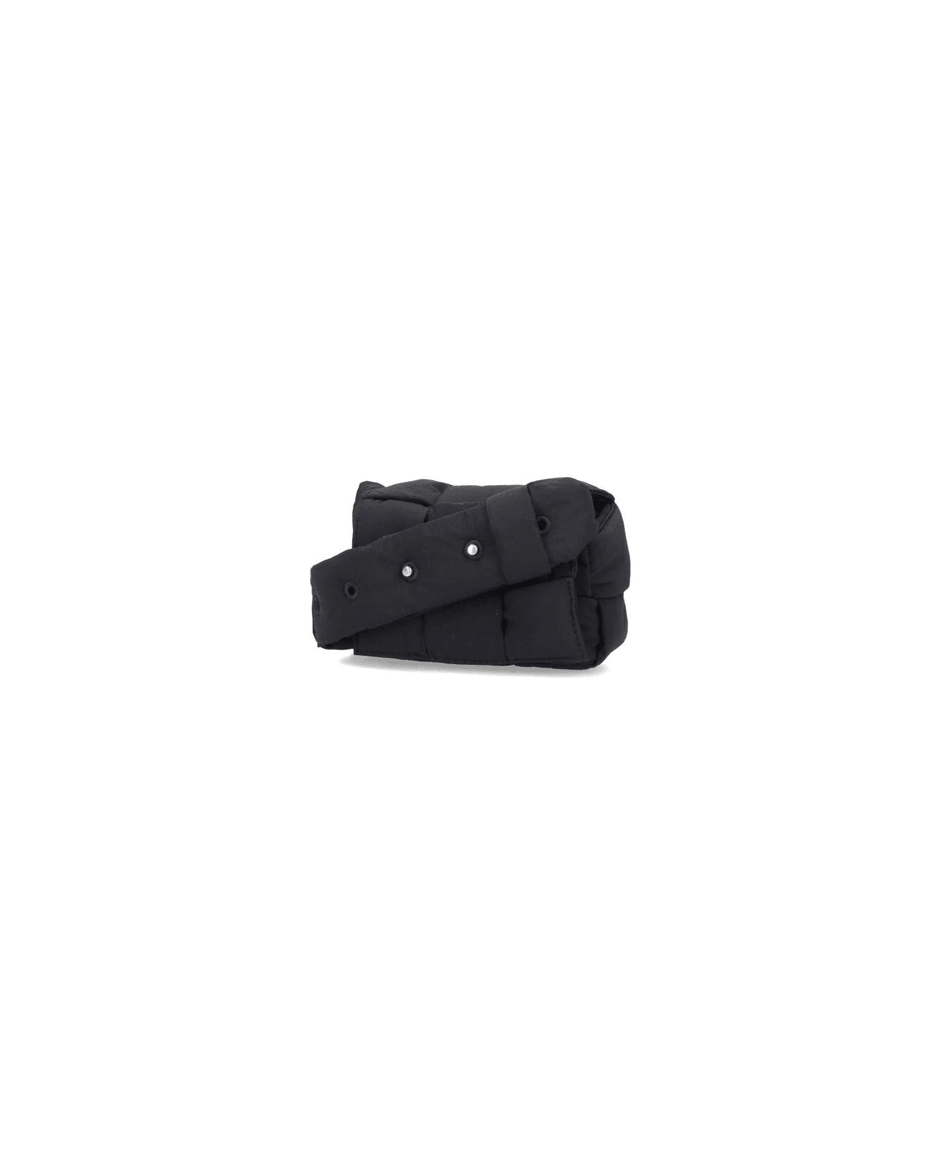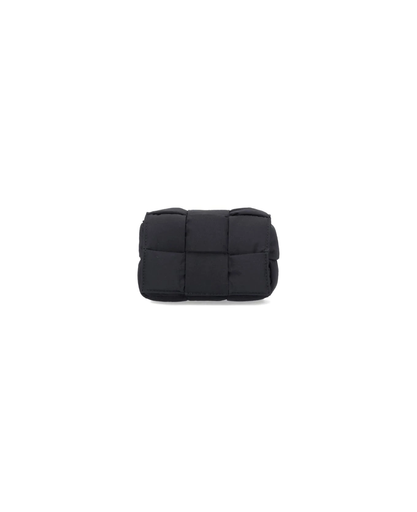 Bottega Veneta Candy Padded Tech Cassette’ black nylon mini bag with a quilted design, a cable pattern, a magnetic closure, an adjustable shoulder strap, a main inner compartment.
