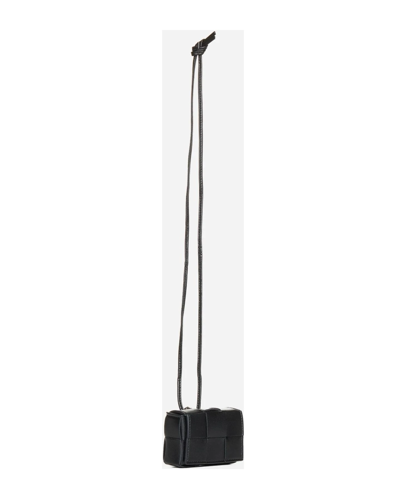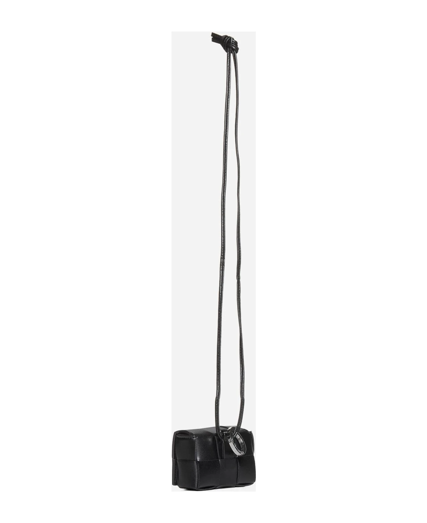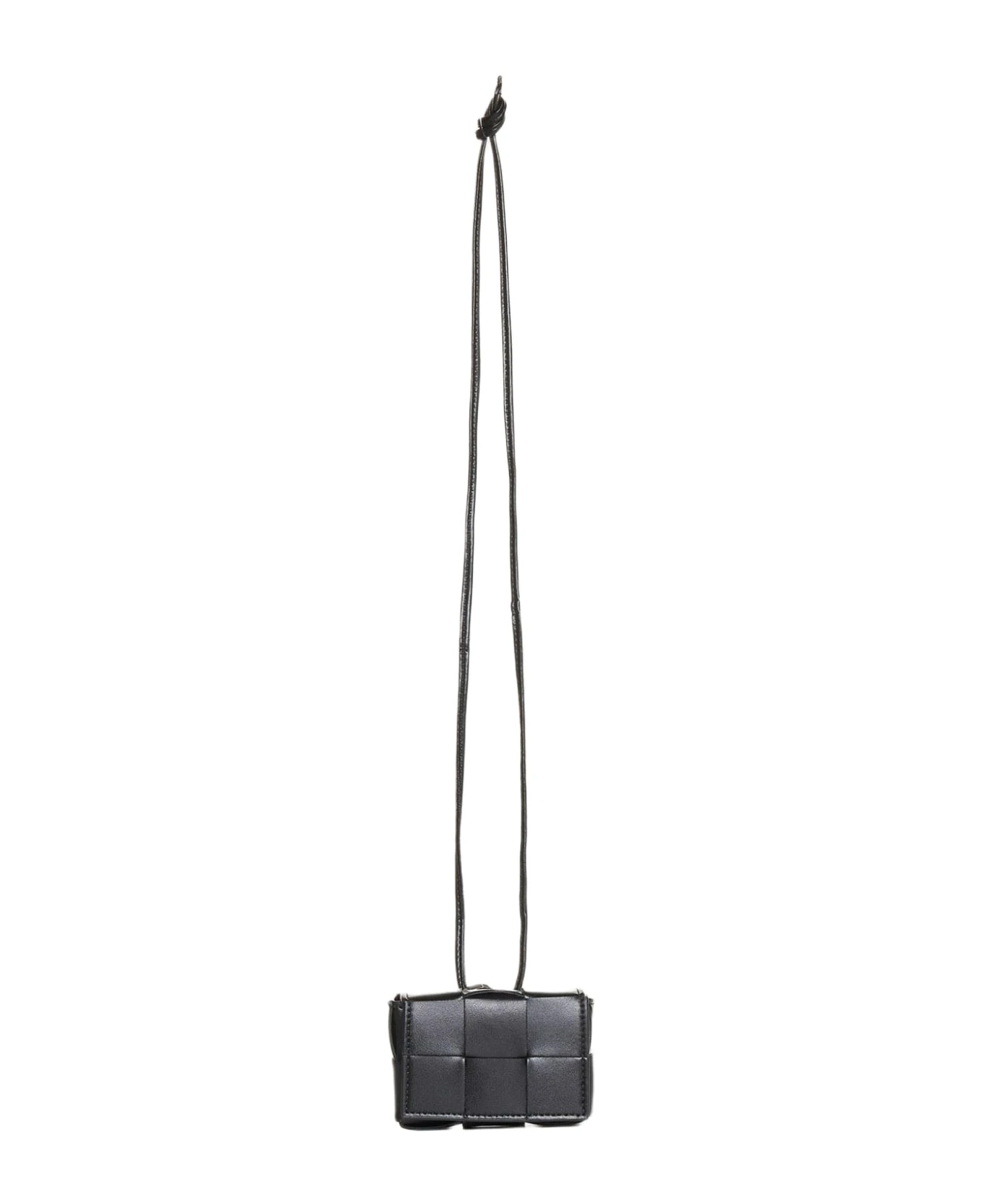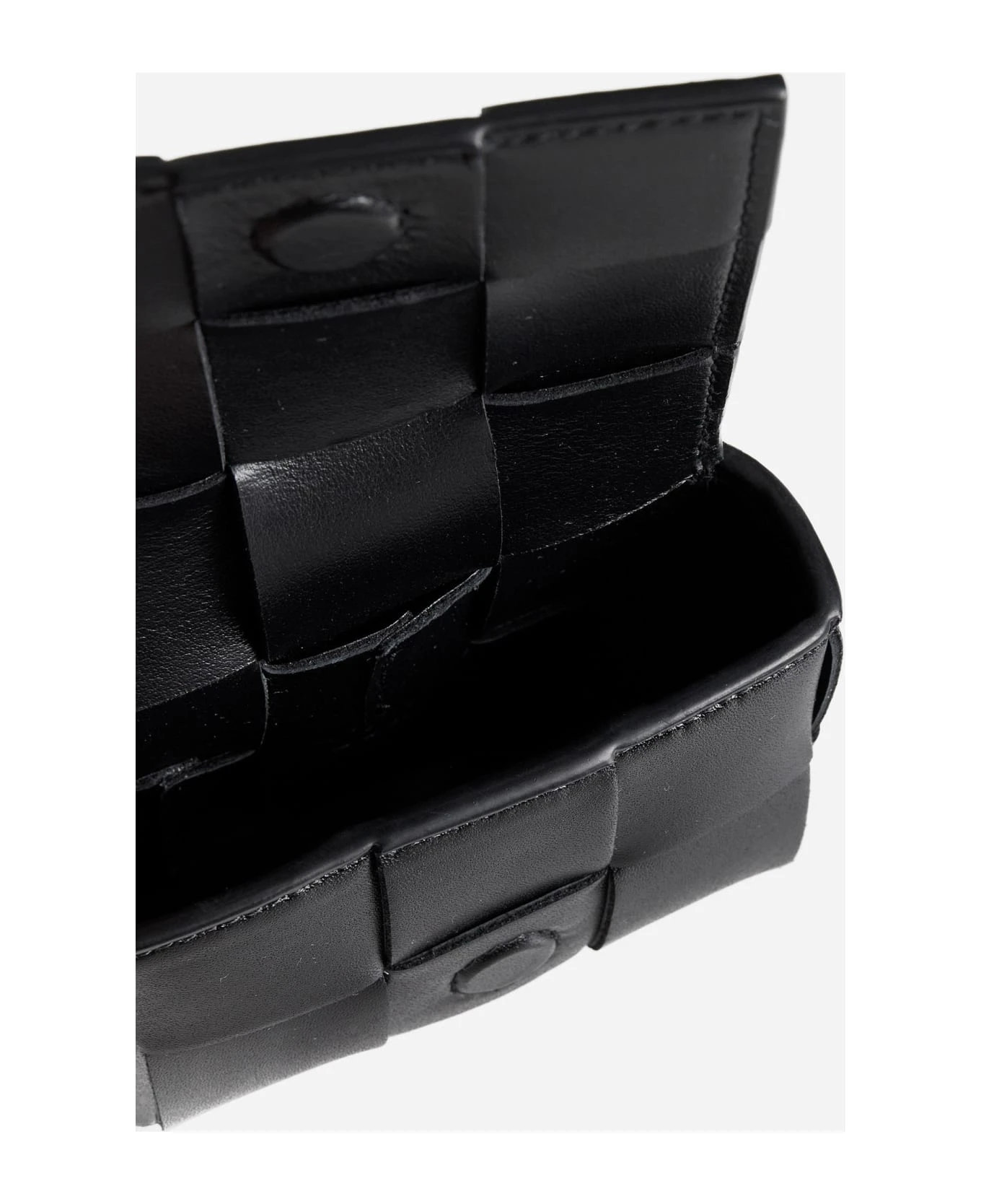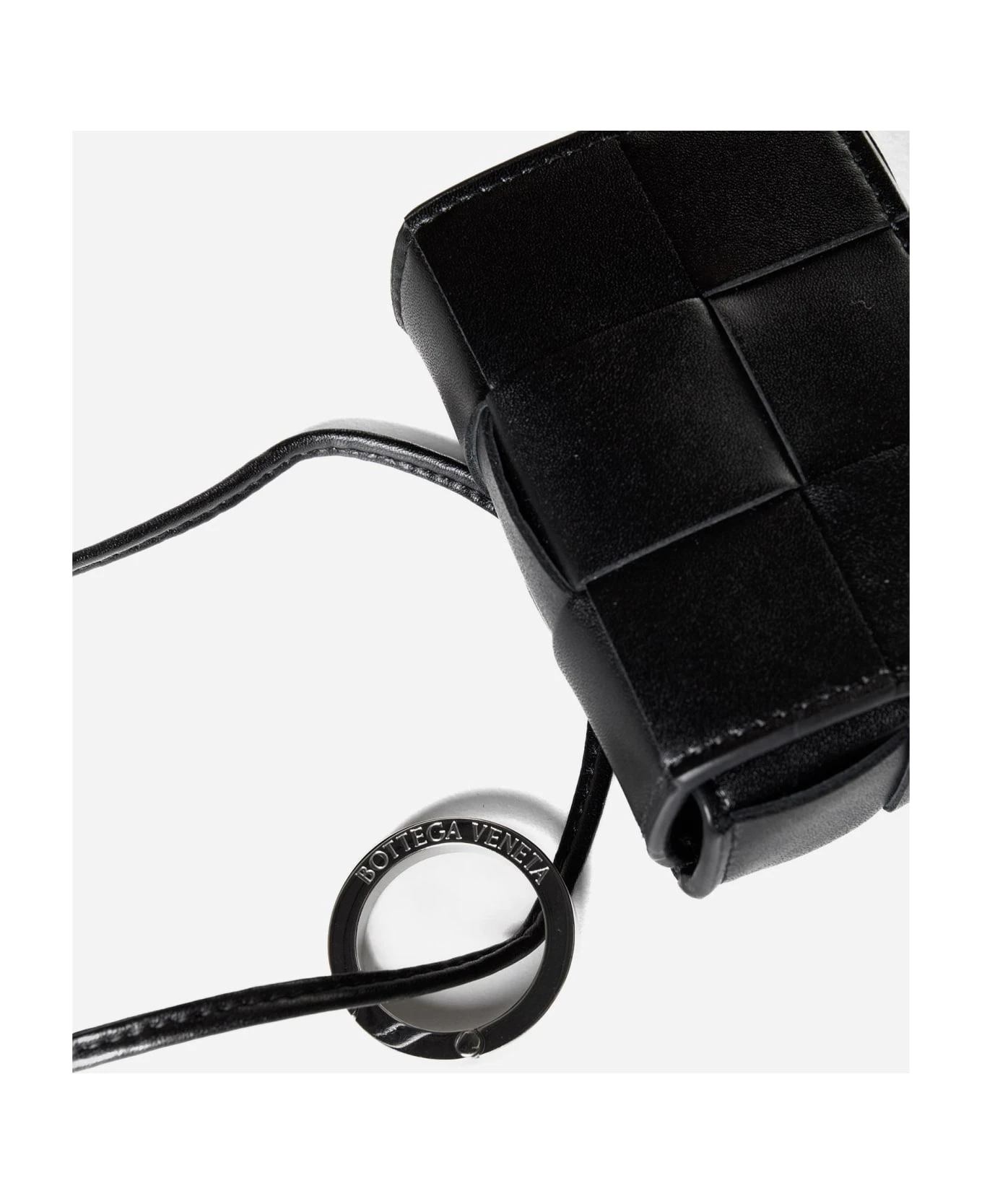 Bottega Veneta’s Cassette Airpods Case In Black Leather Featuring Intreccio Motif, Thin Shoulder Strap With Knot, Silver-tone Metal Ring With Embossed Logo And Concealed Magnetic Fastening.