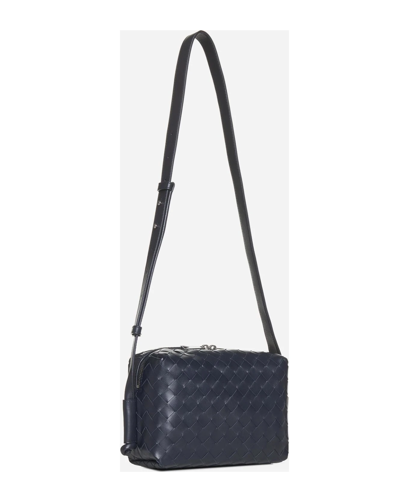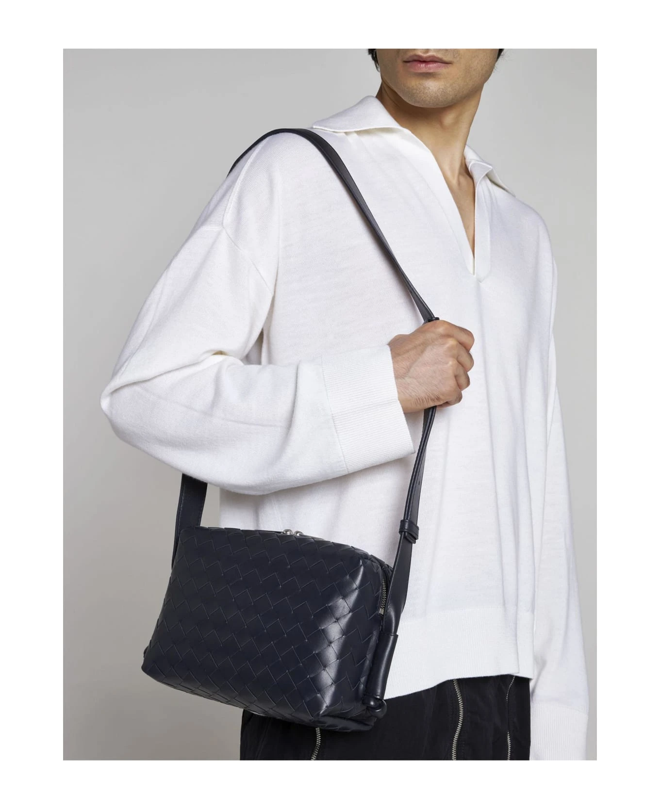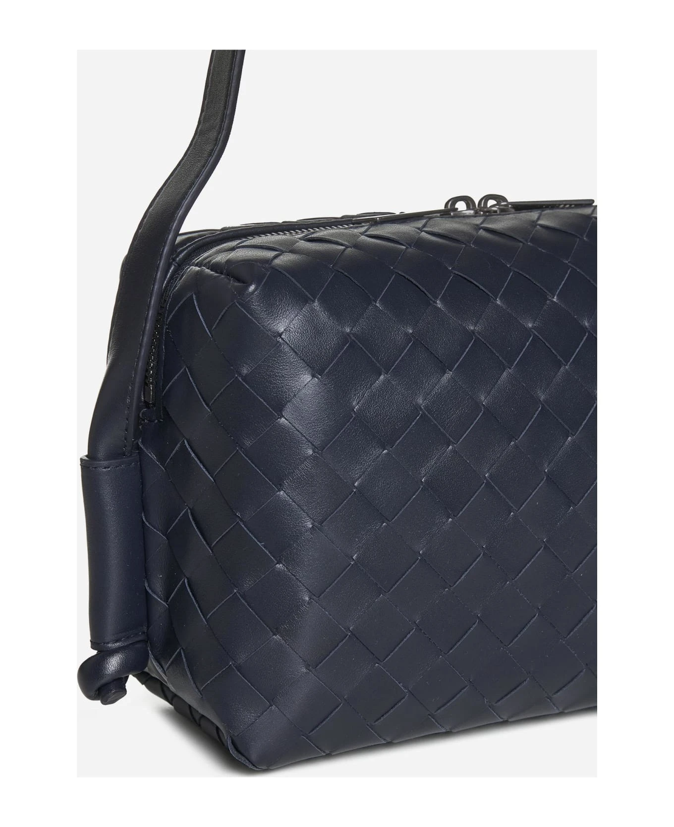 Bottega Veneta’s Loop dark blue leather bag featuring Intrecciato motif, adjustable shoulder strap with knots, double-slider zip fastening, beige canvas lining, internal flat pocket and silver-tone metal hardware.
