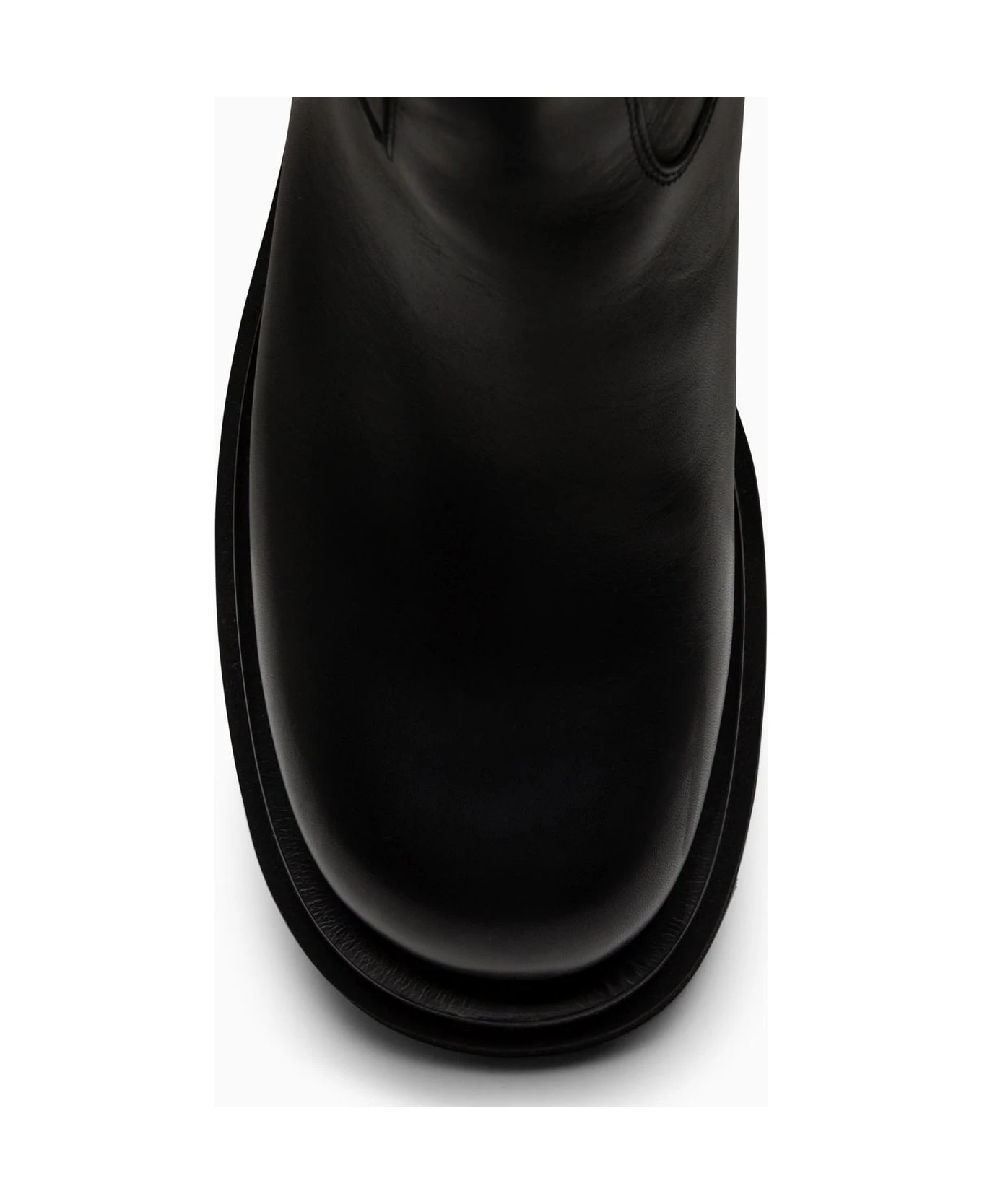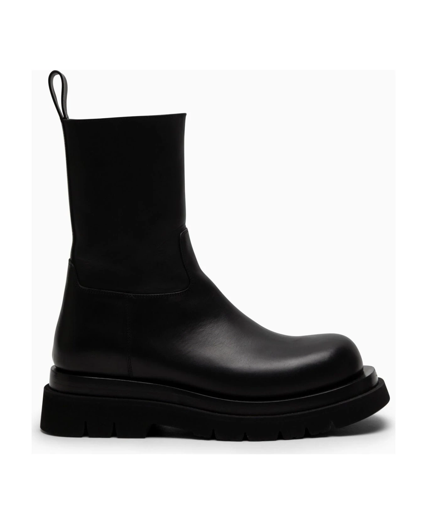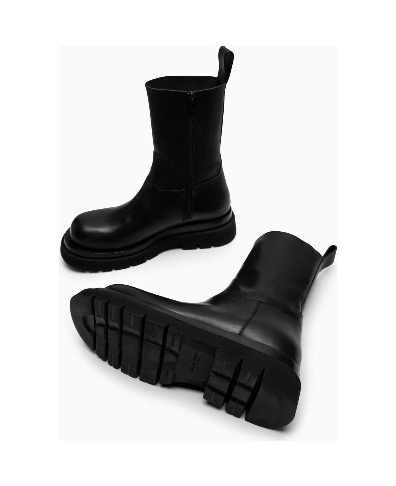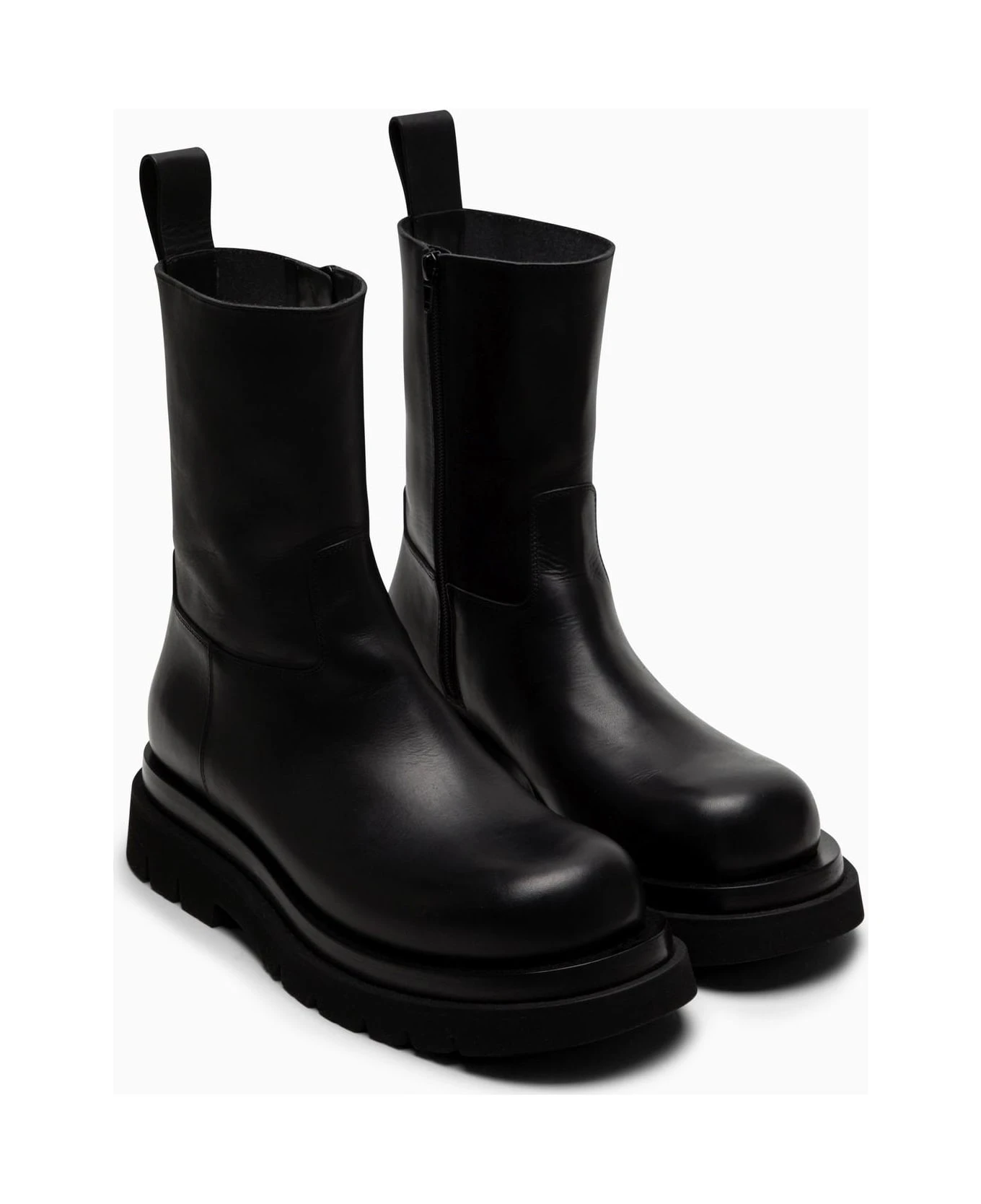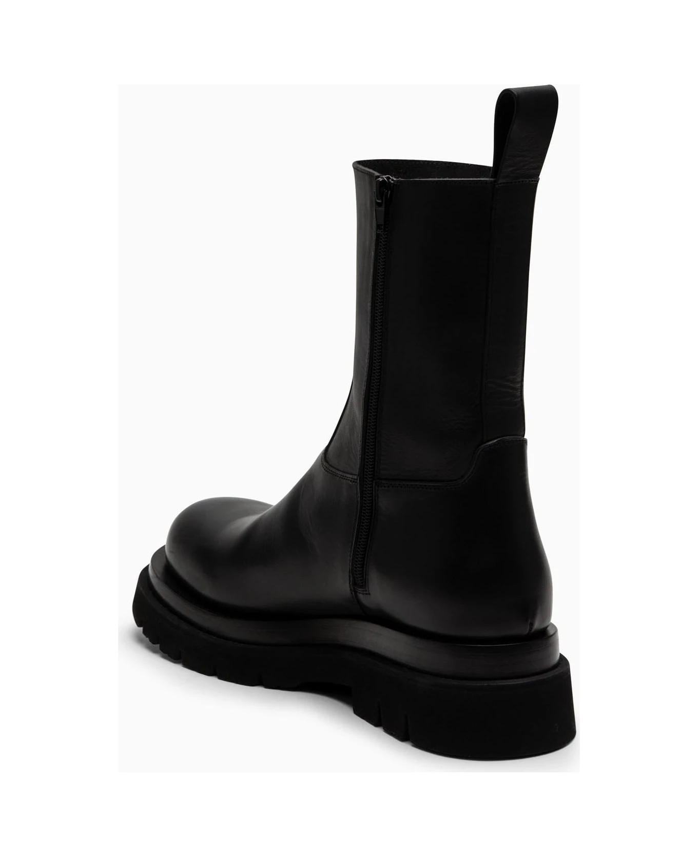 Black leather ankle boot from Bottega Veneta featuring a zip on the inside, a rounded toe and a rubber sole.