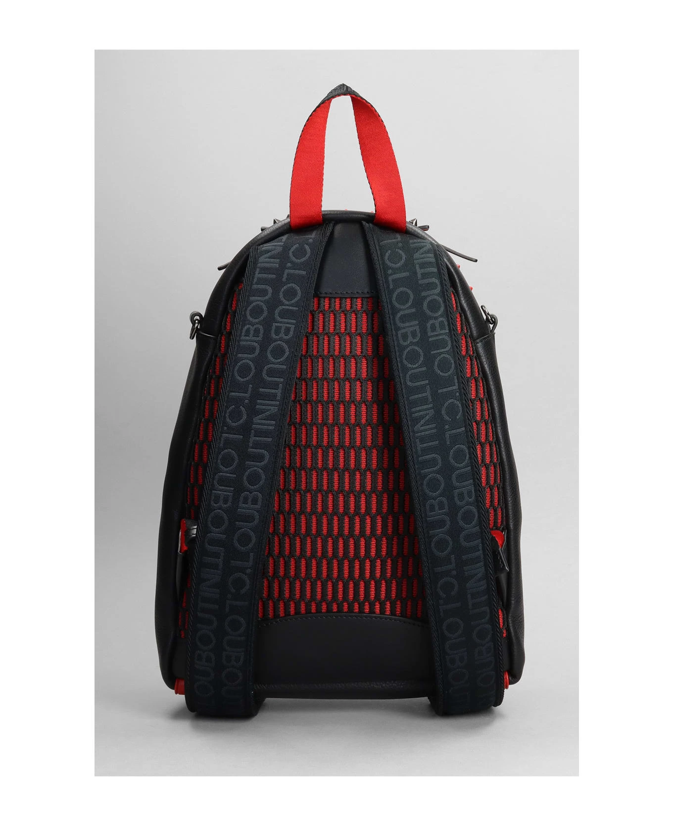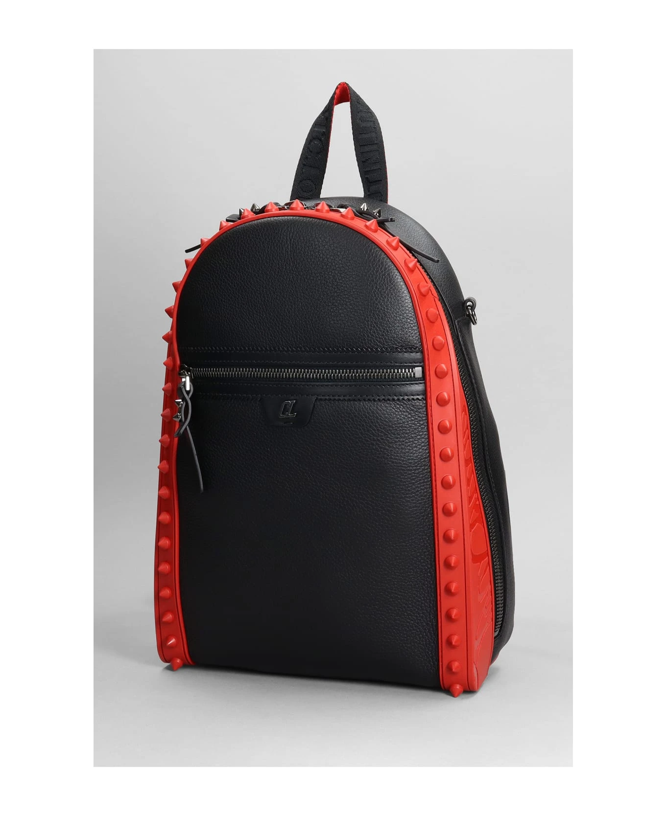 Backpack in black leather, Height 450 mm, Width 300 mm, handle, adjustable shoulder strap, double zip with leather sliders, frontal zip pocket, studs detail, metallic logo, internal pocket, Made in Italy