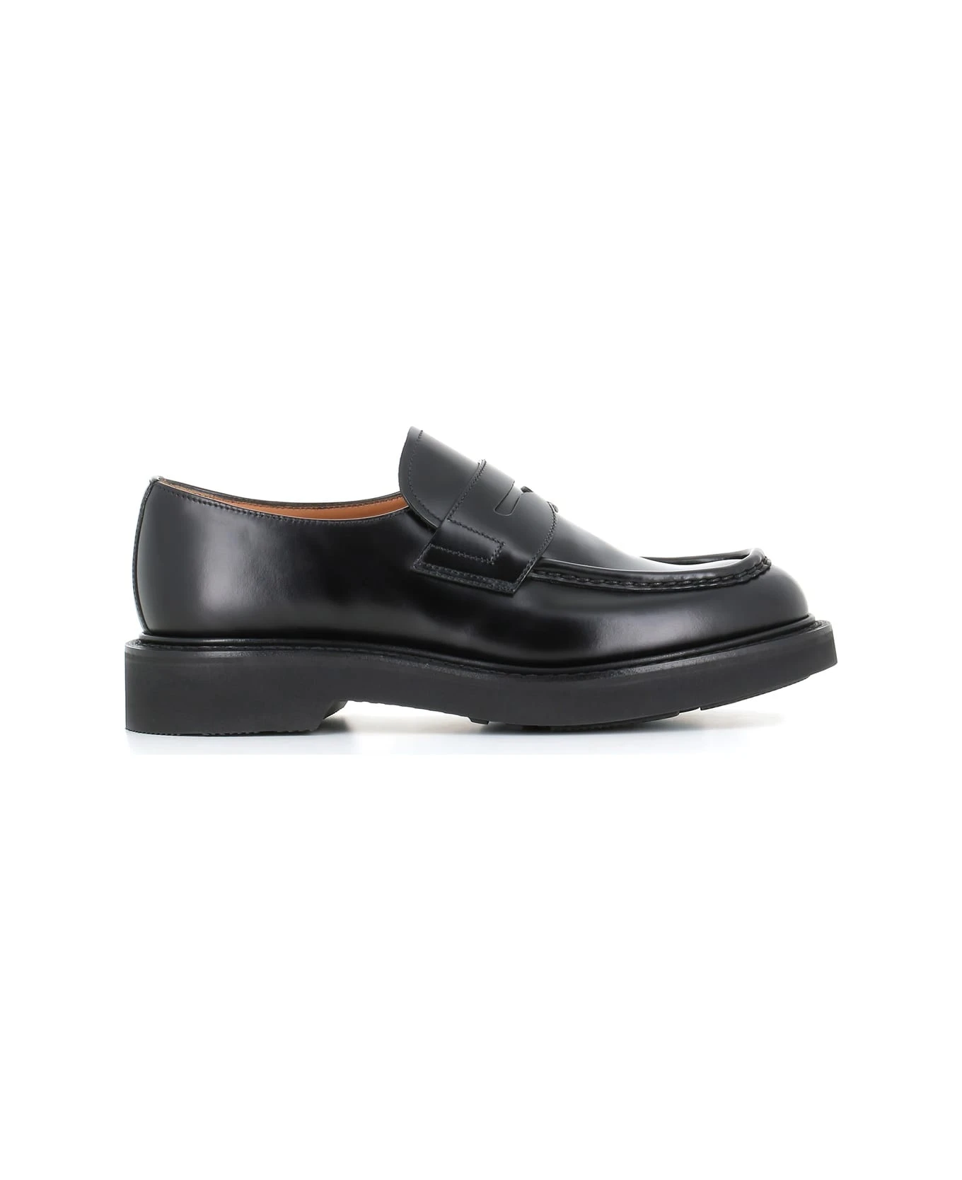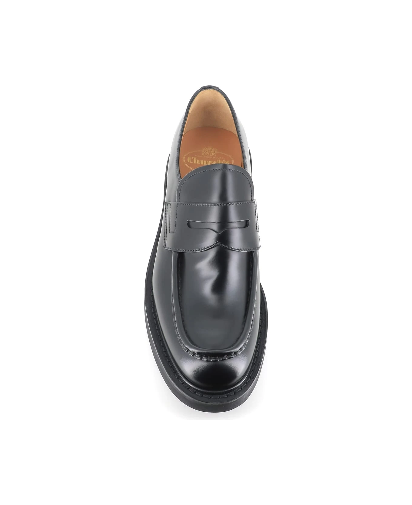 Black semi-glossy leather Loafer from Church’s, stitched and raised tub model, featuring by the internal elastic, the internal hem on the edge of the upper and the hand-dyed rainproof welt. Lightweight EVA sole. Lined interior with memory foam insole. Goodyear workmanship. Heel: 3,5 cm