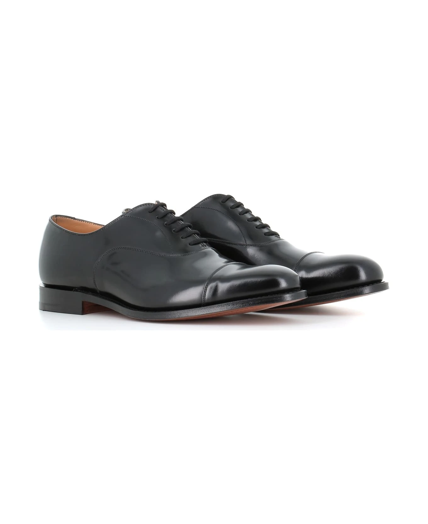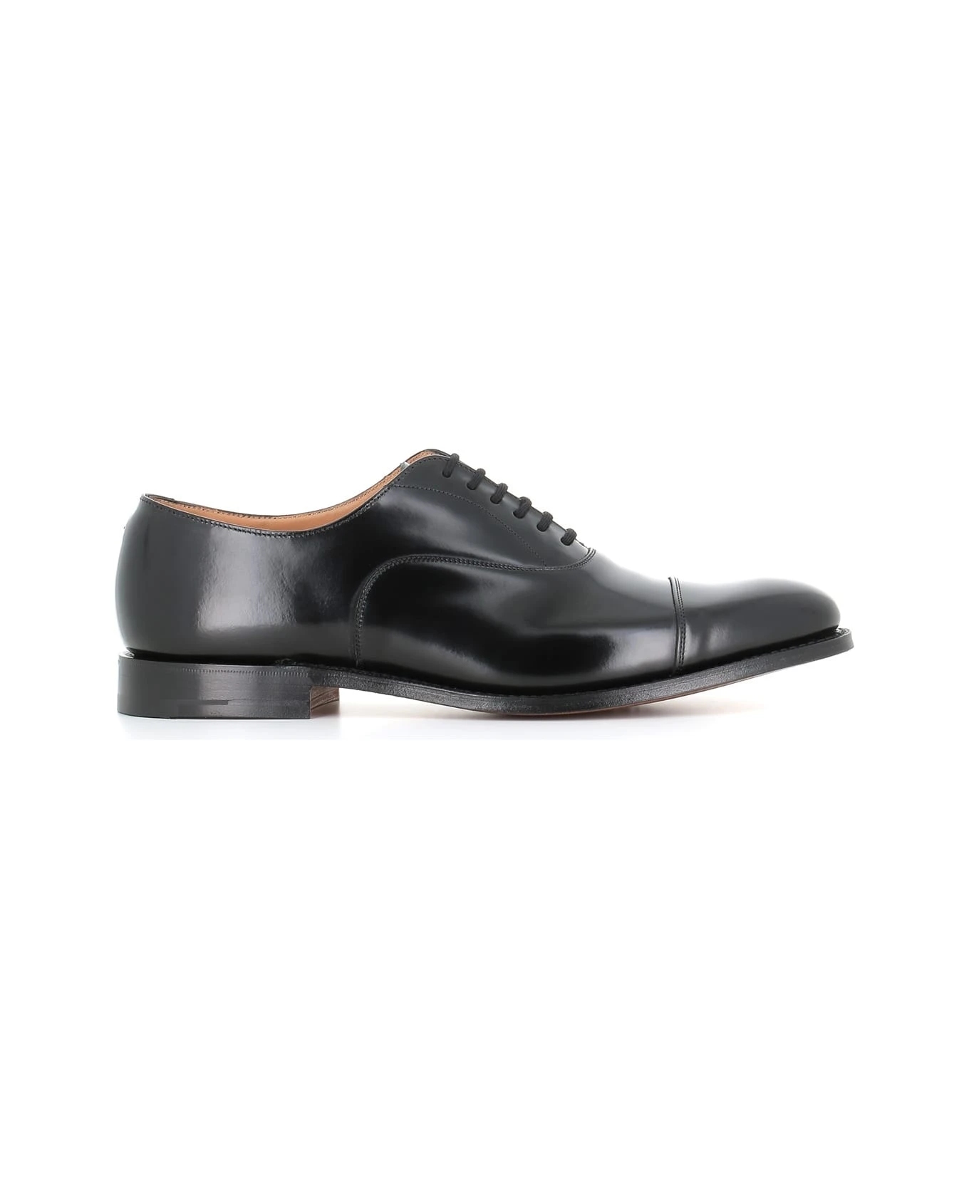 Black brushed leather Oxford shoes from Church’s, featuring a round toe, stitching details, a lace-up front fastening, a stacked heel and a leather sole. Heel: 2 cm Fit: G