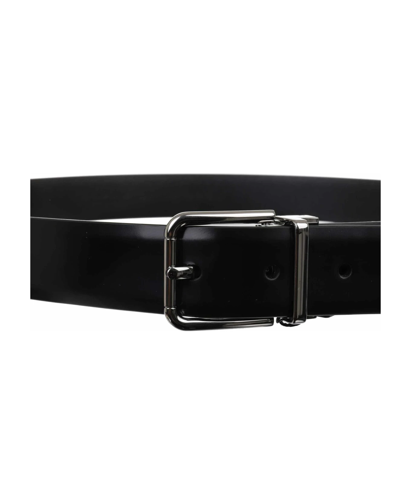 Black patent leather belt. Square silver buckle with logo. Pointed tip. 3 cm width. 100% calf leather