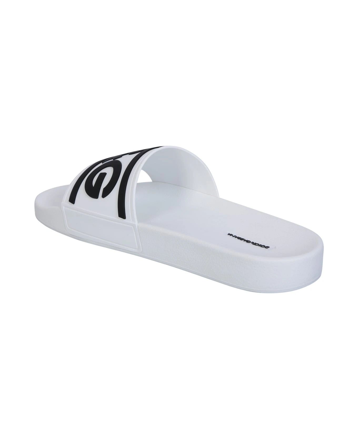 Roundtoe. Open toe. Slip-on style. Embossed logo to the front. Contrasting logo. Flat sole. Color: white/ black