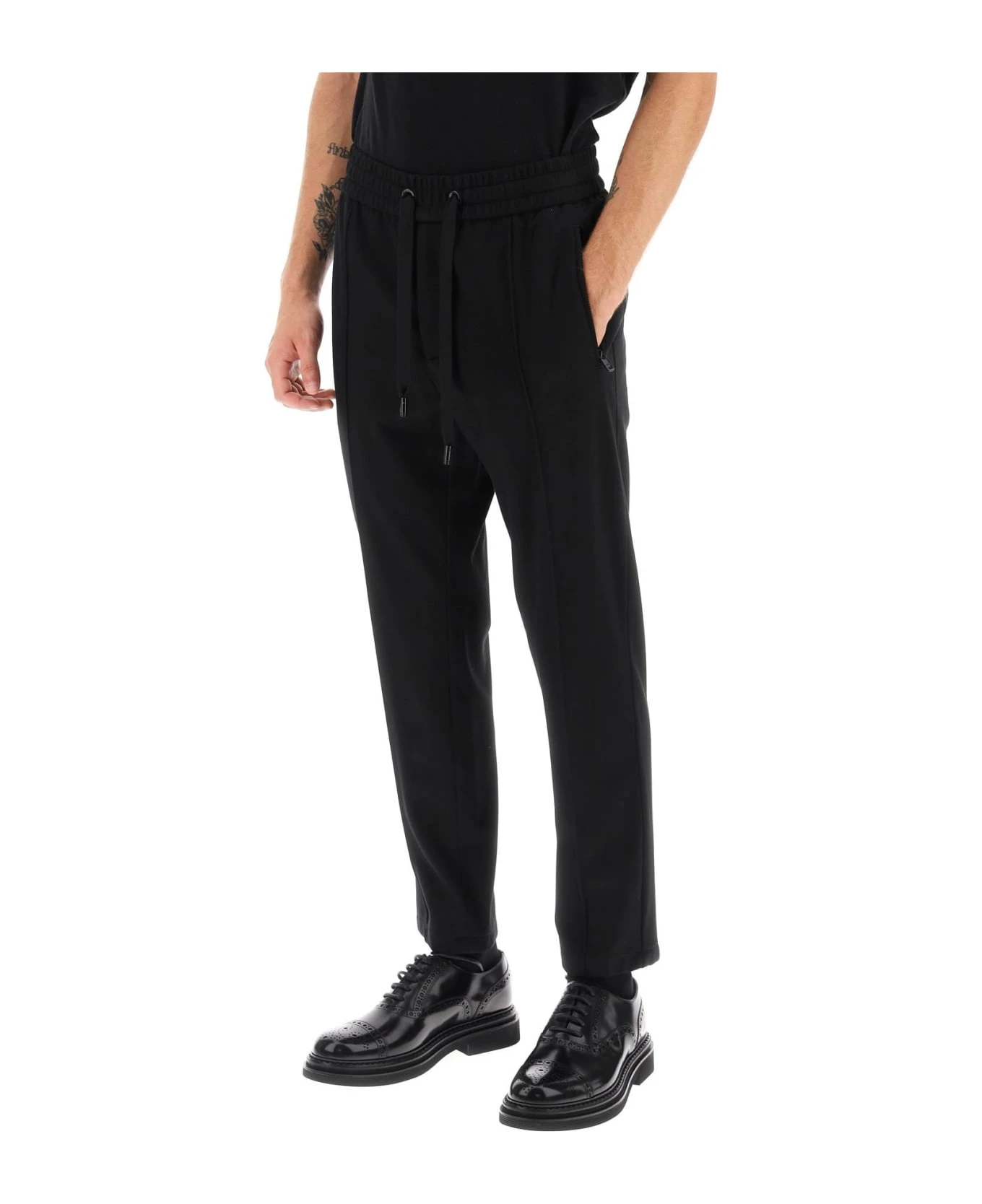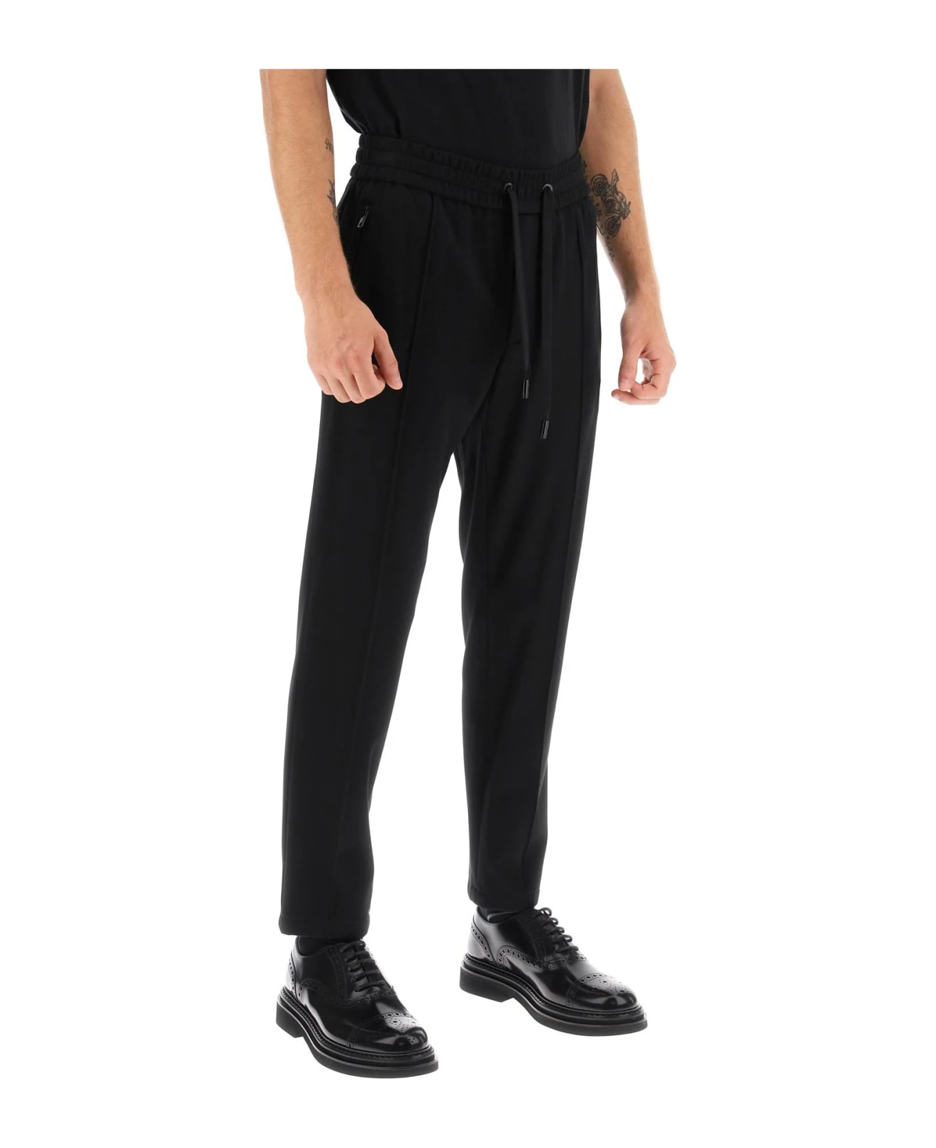 Dolce&Gabbana joggers crafted in viscose blend herringbone jersey. They feature elasticated waistband with drawstring and welt pockets with zipper on sides and back. Slim fit with tapered leg enhanced by pintucks. The model is 187 cm tall and wears size IT 48.