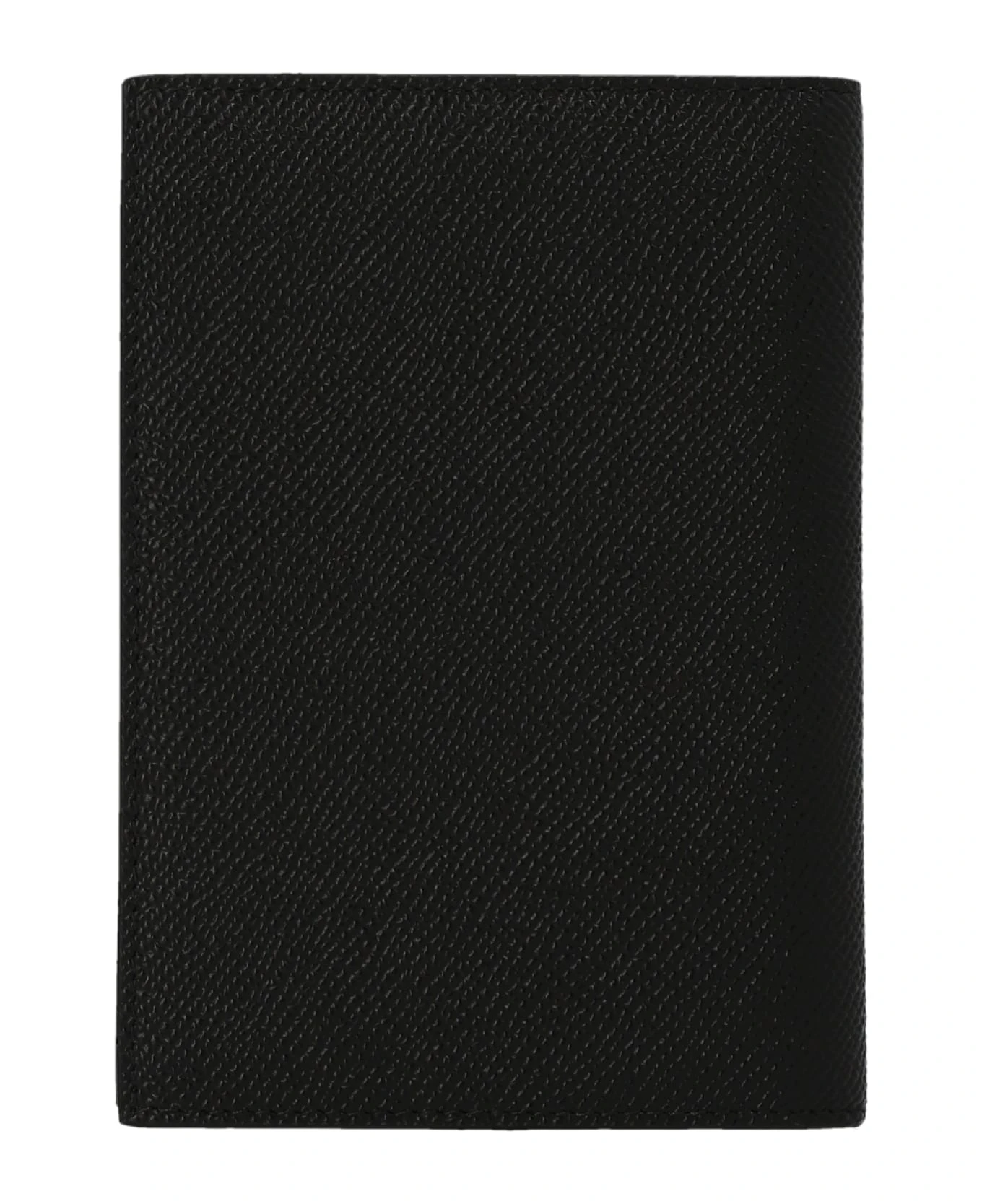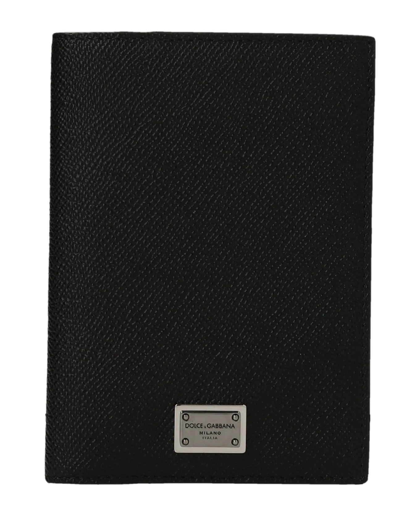 Leather passport holder with front logo plaque.