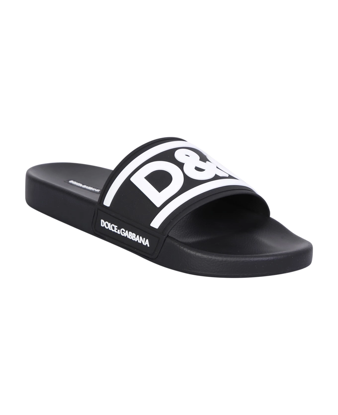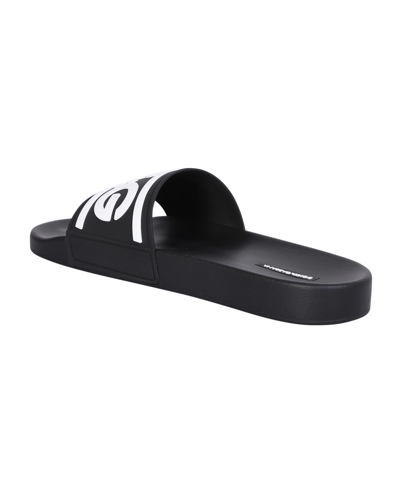Open toe. Logo print to the front. Logo print to the side. Flat rubber sole. Color: black