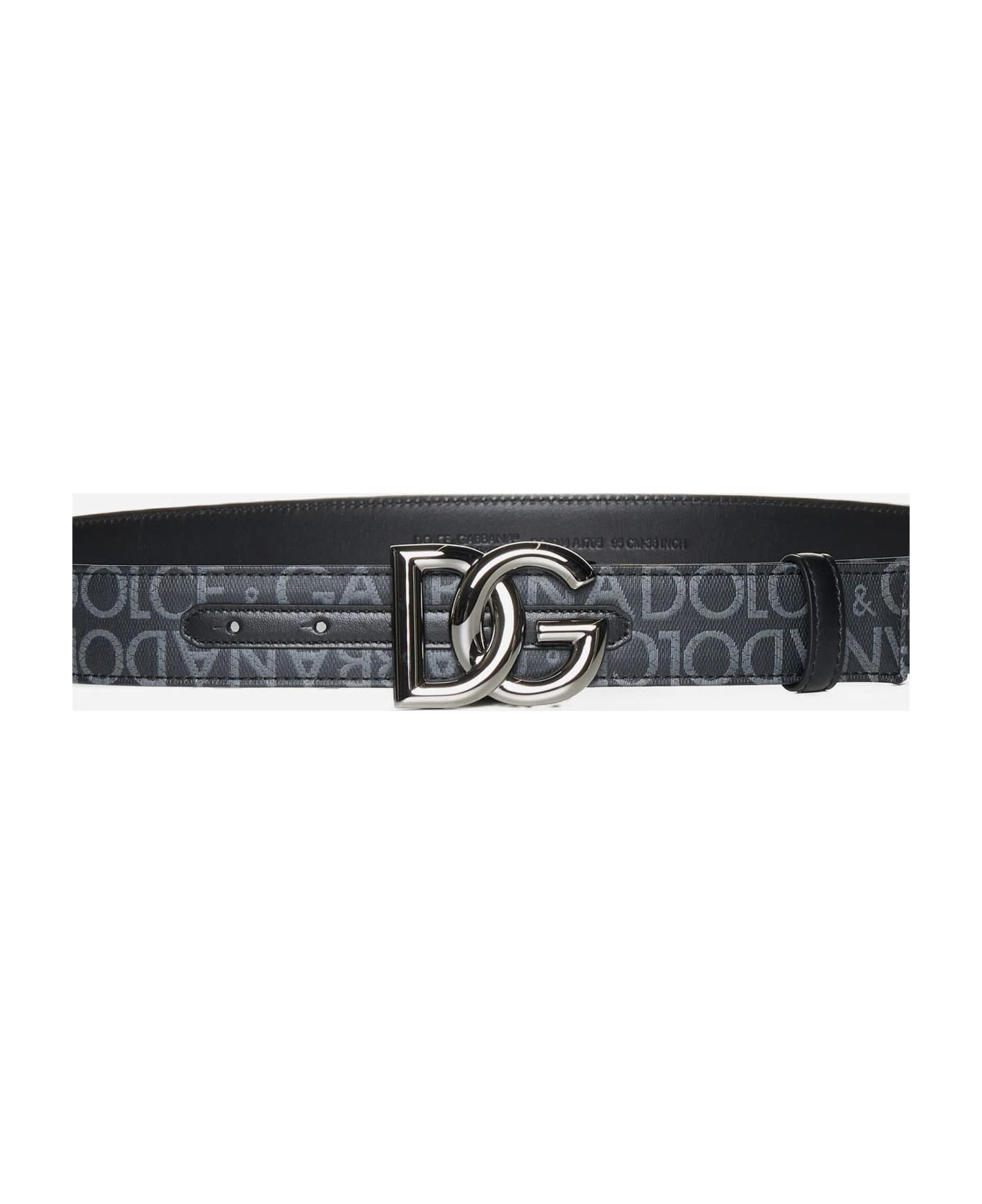 Dolce & Gabbana’s fabric belt featuring grey logo-tape motif on a black background, silver-tone DG logo plaque, black leather lining and loops.