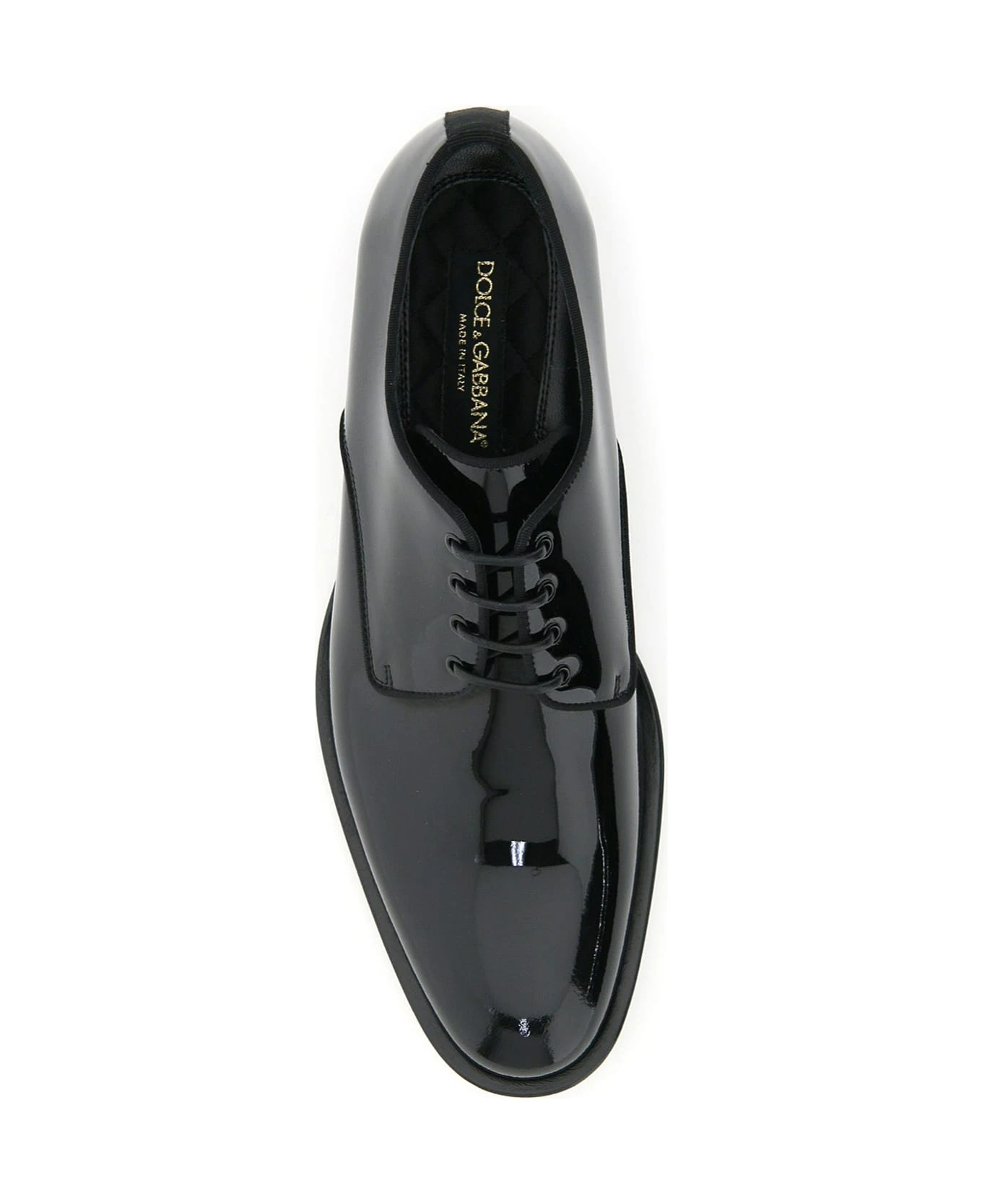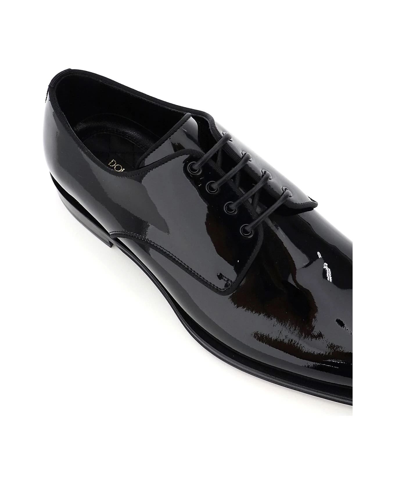Dolce & Gabbana patent Derby lace-ups with grosgrain hems and back detail. Leather and contrast quilted satin lining, leather sole. Extra laces included.